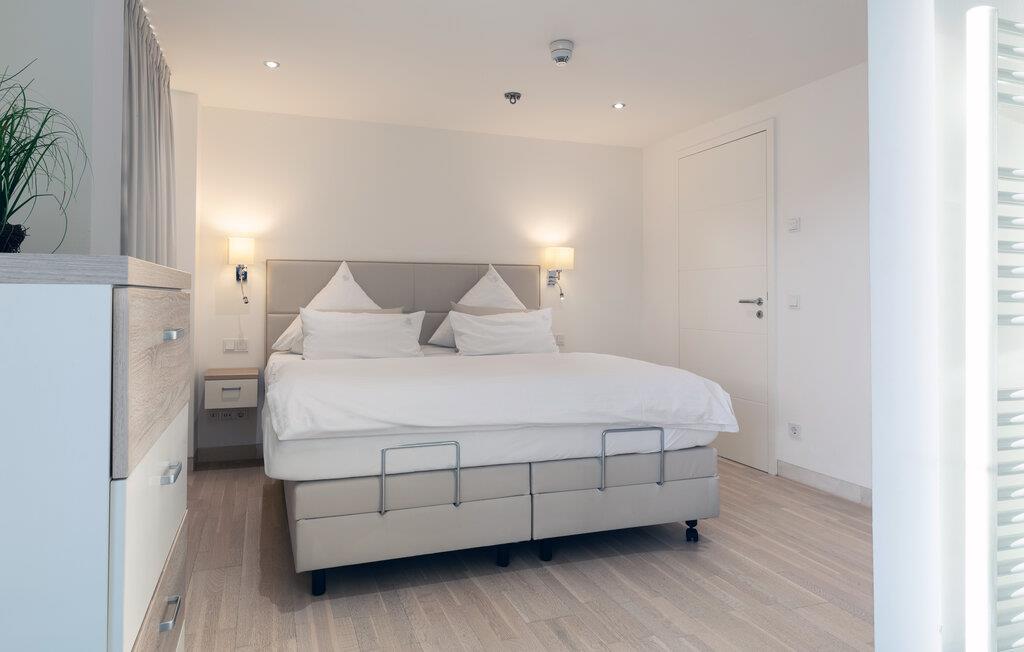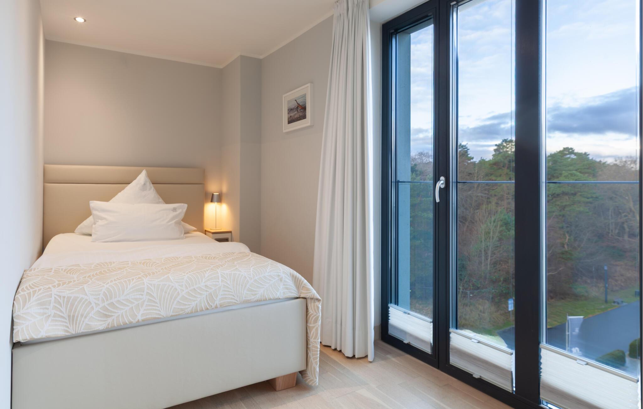 Denne ferielejlighed i Prora er særlig stor og rummelig. Det er også velegnet til feriegæster med begrænset mobilitet: alle værelser er tilgængelige uden dørtrin, sengene er elektrisk justerbare, dørene er 0,90 m brede, og badeværelset er udstyret med passende håndtag. Den er derfor kørestolsvenlig, men ikke fuldt tilgængelig for handicappede. Sofaen i opholdsstuen kan nemt omdannes til en ekstra soveplads med en soveflade på 1,60 x 2,00 m.