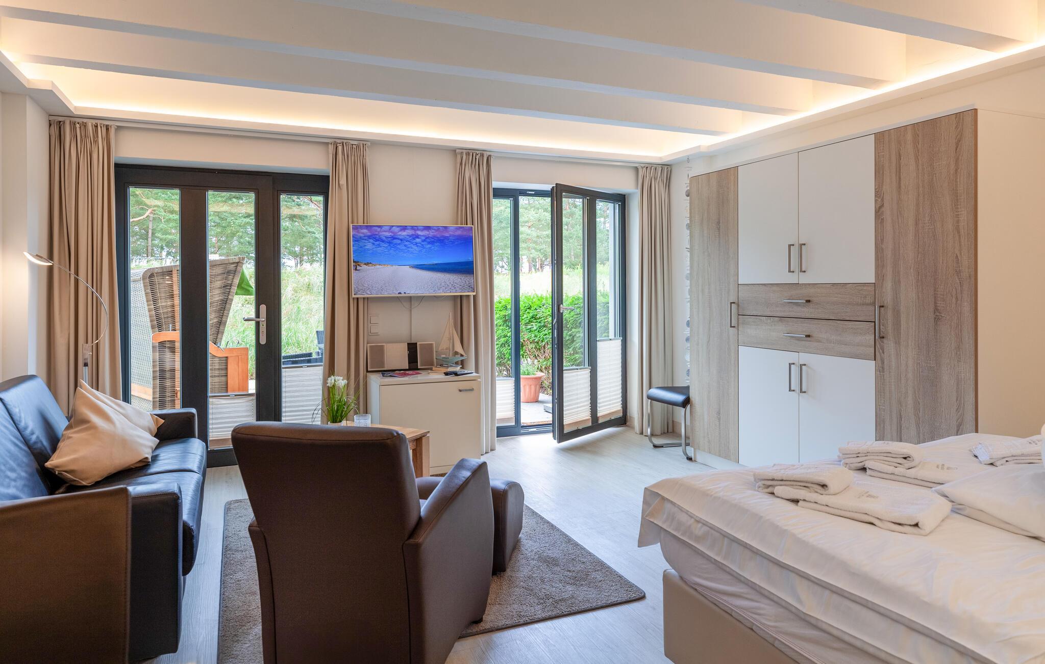 Den eksklusive etværelseslejlighed er det perfekte valg til en drømmedejlig ferie for to, på den skønne ferieø Rügen. Den lille lejlighed er raffineret indrettet, så her finder I alt hvad I behøver til en afslappet ferie: et praktisk køkkenhjørne samt spisebord, skønne boksmadrasser til at sove på og en hyggelig og lys stue og ikke mindst det bedste ved lejligheden: en skøn terrasse nær stranden (lejligheder i stuen) eller privat balkon med udsigt ud over haveanlægget, den smukke strandskov med krogede fyrretræer og bag den, den funklende Østersø (lejligheder på første sal).