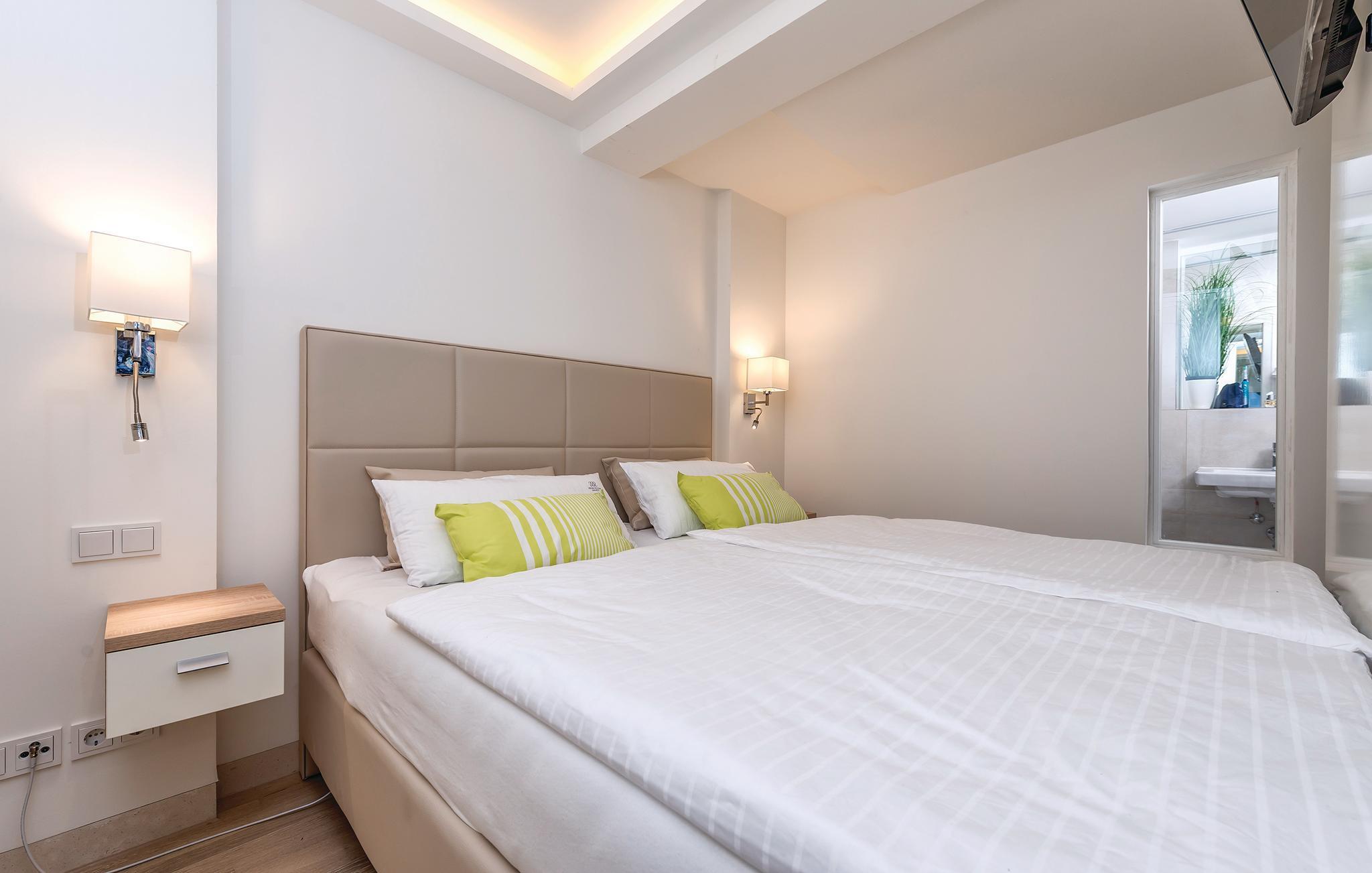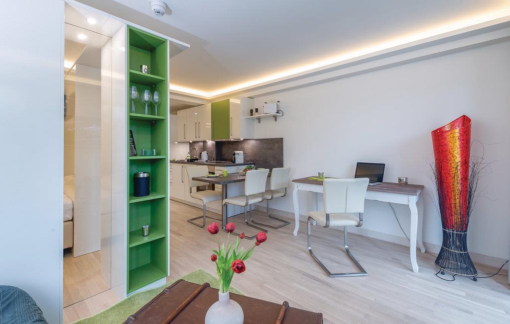 Denne lille lejlighed bliver udnyttet optimalt, så den byder på plads til fire personer. Soveområdet er adskilt fra stuen med skabe og har eget tv. Sofaen i stuen kan foldes ud til yderligere to komfortable sovepladser (sovesofa på 1,60 cm og dobbeltseng på 1,80 cm x 2 m). Fra altanen kan I nyde den herlige udsigt over Prora Solitaire og til Østersøen.