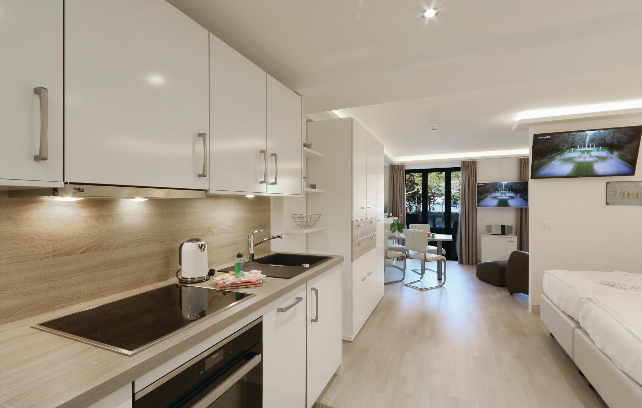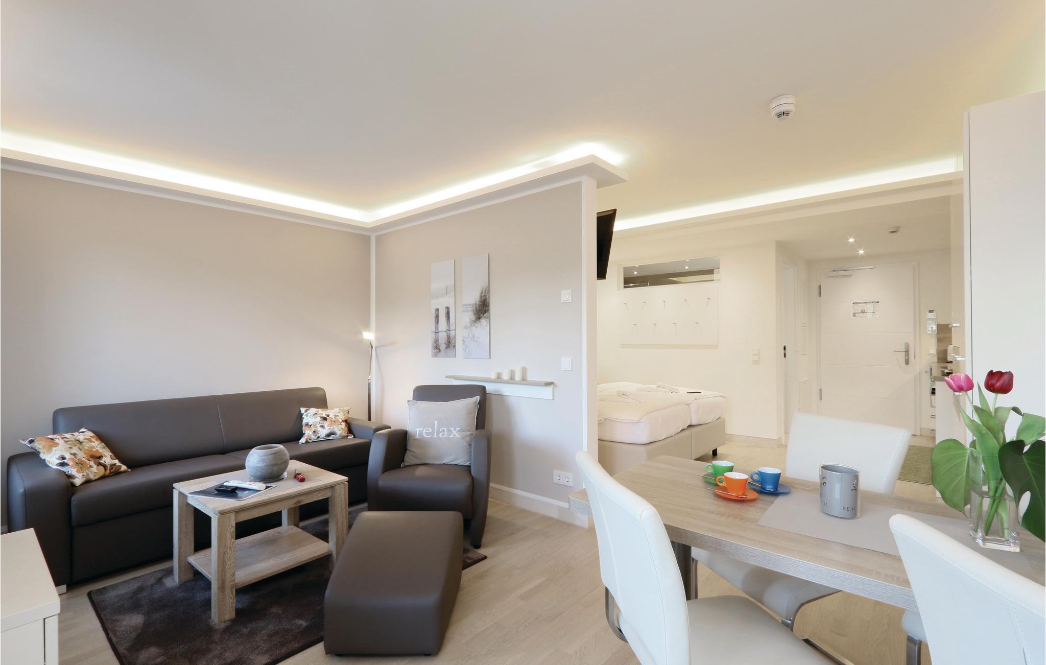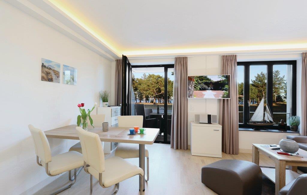 Den eksklusive etværelseslejlighed er det perfekte valg til en drømmedejlig ferie for to, på den skønne ferieø Rügen. Den lille lejlighed er raffineret indrettet, så her finder I alt hvad I behøver til en afslappet ferie: et praktisk køkkenhjørne med samt spisebord, skønne boksmadrasser til at sove på og en hyggelig og lys stue og ikke mindst det bedste ved lejligheden: en skøn terrasse nær stranden (lejligheder i stuen) eller privat balkon med udsigt ud over haveanlægget, den smukke strandskov med krogede fyrretræer og bag den, den funklende Østersø (lejligheder på første sal). Sofaen i stuen laves nemt om til to bekvemme sovemuligheder.