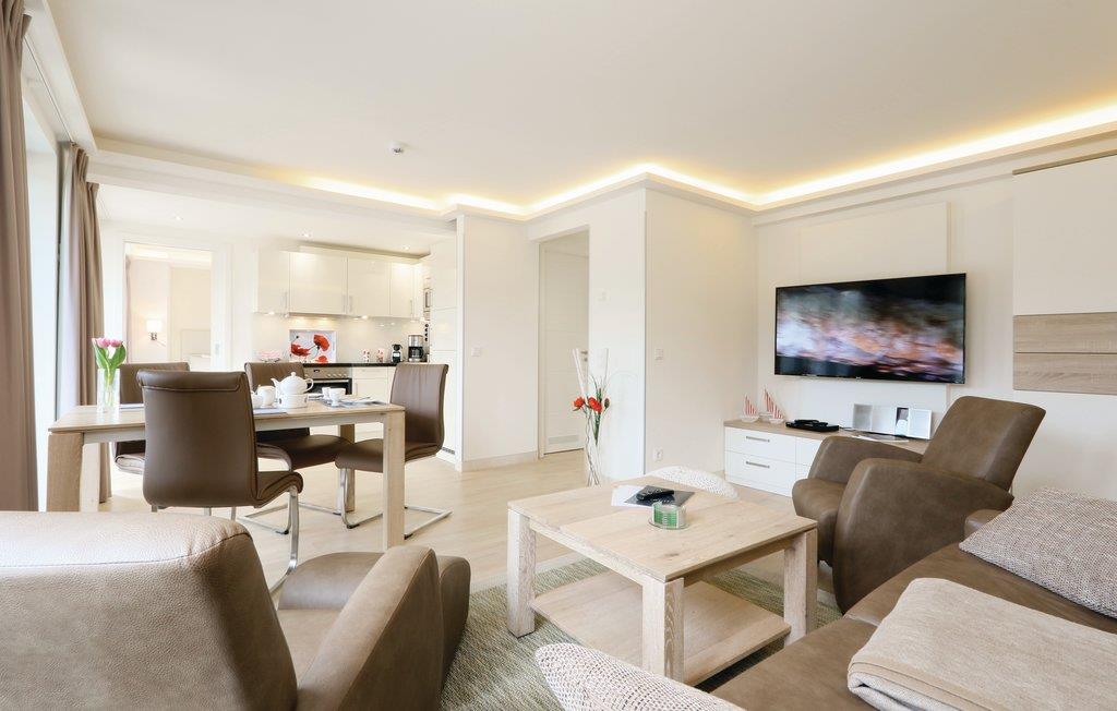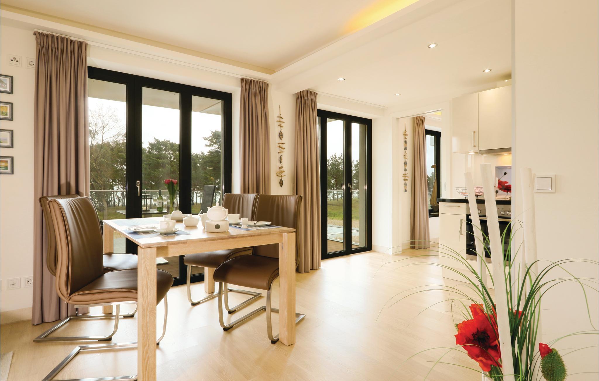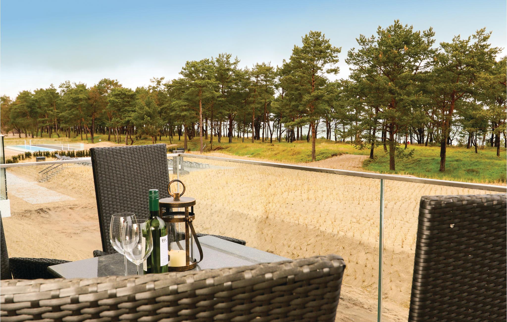 Fra den åbne meget lyse stue, er der udgang til jeres private 10 m² store balkon, hvorfra der er skøn udsigt over Østersøen. Sofaen forvandles nemt til to bekvemme sovepladser. Den moderne infrarøde sauna gør jeres ferielejlighed til en wellnessoase.