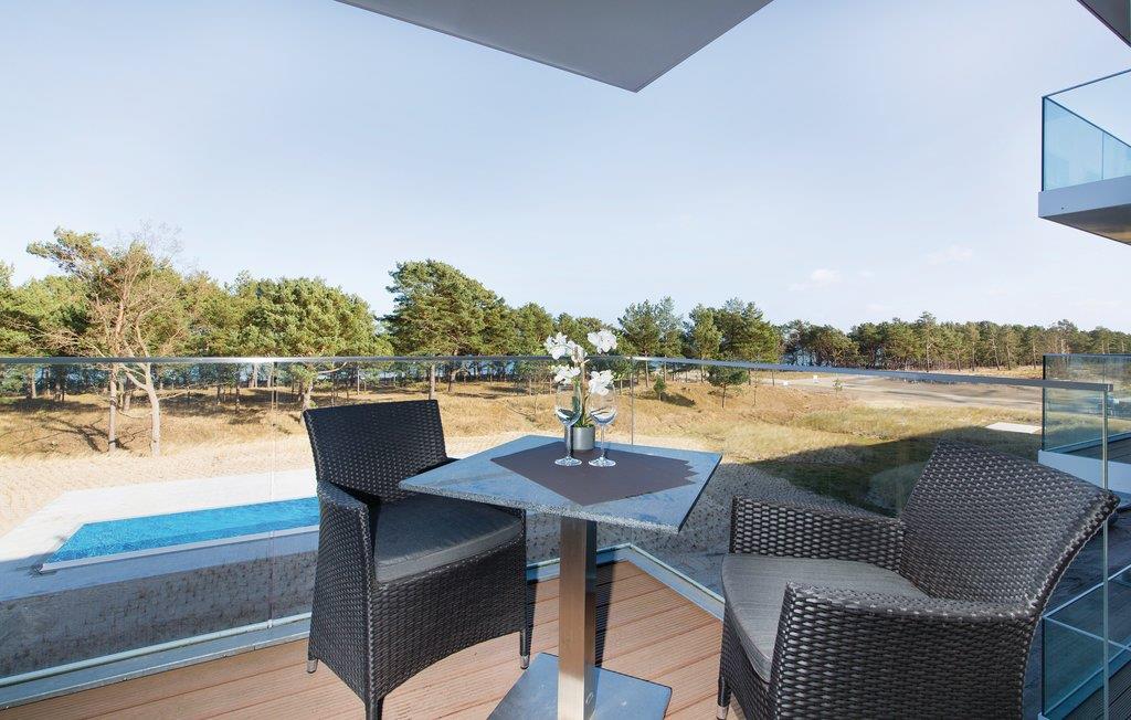 På 40 m² finder I alt til en afslappet og bekvem ferie. Fra de store vinduer i stuen, strømmer lyset ind, herfra kan udsigten over fyrreskoven og Østersøens blå vand nydes helt uhindret. Fra stuen er der udgang til altanen med bekvemme møbler. Ren afslapning. Det separate soveværelse er adskilt fra stuen med skydedør. Sofaen i stuen kan nemt forvandles til to ekstra sovepladser.