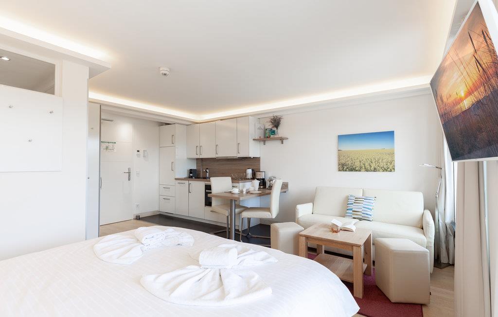Et af Tysklands største mindesmærker er blevet forvandlet til et sandt ferieparadis. Her finder I moderne lejligheder med flot design, lige ud til den forrygende 7 km lange strand ved Prorer Wiek, hvor kridtklipperne og det glasklare vand næsten skaber følelsen af at holde ferie nede sydpå. Langs strandpromenaden er der caféer, restauranter og små butikker til jeres daglige behov. Således kan I ikke kun slappe af på jeres private balkon med et glas vin, men også i husets egen Prora Solitaire Bar, hvor I kan drikke jeres morgenkaffe eller mødes til en drink efter en dejlig dag på stranden.