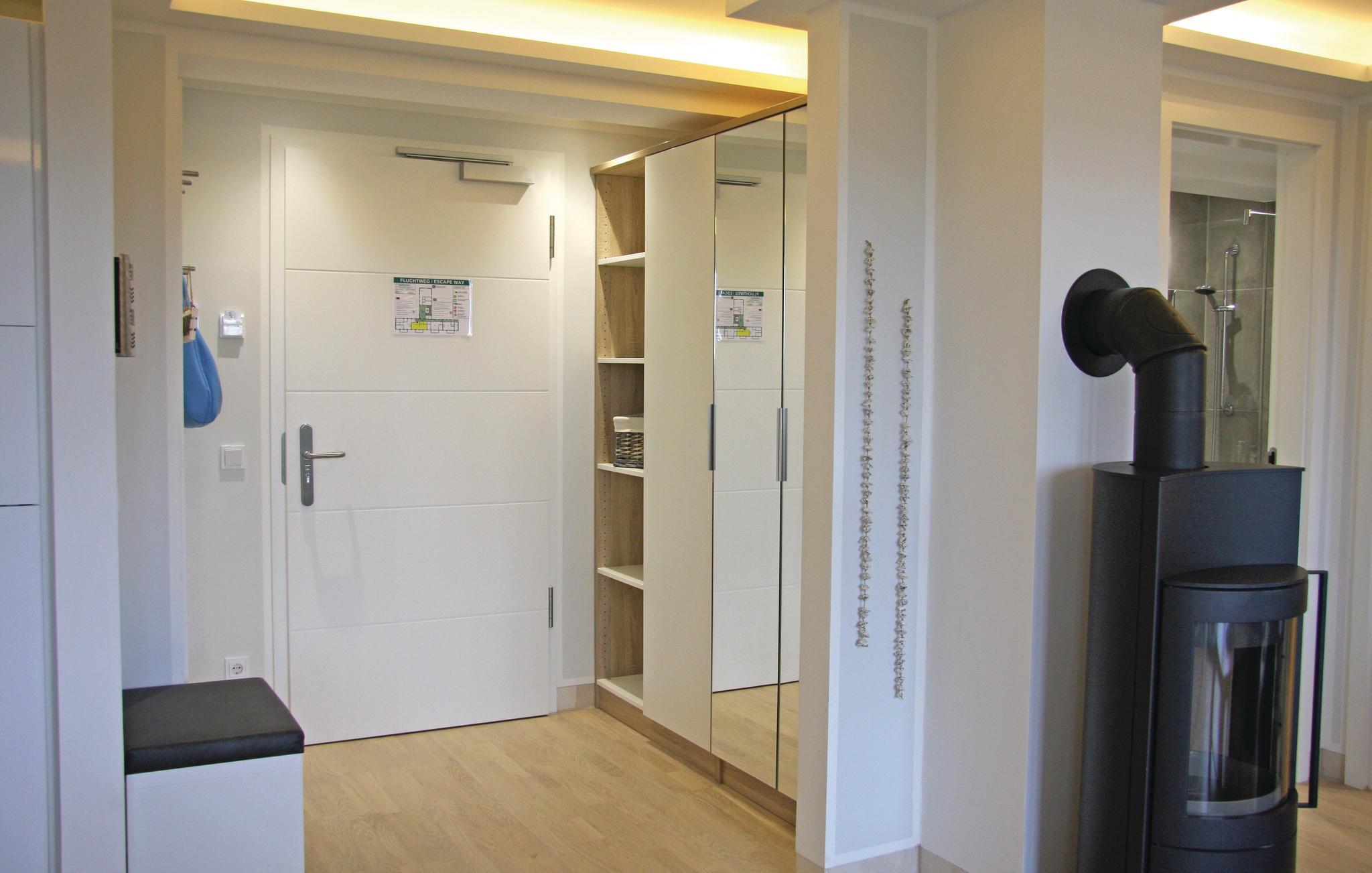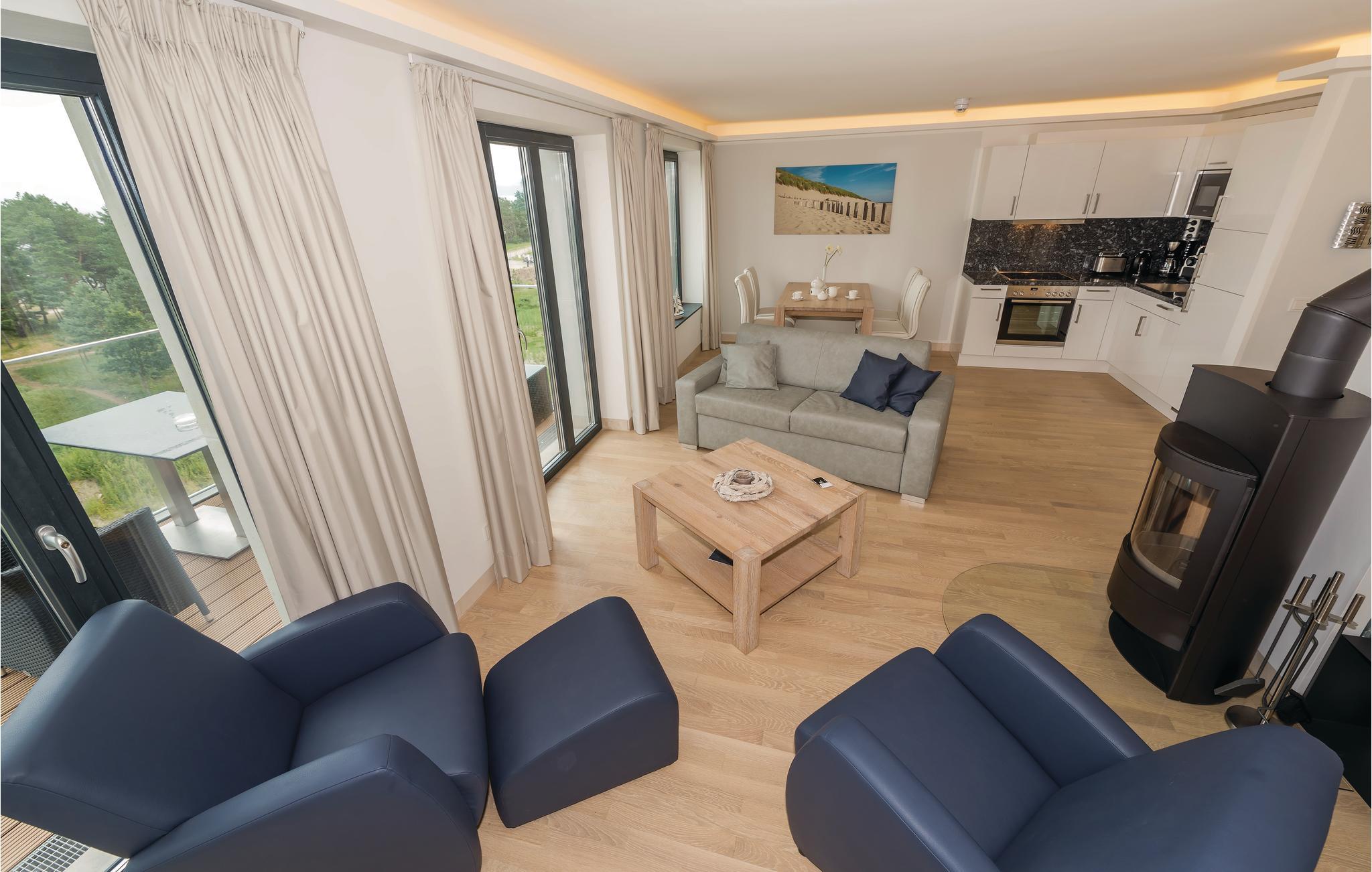 Fra den lyse, åbne stue, er der adgang til jeres private altan på ca. 10 m², hvorfra der er en betagende udsigt ud over den lille strandskov til Østersøen. Når I har gået en lange tur i den friske luft, så tænd op i kaminen i stuen og mærk varmen der hurtigt breder sig og skaber en særlig hygge. Naturligvis har I også kompleksets store wellnessområde i stueetagen med indendørs pool og flere saunaer til rådighed.