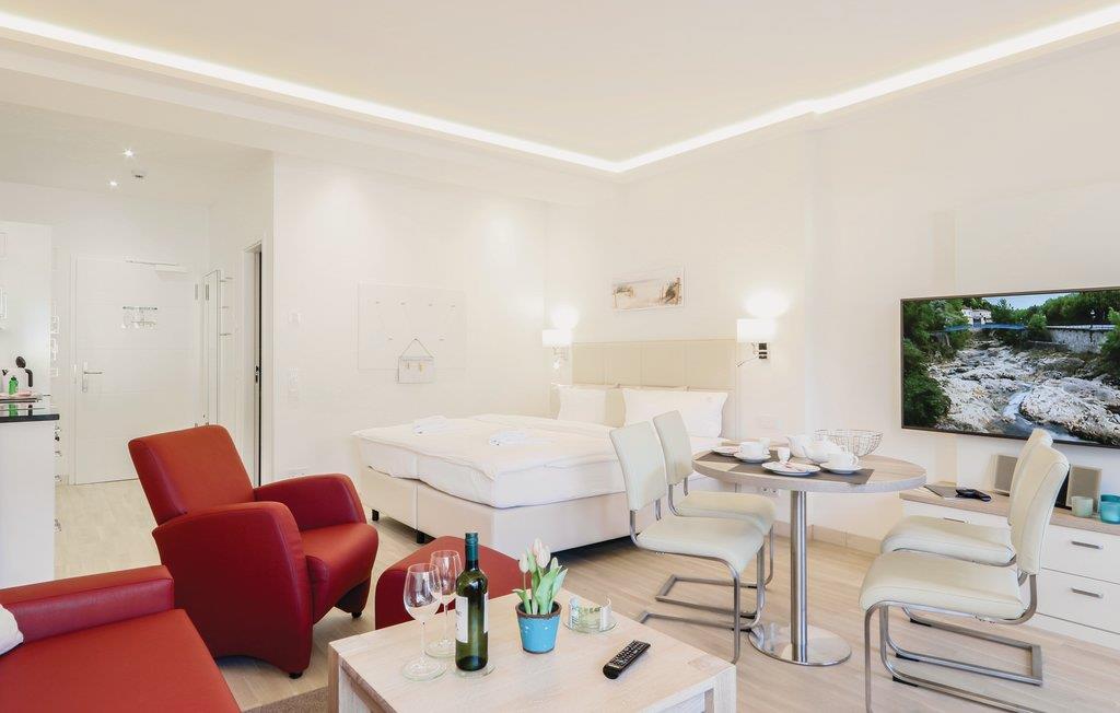 Denne eksklusive etværelseslejlighed er den perfekte bolig til en drømmeferie for to på den smukke ø Rügen. Lejligheden er raffineret indrettet, så I kan finde alt, som I har brug for på lidt plads: Det praktiske køkkenhjørne med spisebord, soveområde med boksmadras af høj kvalitet, et hyggeligt dagligområde og naturligvis lejlighedens highlight, jeres egen terasse.
