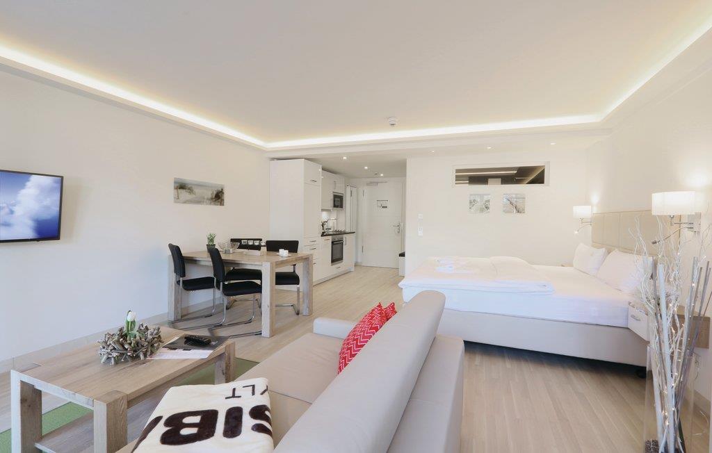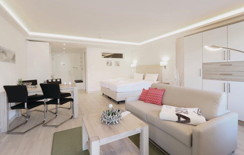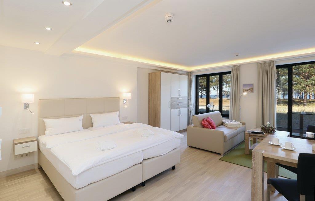 Denne eksklusive etværelseslejlighed er den perfekte bolig til en drømmeferie for to på den smukke ø Rügen. Lejligheden er raffineret indrettet, så I kan finde alt, som I har brug for på lidt plads: Det praktiske køkkenhjørne med spisebord, soveområde med boksmadras af høj kvalitet, et hyggeligt, lyst dagligområde og naturligvis lejlighedens highlight, jeres egen altan tæt på stranden.