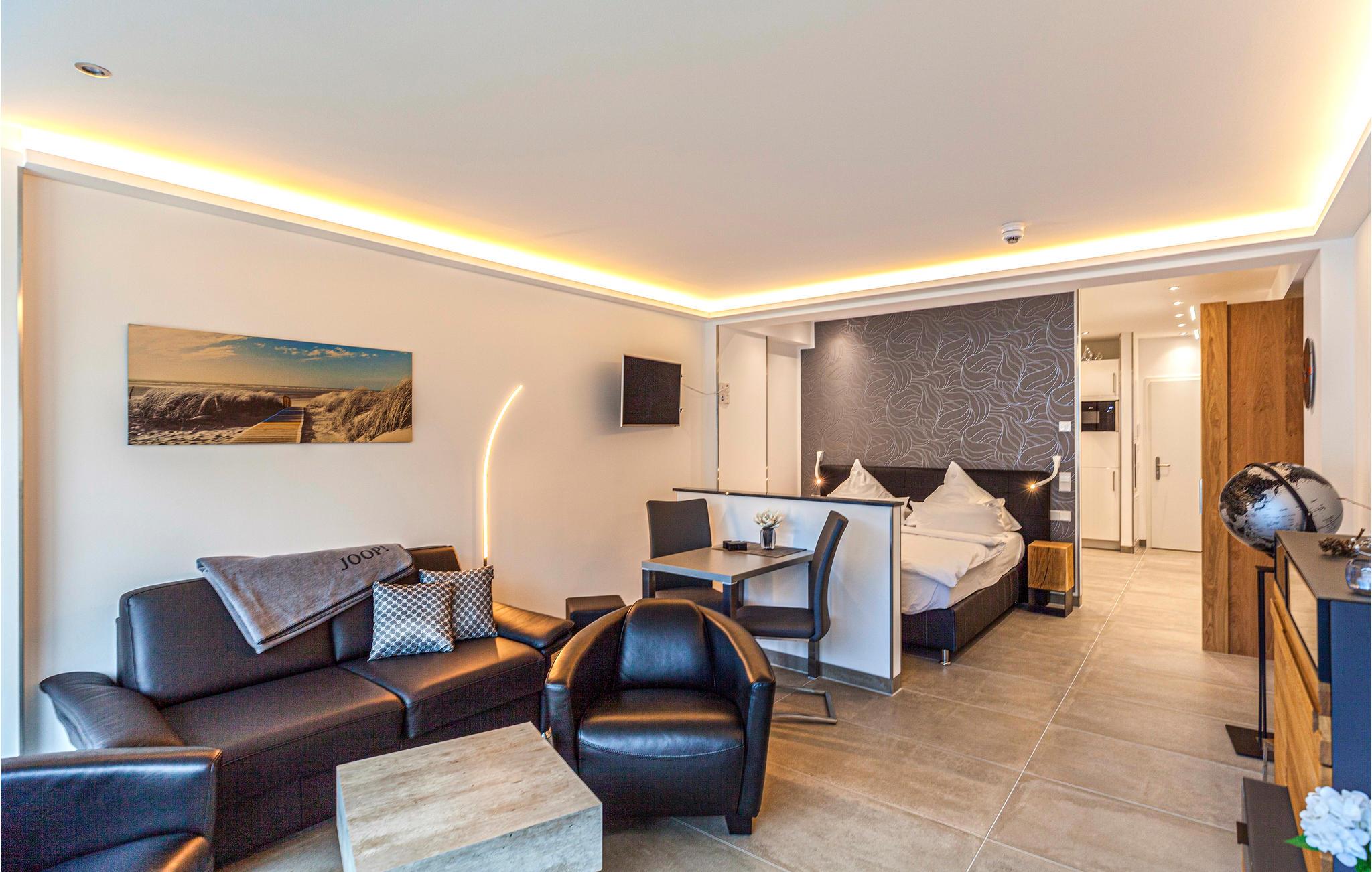 Det højkvalitets og allergivenlige "Panorama Studio" ligger i stueetagen og lige ud til siden af ??udendørspoolen. På terrassen kan I nyde morgenmad med udsigt over poolen og med lidt held endda høre havets brusen, mens I nyder de første solstråler. Etværelseslejligheden kombinerer søvn, madlavning og ophold i ét rum. Ud over den komfortable dobbeltseng er der en ekstra soveplads på sovesofaen. Tekøkkenet er af høj kvalitet og fuldt udstyret, så I ikke mangler noget på jeres ferie. Der er opvaskemaskine, fryser og kaffemaskine. Kaffeelskere vil sætte pris på den ekstra Nespresso-maskine (medbring venligst jeres egne kapsler).