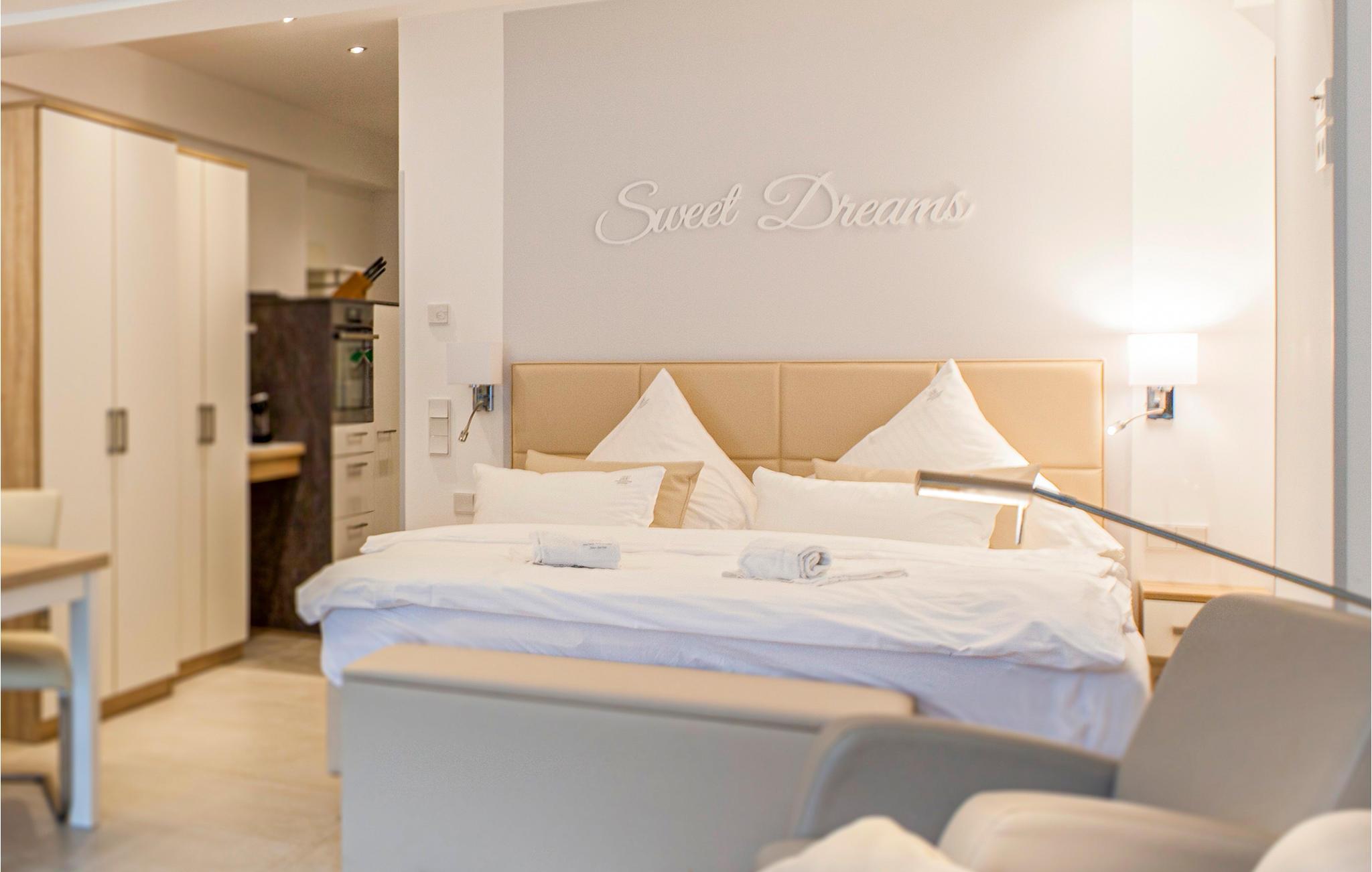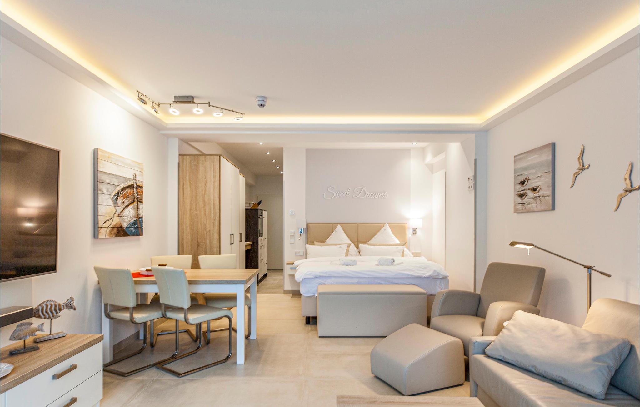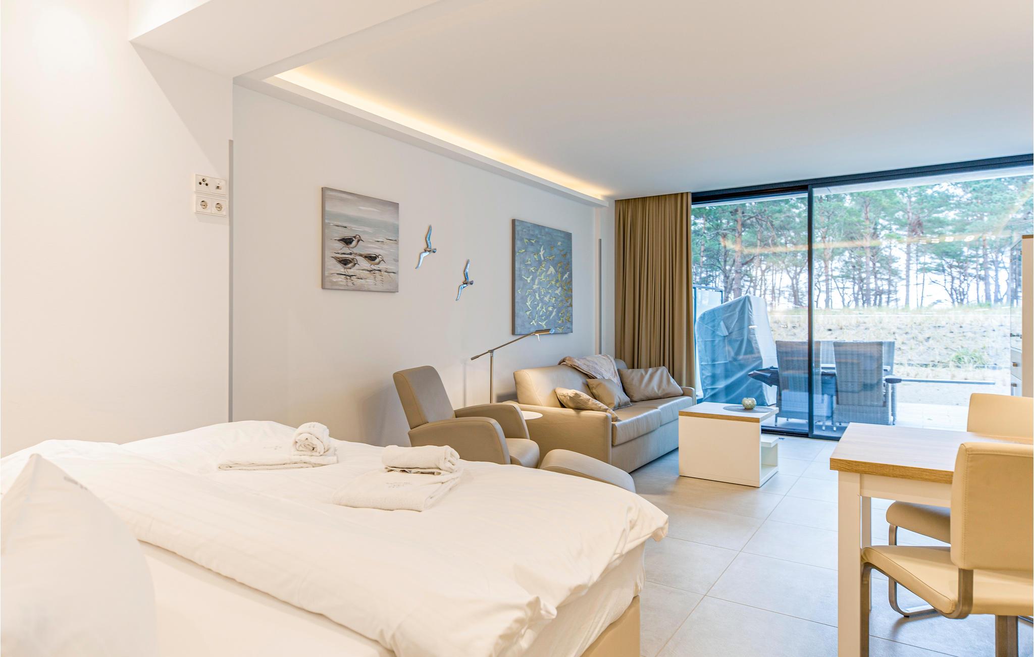 Det højkvalitets og allergivenlige "Panorama Studio" ligger i stueetagen og lige ud til siden af ??udendørspoolen. På terrassen kan I nyde morgenmad med udsigt over poolen og med lidt held endda høre havets brusen, mens I nyder de første solstråler. Etværelseslejligheden kombinerer søvn, madlavning og ophold i ét rum. Ud over den komfortable dobbeltseng er der en ekstra soveplads på sovesofaen. Tekøkkenet er af høj kvalitet og fuldt udstyret, så I ikke mangler noget på jeres ferie. Der er opvaskemaskine, fryser og kaffemaskine. Kaffeelskere vil sætte pris på den ekstra Nespresso-maskine (medbring venligst jeres egne kapsler).