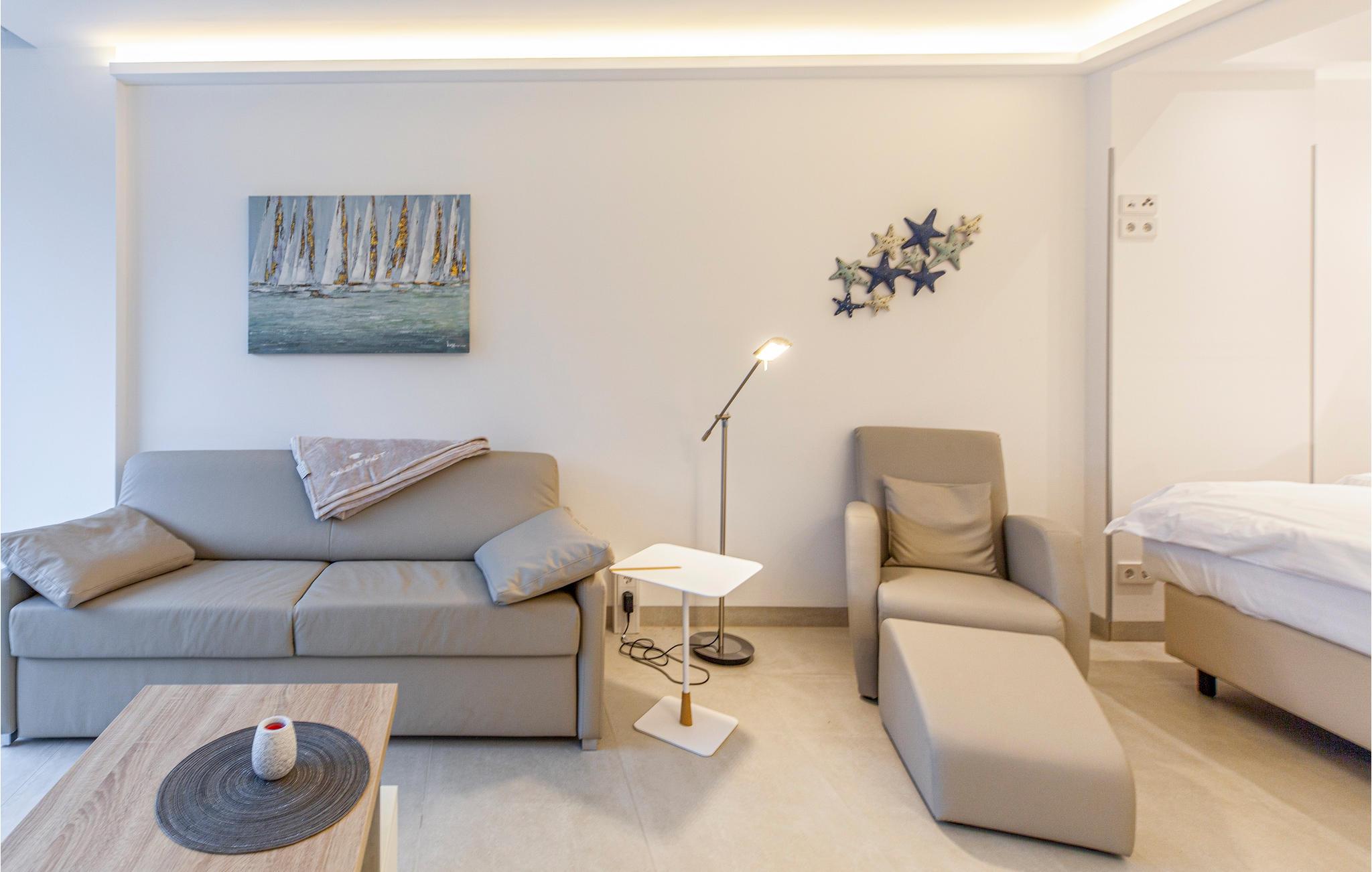 Det højkvalitets og allergivenlige "Panorama Studio" ligger i stueetagen og lige ud til siden af ??udendørspoolen. På terrassen kan I nyde morgenmad med udsigt over poolen og med lidt held endda høre havets brusen, mens I nyder de første solstråler. Etværelseslejligheden kombinerer søvn, madlavning og ophold i ét rum. Ud over den komfortable dobbeltseng er der en ekstra soveplads på sovesofaen. Tekøkkenet er af høj kvalitet og fuldt udstyret, så I ikke mangler noget på jeres ferie. Der er opvaskemaskine, fryser og kaffemaskine. Kaffeelskere vil sætte pris på den ekstra Nespresso-maskine (medbring venligst jeres egne kapsler).