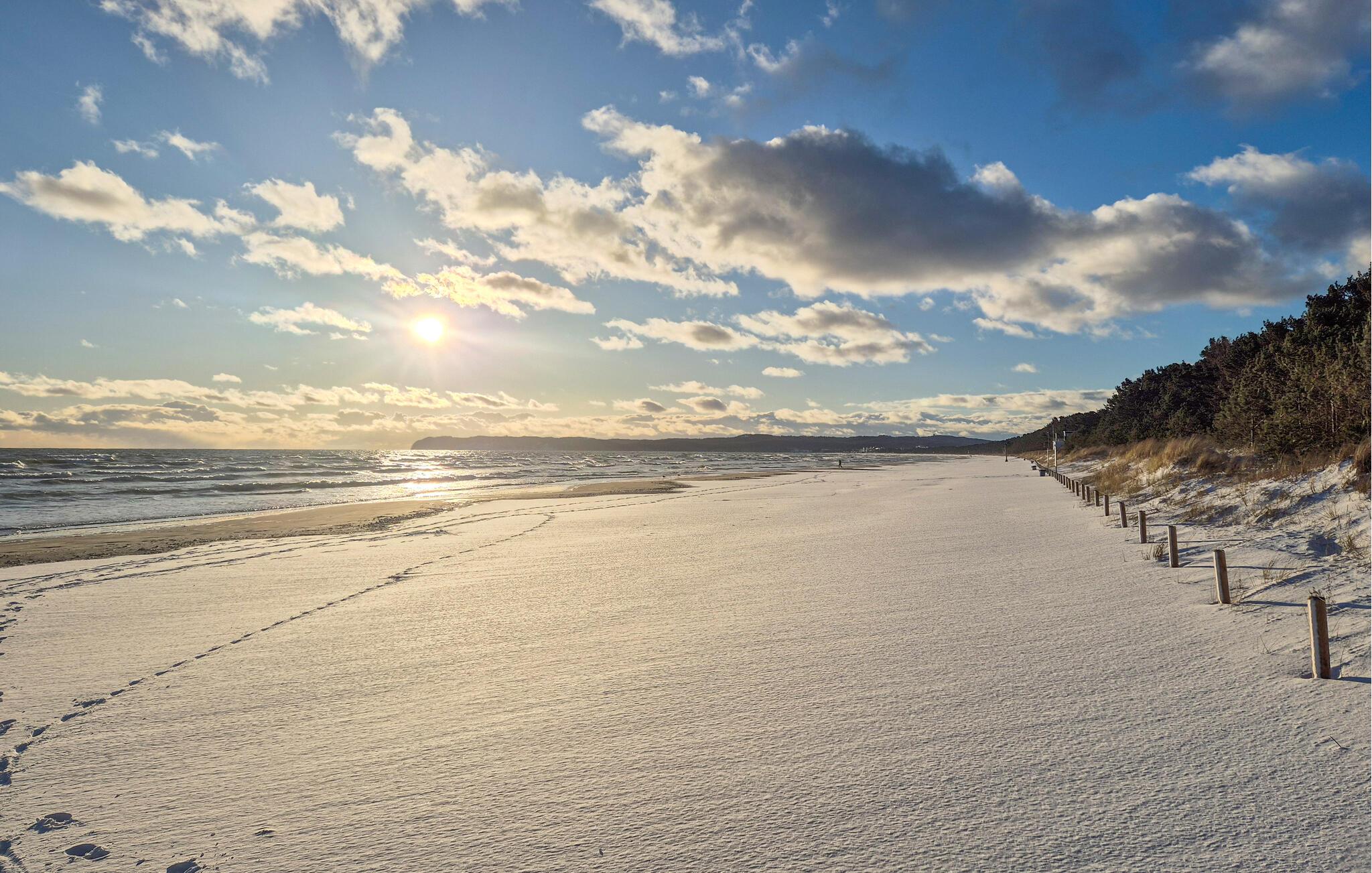 De moderne lejligheder ligger direkte på den 7 km lange, drømmende strand i Prorer Wiek, som takket være de nærliggende kridtklipper har et næsten caribisk præg med krystalklart vand. Caféer, restauranter og små butikker til hverdagens behov skyder op langs strandpromenaden. I kan nyde en cappuccino om morgenen eller en solnedgang efter en smuk dag på stranden i Prora Solitaire Bar på stedet.
