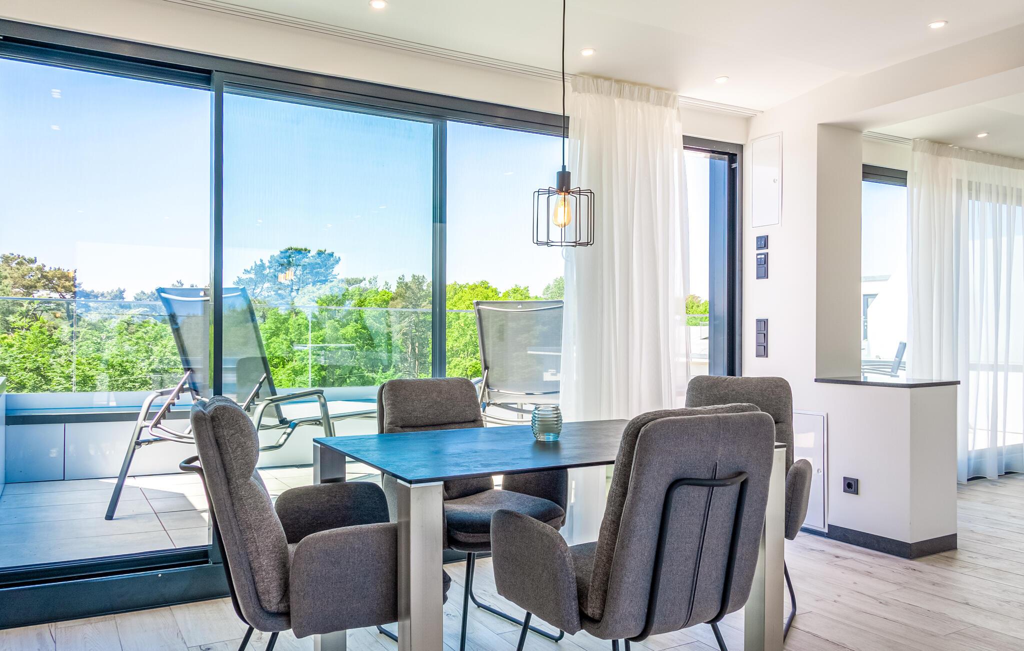 Denne elegante ferielejlighed venter på jer på øen Rügen. jeres penthouselejlighed er lys og moderne møbleret og giver et smagfuldt og velholdt indtryk. Planløsningen med to soveværelser, hver med egen balkon, to badeværelser og et stort fælles opholdsområde fordelt på næsten 160 m², gør den ideel til hele familien, der planlægger en luksuriøs ferie nær vandet.