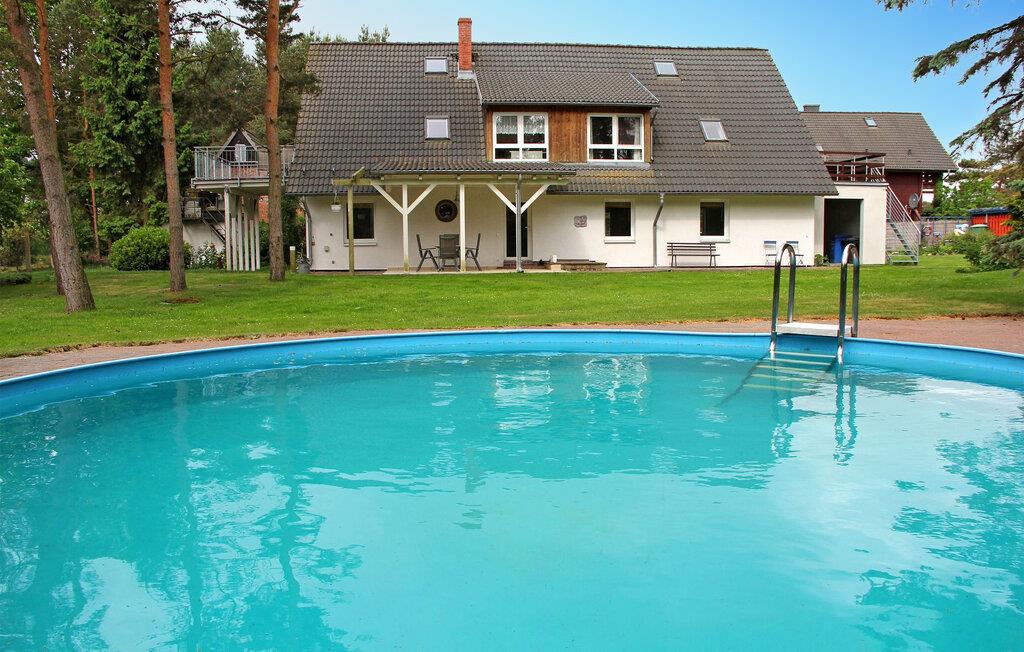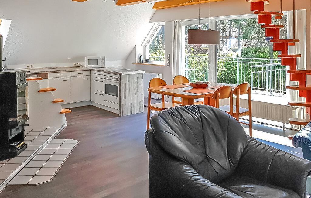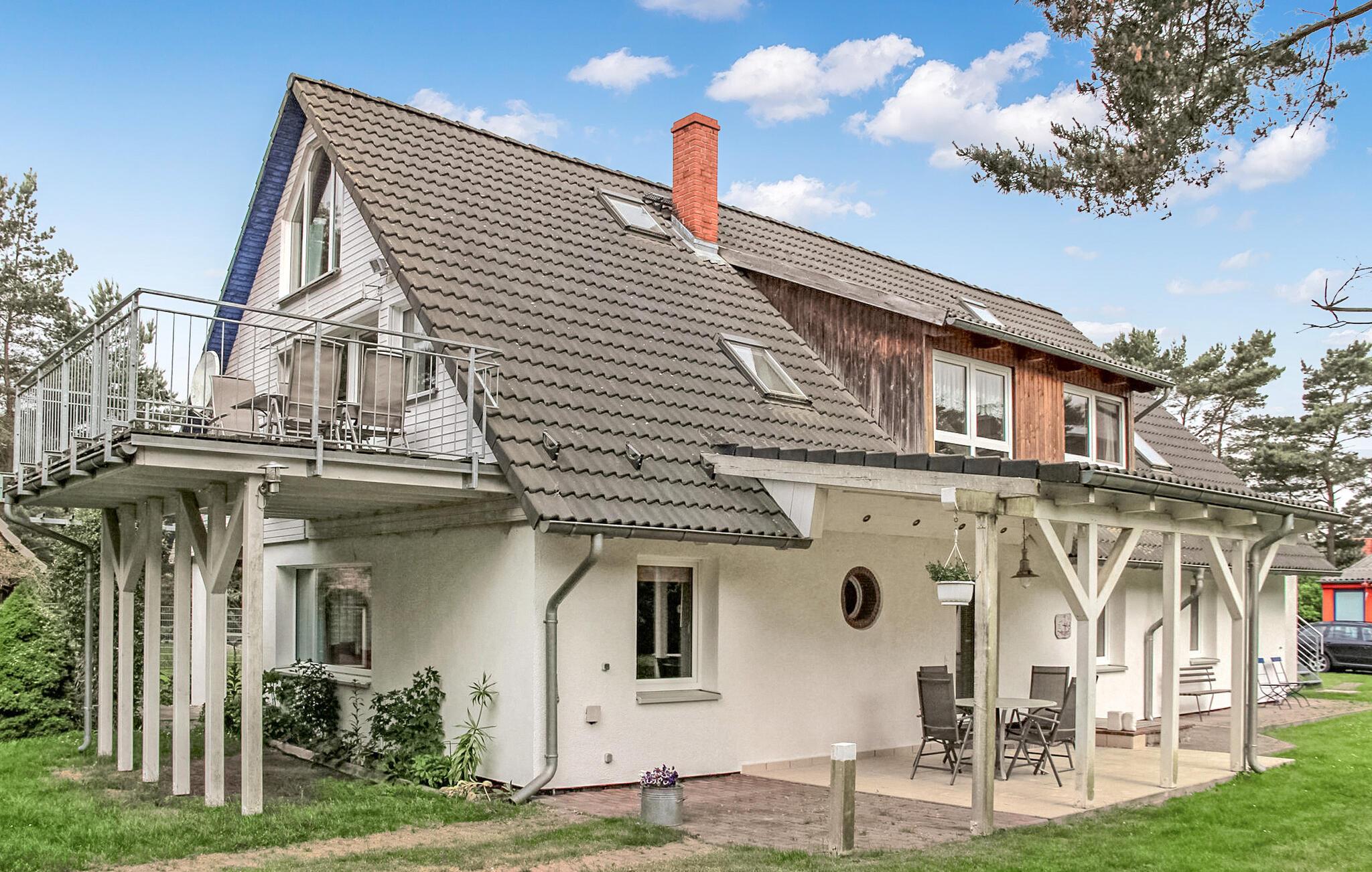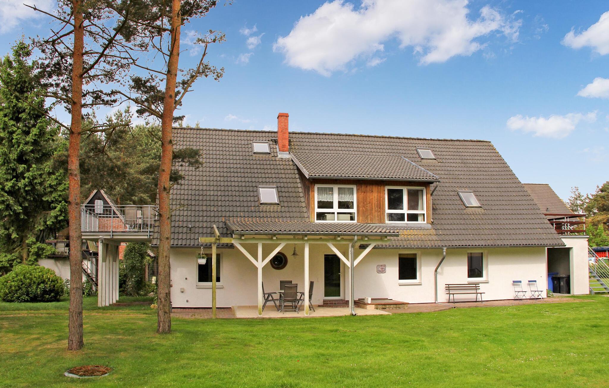 På ejerens 3.000 kvadratmeter store keramik- og feriegård i direkte skovbeliggenhed er der to ferielejligheder, som ligger hver for sig i stueetagen og øverste etage i et sommerhus. Der tilbydes i alt seks ferielejligheder i forskellig størrelse. Alle boligenheder har separat adgang. Der er en udendørs pool (fælles brug), en møbleret terrasse, en grill og parkeringsplads og WiFi. Den samlede pris inkluderer vand, energi og slutrengøring. Du skal selv medbringe håndklæder og sengetøj. Husdyr: En lille hund tilladt op til en maksimal højde på 40 cm. Betales på stedet: turistskat. Lejligheden strækker sig over 3 plan. Adgang via entre i stueetagen. På øverste etage er der et stort åbent opholdsområde (satellit-tv, radio, spisebord, pejs), et åbent tekøkken (elkomfur med ovn, køleskab med fryser, mikroovn, opvaskemaskine, diverse køkkenmaskiner), et soveværelse ( to enkeltsenge) samt bad/toilet. På loftet (stejl trappe) er der soveværelse (1x dobbeltseng) og endnu et badeværelse med brus/toilet. Lejligheden har en møbleret altan. Pruchten er en lille by i det sydlige lagunelandskab, cirka 6 km fra feriestedet Zingst ved Østersøen. I byen: restaurant, shopping, lille. Havn, båd- og cykeludlejning, ridestalde og de bedste fiskemuligheder.
