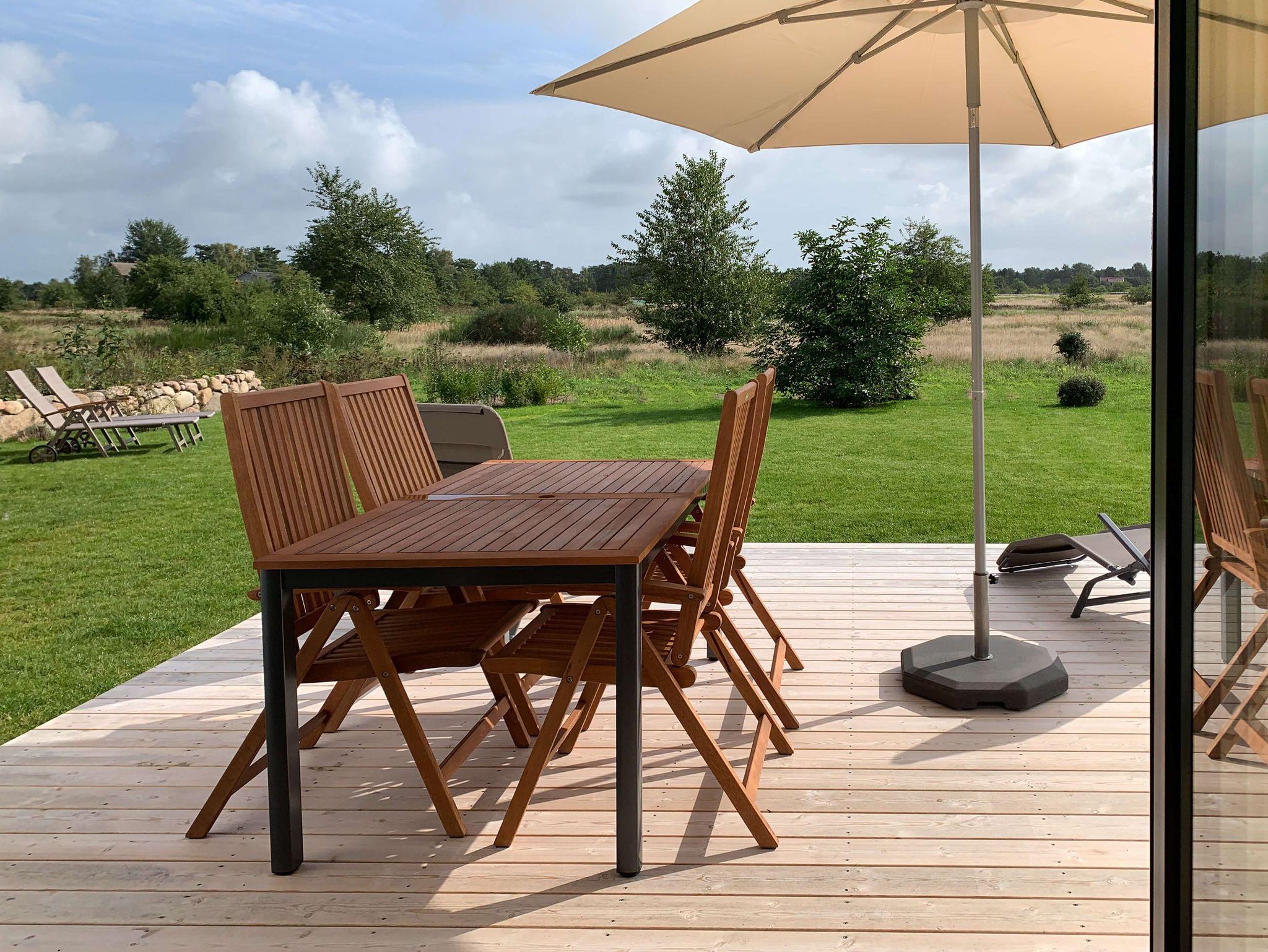 Über eine Holzterrasse gelangen Sie in den Garten, der sich zur üppigen und naturbelassenen Wildwiese öffnet und jederzeit einen sich im Wechsel der Jahreszeiten verändernden wunderschönen und reizvollen Ausblick bietet. Mit etwas Glück können Sie hier auch Wildtiere wie Rehe oder Seeadler beobachten. Der Bodden mit einer kleinen Badestelle und Liegewiese ist fußläufig entfernt und bietet eine willkommene Erfrischung an heißen Sommertagen.