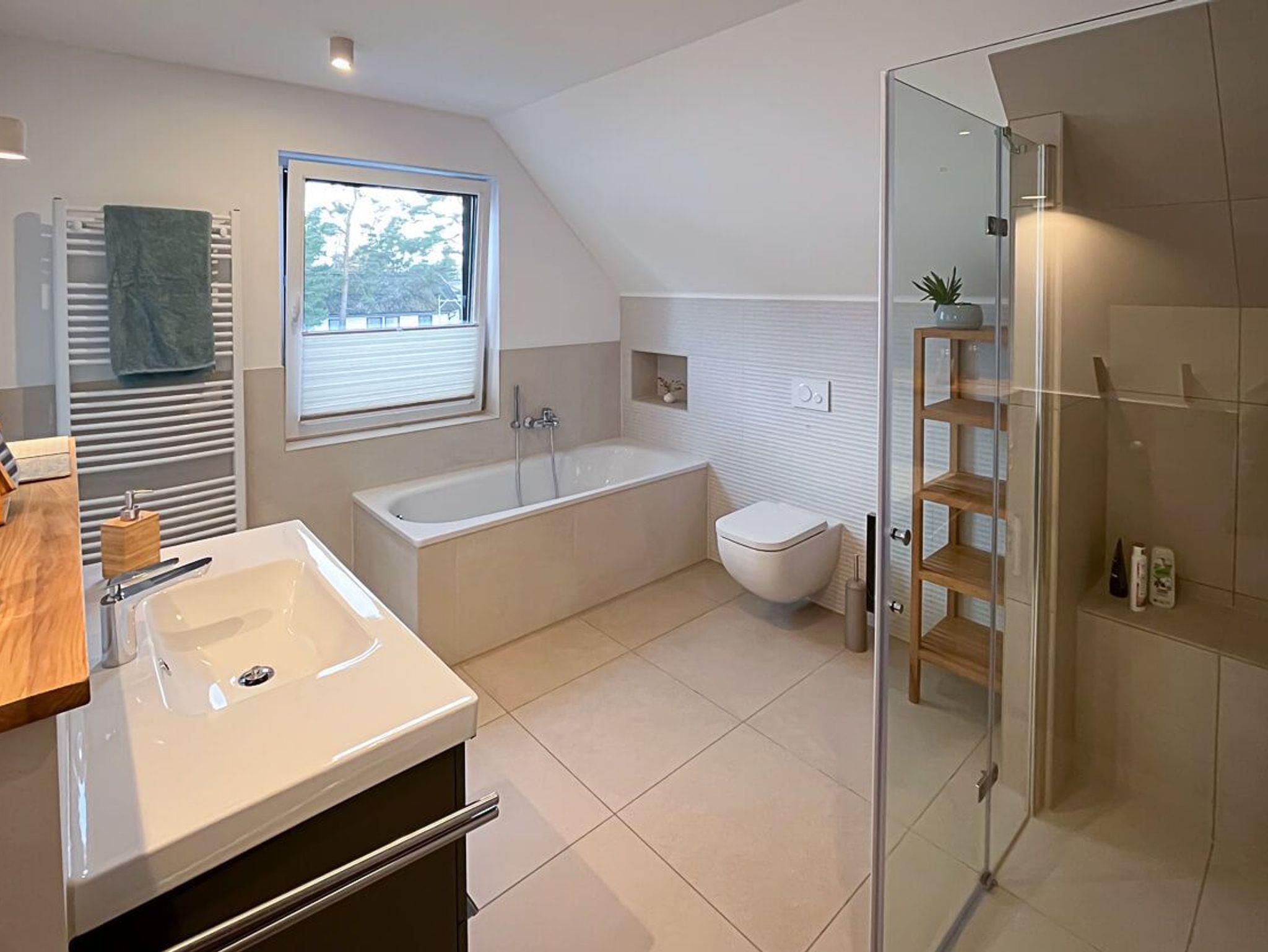 Im Badezimmer erwarten Sie verschiedene Annehmlichkeiten, darunter ein Föhn, WC, Dusche, Badewanne und ein Waschbecken. Der Kosmetikspiegel ergänzt die praktische Ausstattung, während Fußbodenheizung und Fliegengitter eine angenehme Umgebung schaffen. Auch ein separater WC-Bereich ist vorhanden, ebenfalls ausgestattet mit Föhn, WC, Waschbecken und Fußbodenheizung. Spiegel vervollständigen das funktionale Design.