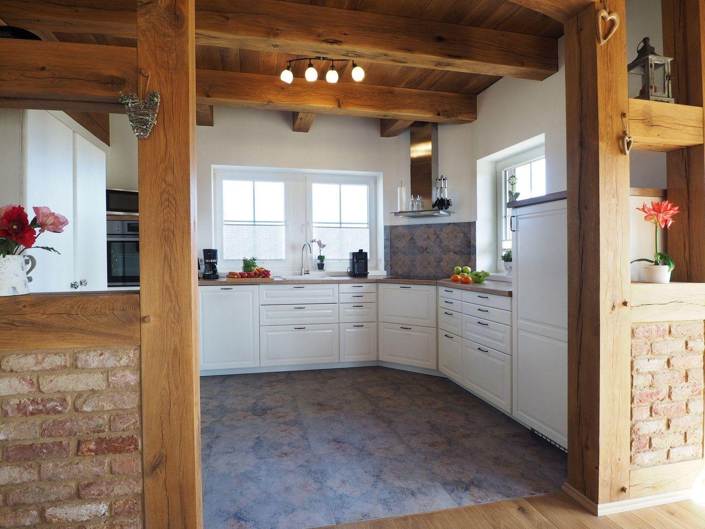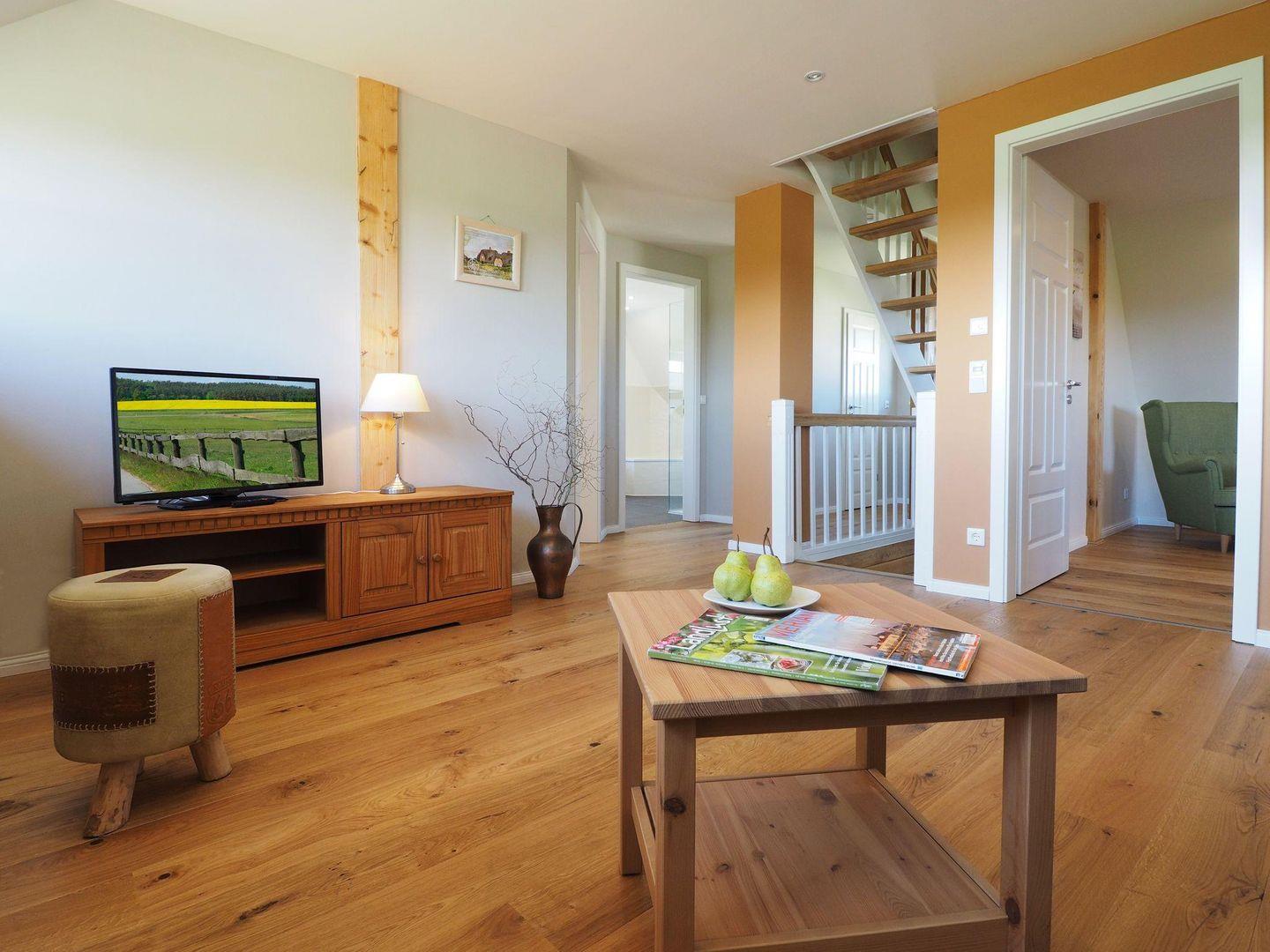 Das charmante Reetdachhaus erstreckt sich über drei Etagen und bietet Platz für bis zu zehn Personen, wodurch es sich hervorragend für große Familien, mehrere Generationen oder einen Urlaub mit Freunden eignet. Bereits beim Betreten des Hauses spüren Sie die besondere Wohnatmosphäre, die durch ökologische Lehmputzwände im großzügigen Wohn- und Essbereich geprägt ist. Diese sorgen für ein angenehmes Raumklima und unterstreichen den naturnahen Charakter des Hauses. Der offene Wohnbereich lädt mit viel Platz zum Zusammensitzen, Essen und Entspannen ein, während die vollständig ausgestattete Küche beste Voraussetzungen für gemeinsames Kochen bietet. Ergänzt wird das Erdgeschoss durch ein Badezimmer mit Dusche.