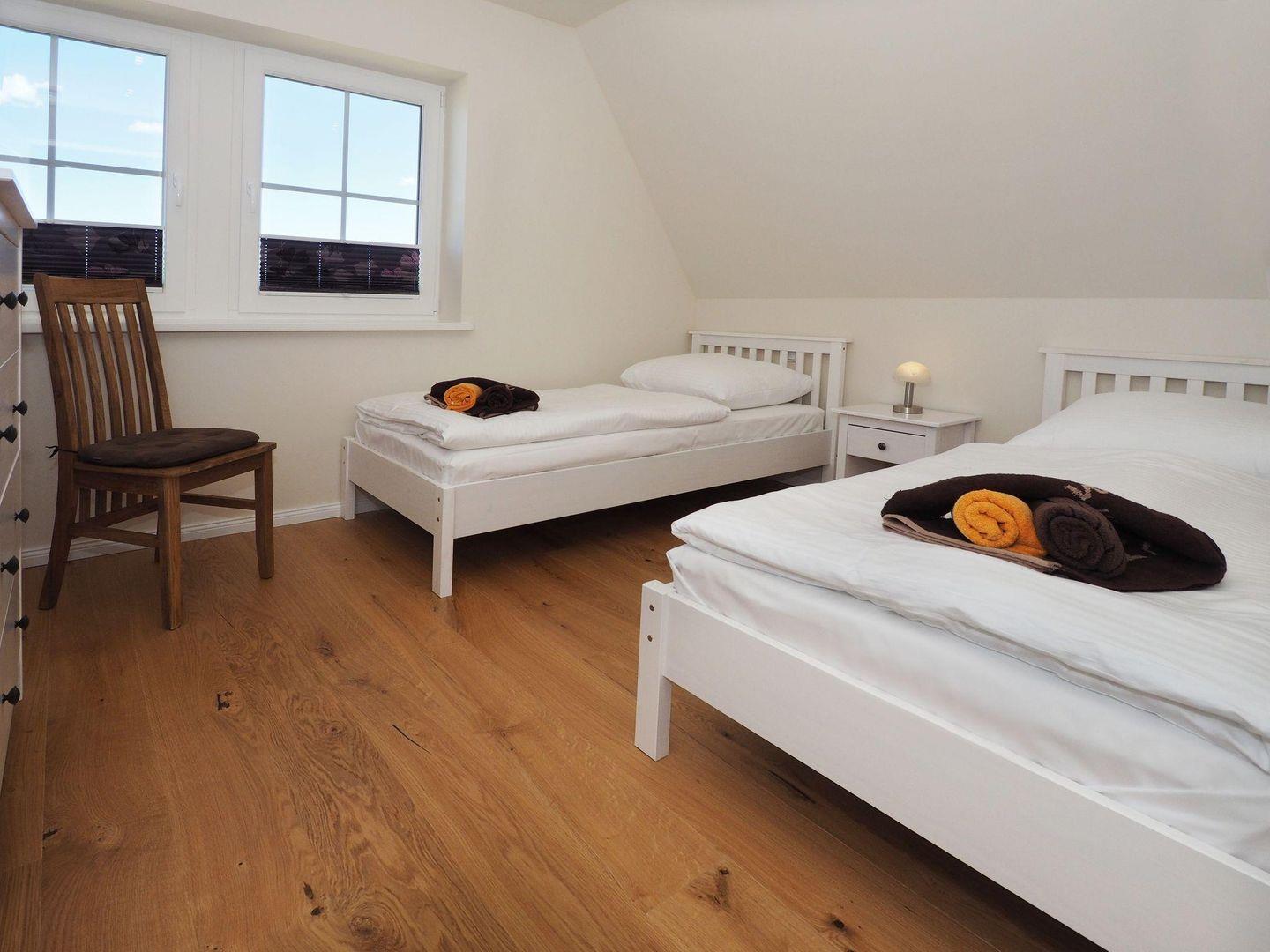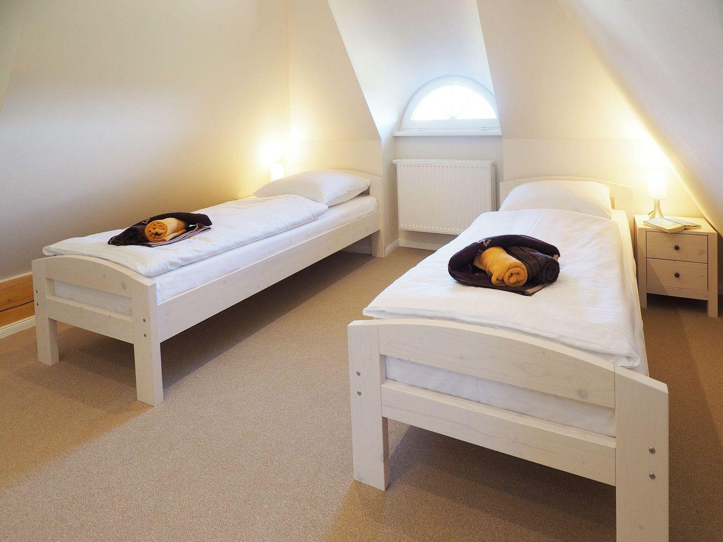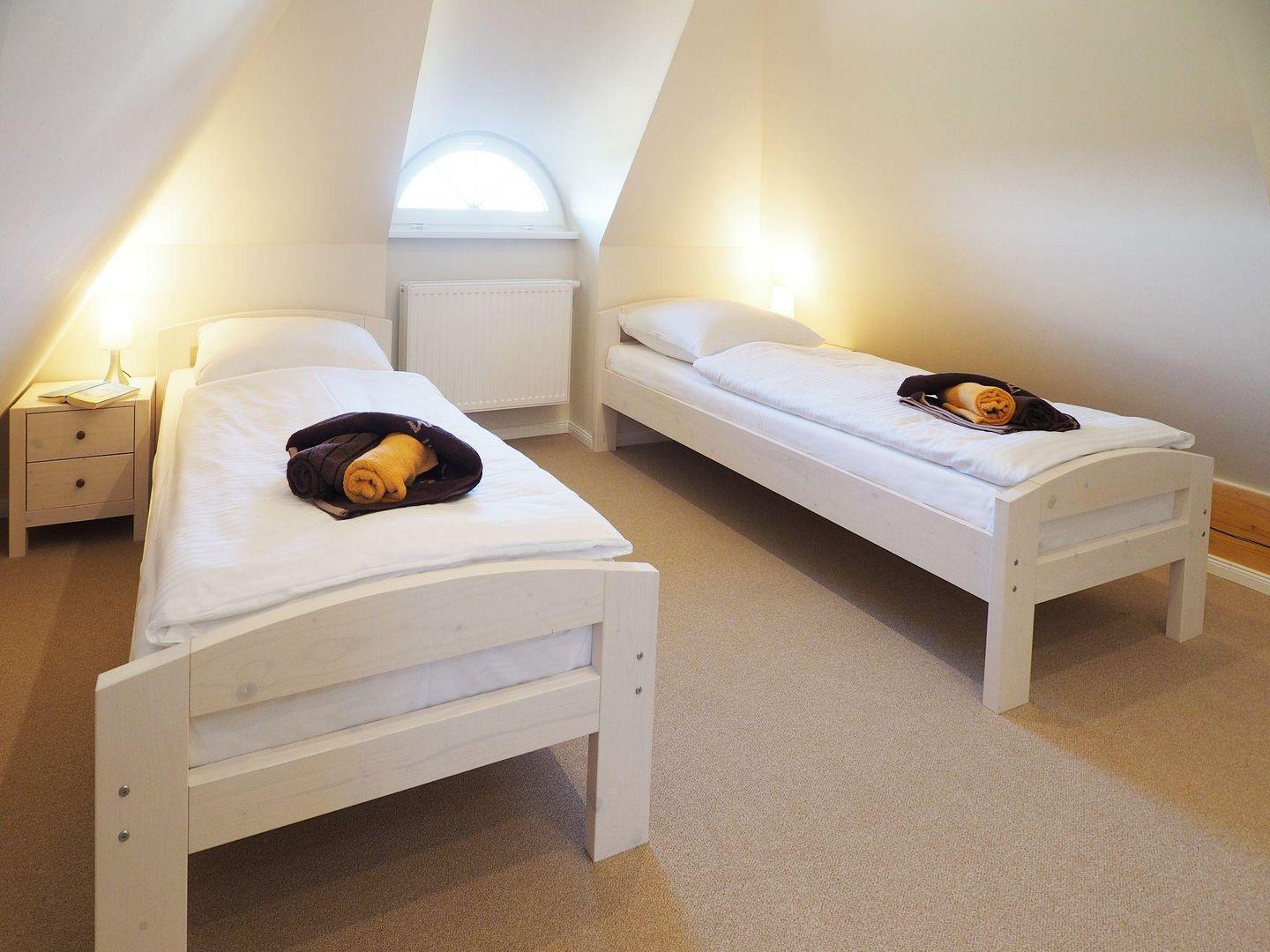 Über eine weitere Treppe erreichen Sie das Dachgeschoss, in dem sich zwei weitere Schlafzimmer mit jeweils zwei Einzelbetten befinden. Damit stehen ausreichend Rückzugsorte für alle Mitreisenden zur Verfügung. Für die kleinsten Gäste sind ein Babyreisebett mit Matratze sowie ein Hochstuhl vorhanden.