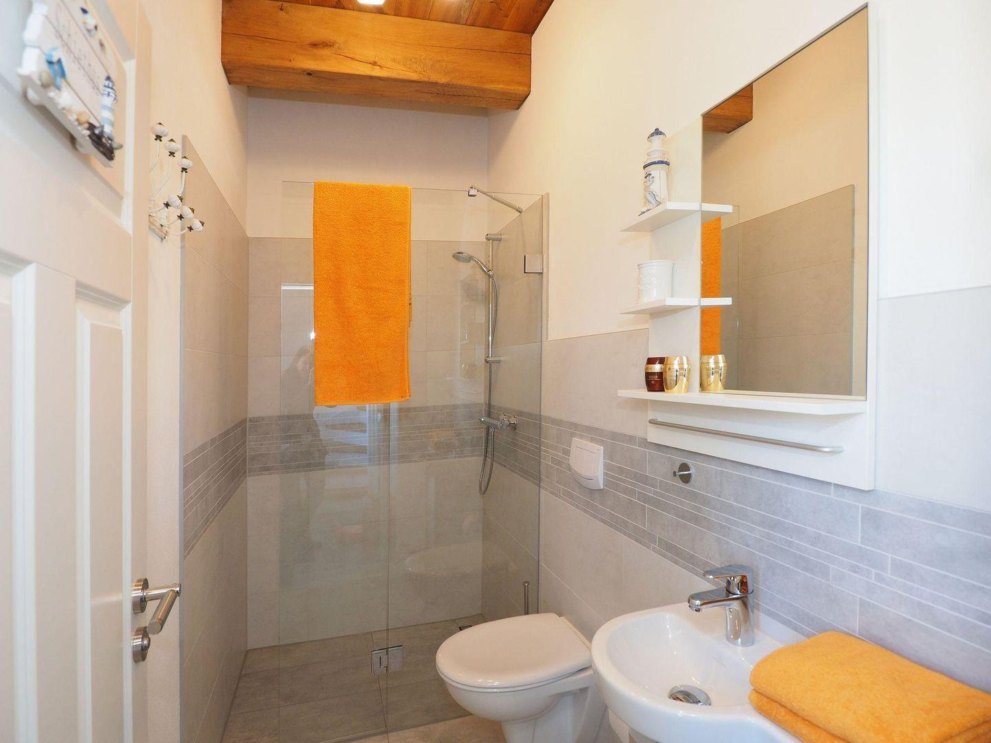 Im Obergeschoss befinden sich drei Schlafzimmer, zwei davon mit komfortablen Doppelbetten, das dritte mit zwei getrennt stehenden Einzelbetten. Zusätzlich lädt eine großzügige Galerie mit Sitzecke und zweitem TV zu ruhigen Momenten, Lesen oder gemeinsamen Filmabenden ein. Das helle, geräumige Bad auf dieser Etage ist mit Dusche und Badewanne ausgestattet und bietet hohen Komfort auch bei voller Belegung.