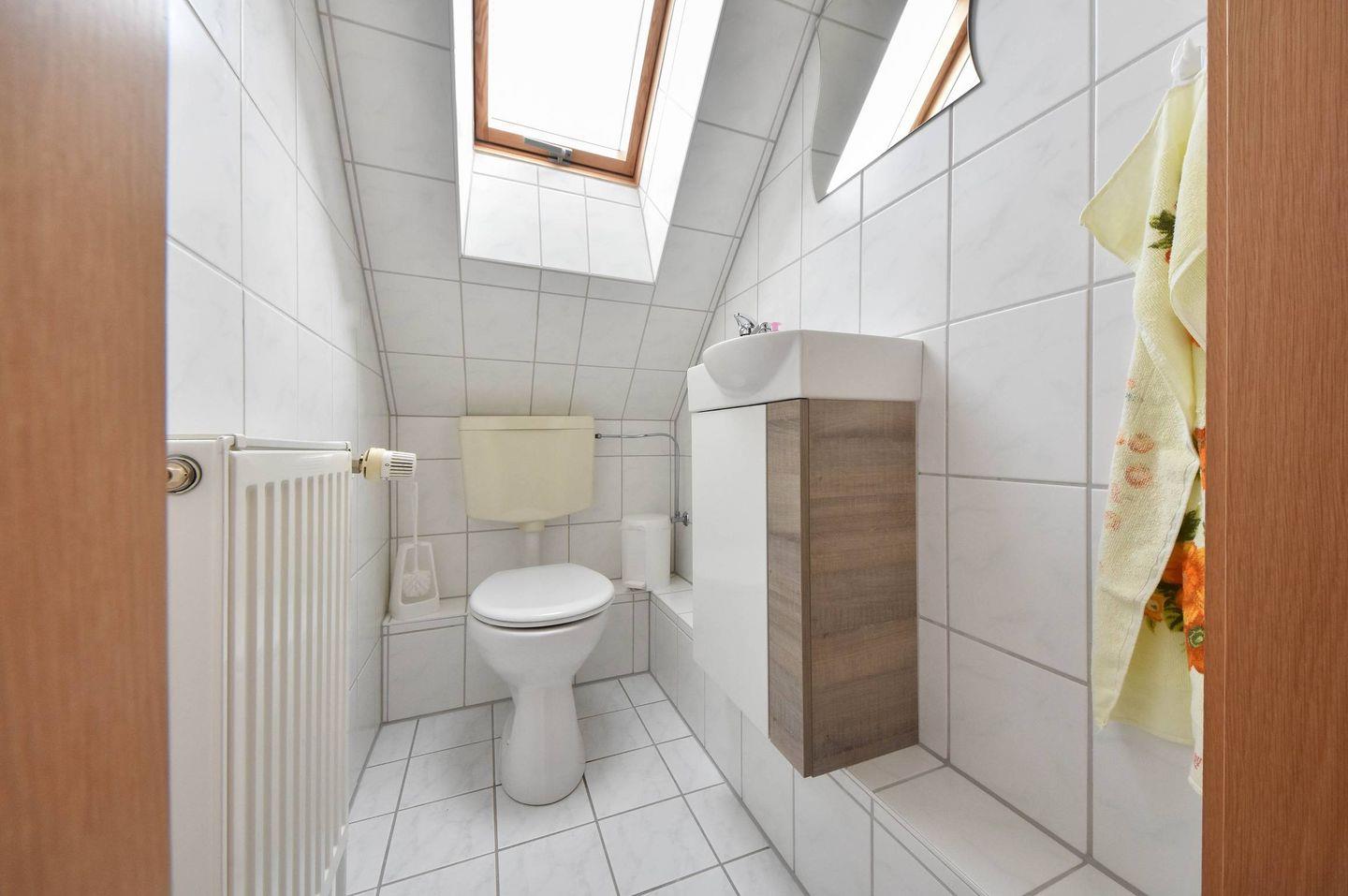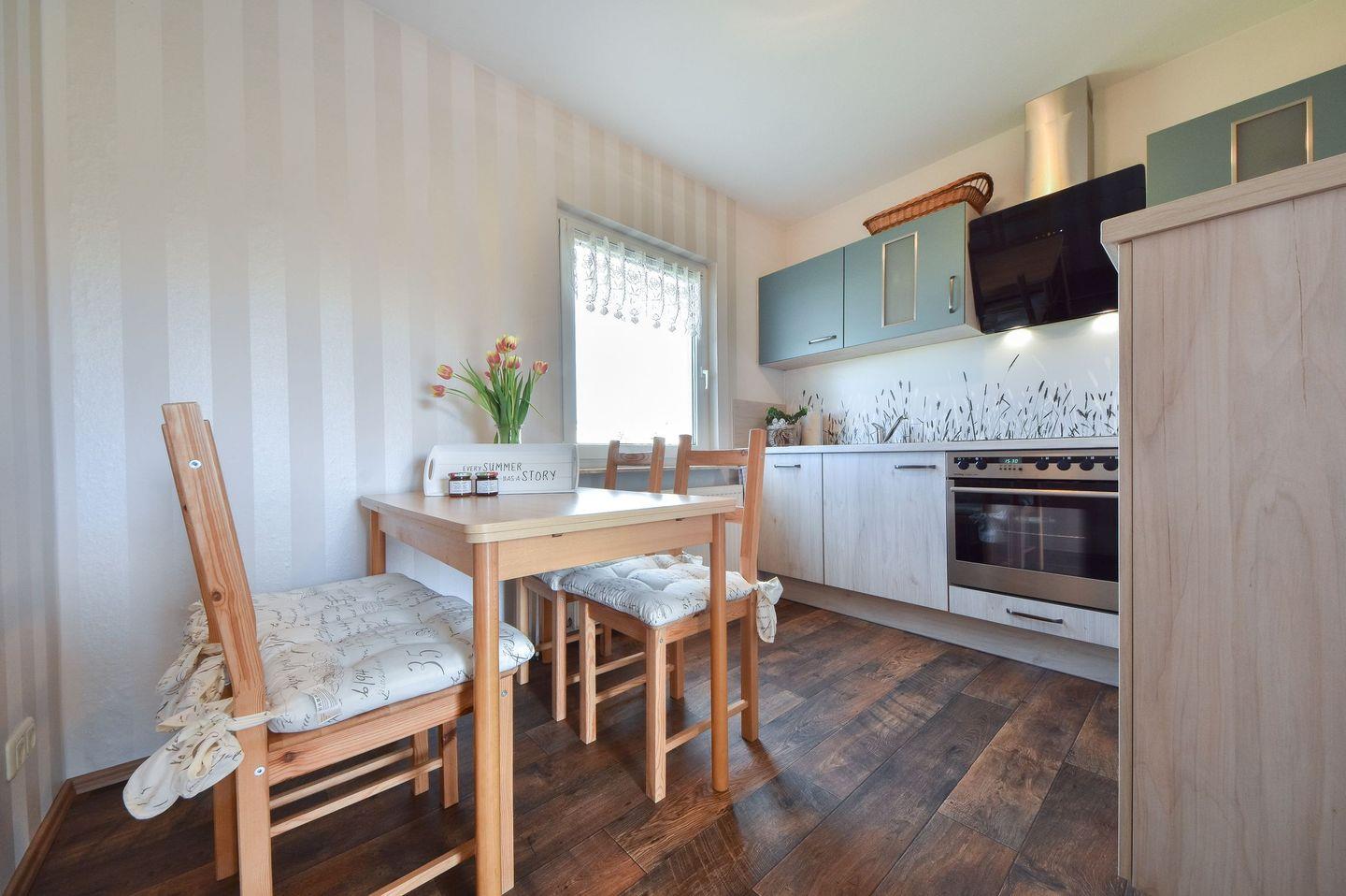 Im Erdgeschoss ist die Wohnung mit mit kleiner Küche samt Esstisch, dem Tageslichtbad mit Dusche und dem Wohnraum ausgestattet. Von dort aus gelangen Sie über eine schmale Platzspartreppe (nur ein Fuß je Stufe möglich) in die obere Etage. Achtung, die Treppe ist sehr steil. In der ersten Etage befinden sich die beiden Schlafzimmer und ein kleines WC.