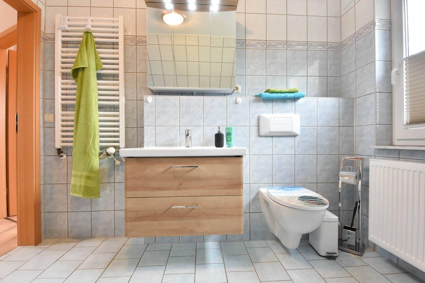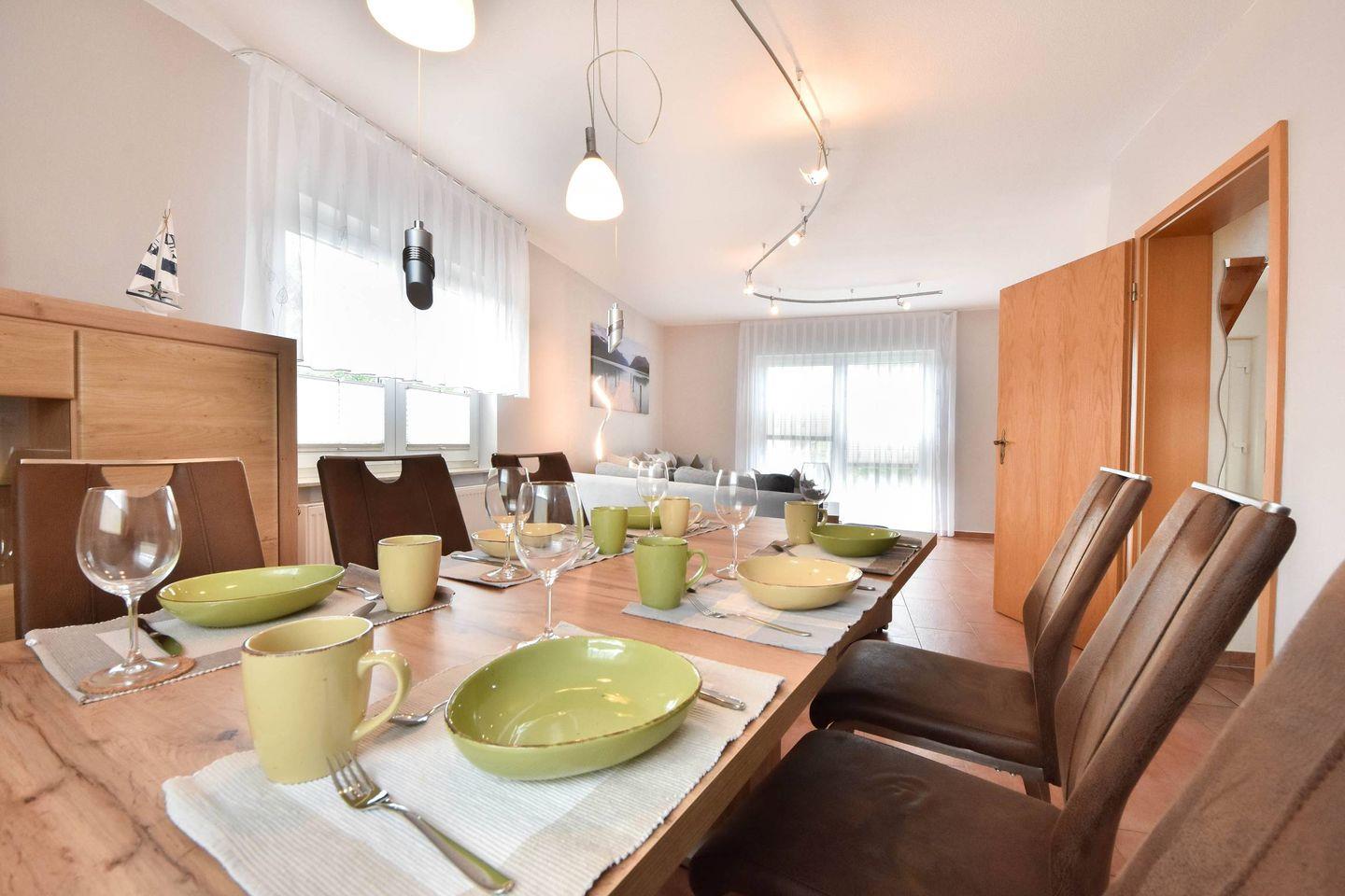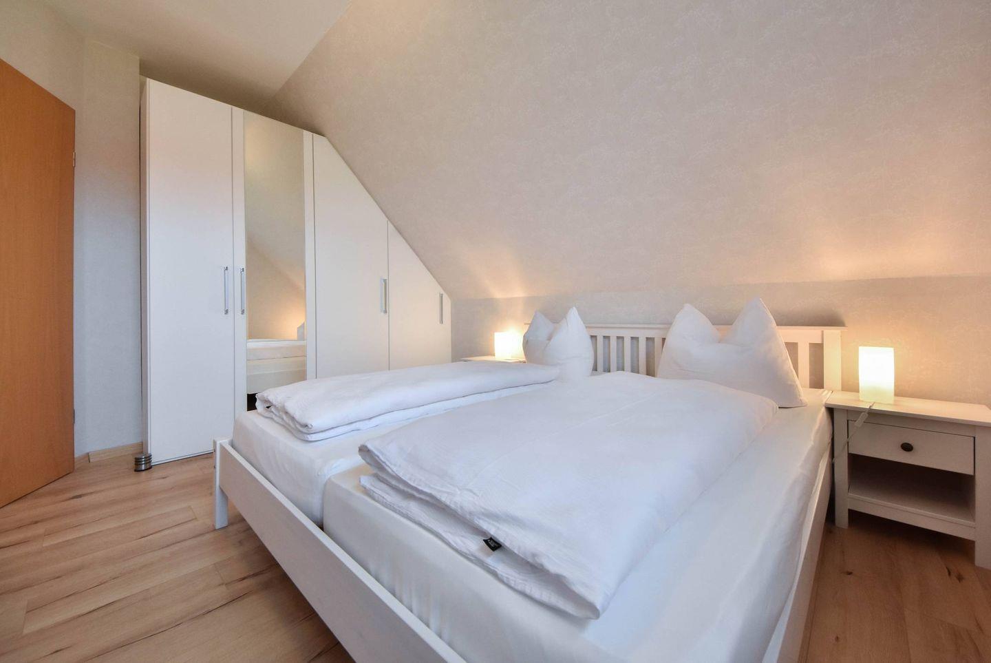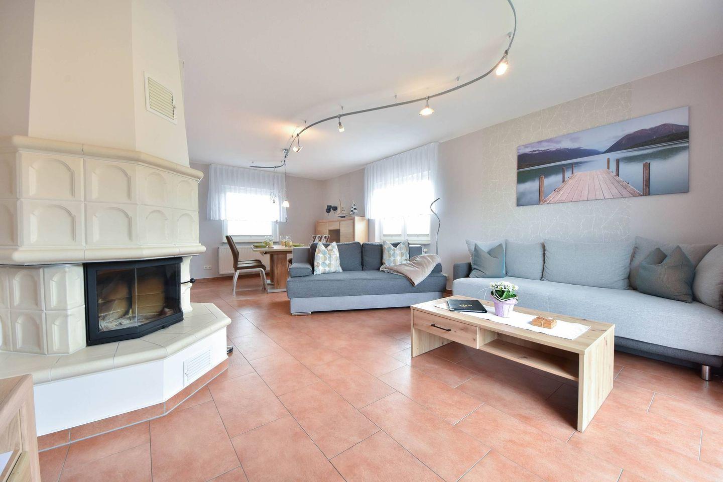 Die große Ferienwohnung verfügt über etwa 117 m² und drei Schlafzimmer. Sie wurde mit viel Liebe zum Detail renoviert und bietet nun für sechs Personen ausreichend Platz. Im Erdgeschoss befinden sich der offene Wohnraum samt Esstisch und Kamin, die voll ausgestattete Küche mit Backofen und allen Annehmlichkeiten, sowie das Gäste-WC. Über die Treppe gelangen Sie in das obere Stockwerk. Zwei der drei Schlafzimmer sind mit Doppelbett eingerichtet, der dritte Schlafraum mit zwei Einzelbetten. Alle Zimmer verfügen über ausreichend Stauraum für Ihre Garderobe. Die Fenster sind abdunkelbar und mit Mückenschutz ausgestattet. Ebenfalls auf dieser Etage finden Sie das große Badezimmer mit Dusche und Badewanne.