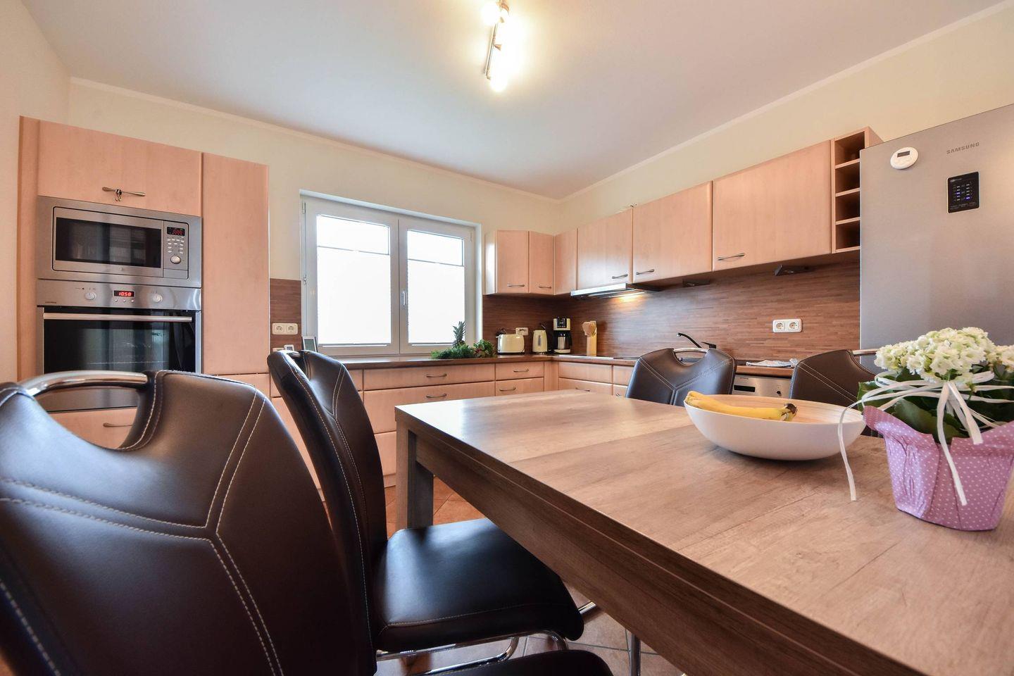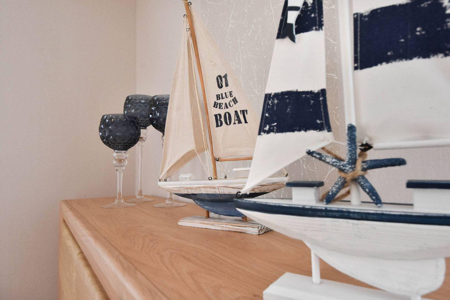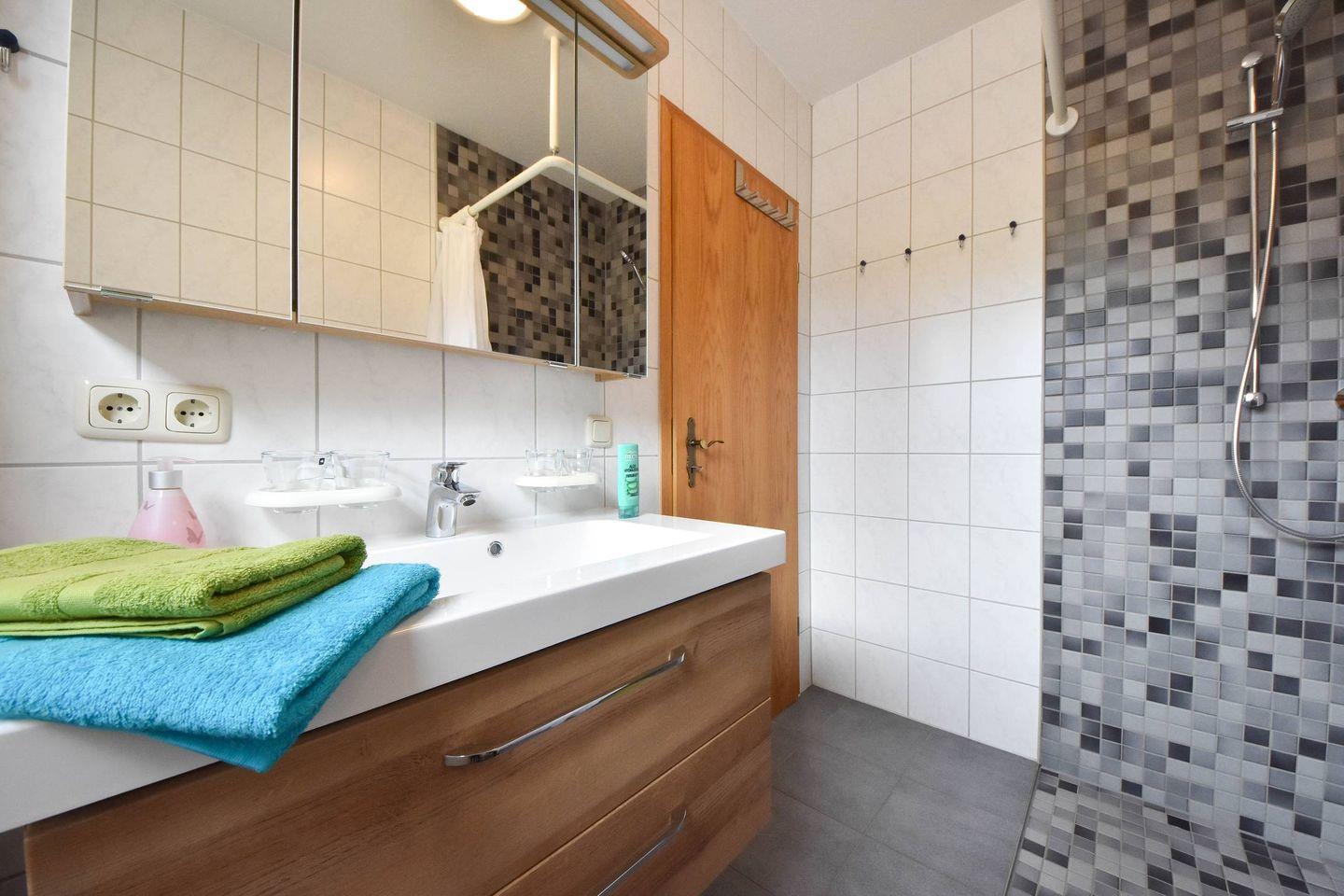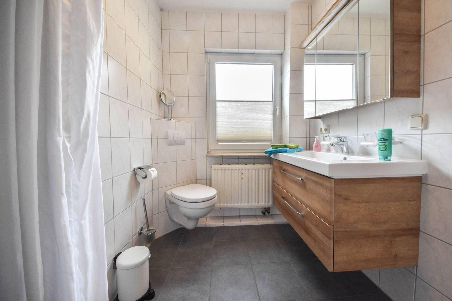Die große Ferienwohnung verfügt über etwa 117 m² und drei Schlafzimmer. Sie wurde mit viel Liebe zum Detail renoviert und bietet nun für sechs Personen ausreichend Platz. Im Erdgeschoss befinden sich der offene Wohnraum samt Esstisch und Kamin, die voll ausgestattete Küche mit Backofen und allen Annehmlichkeiten, sowie das Gäste-WC. Über die Treppe gelangen Sie in das obere Stockwerk. Zwei der drei Schlafzimmer sind mit Doppelbett eingerichtet, der dritte Schlafraum mit zwei Einzelbetten. Alle Zimmer verfügen über ausreichend Stauraum für Ihre Garderobe. Die Fenster sind abdunkelbar und mit Mückenschutz ausgestattet. Ebenfalls auf dieser Etage finden Sie das große Badezimmer mit Dusche und Badewanne.