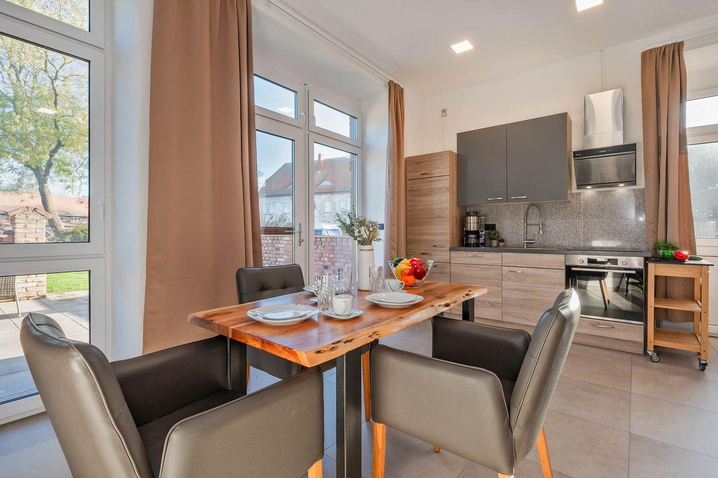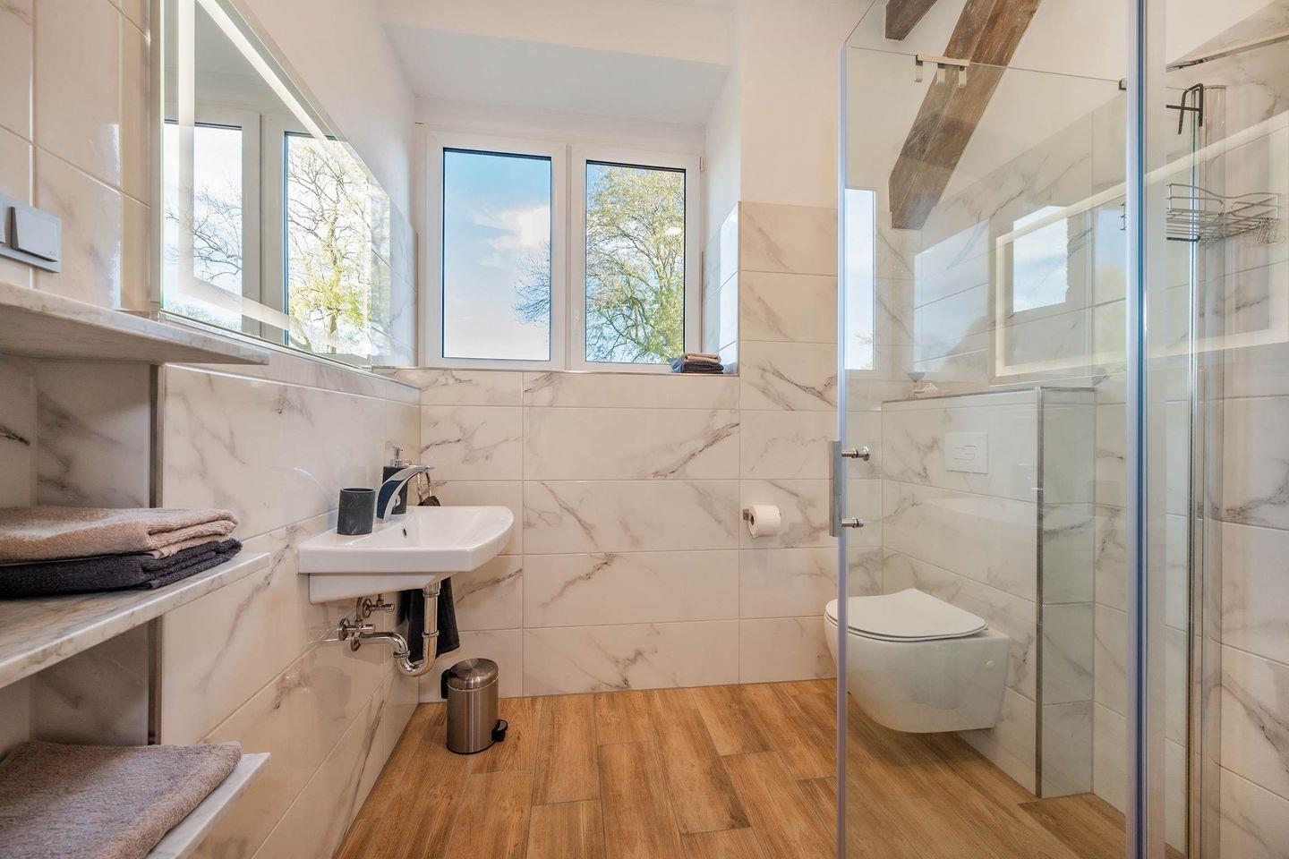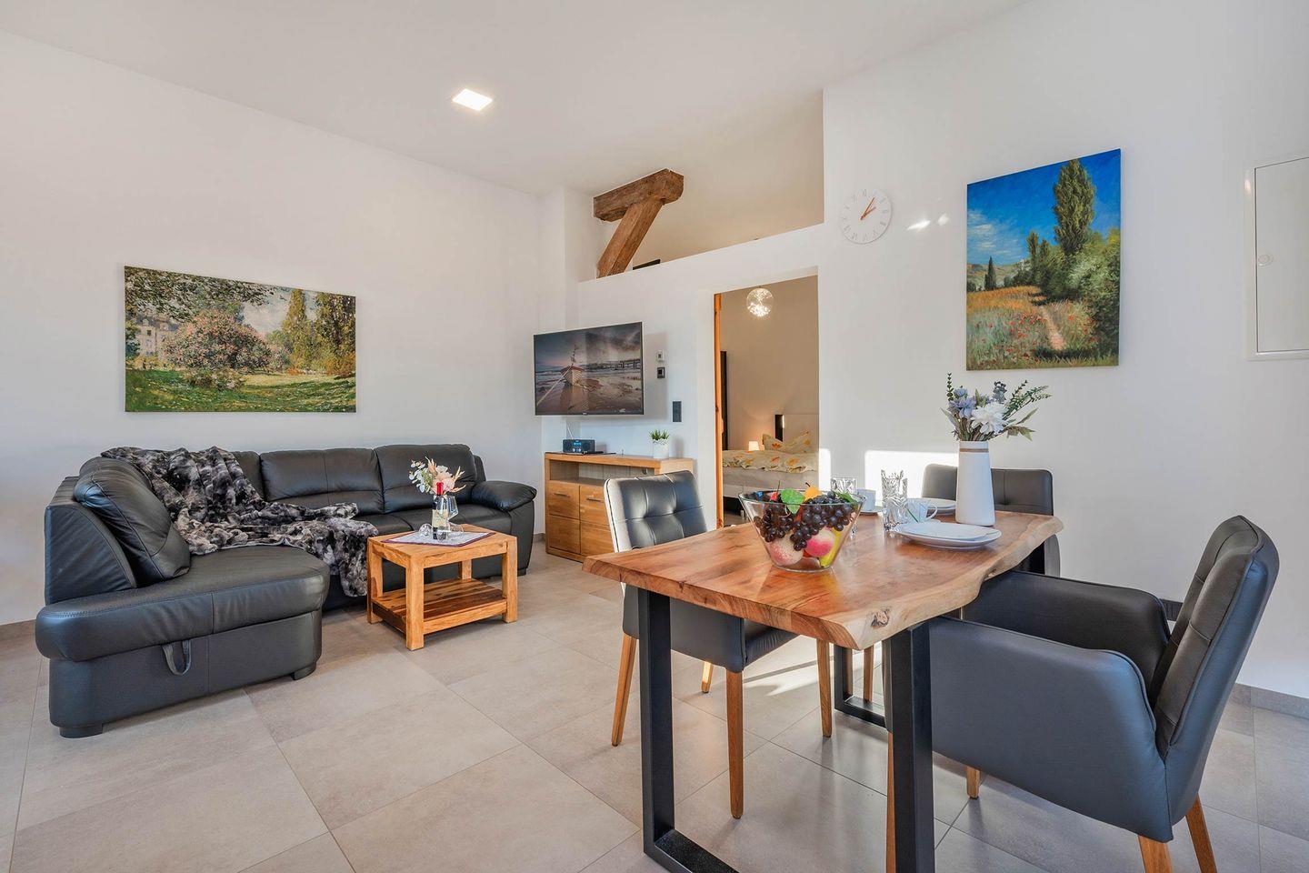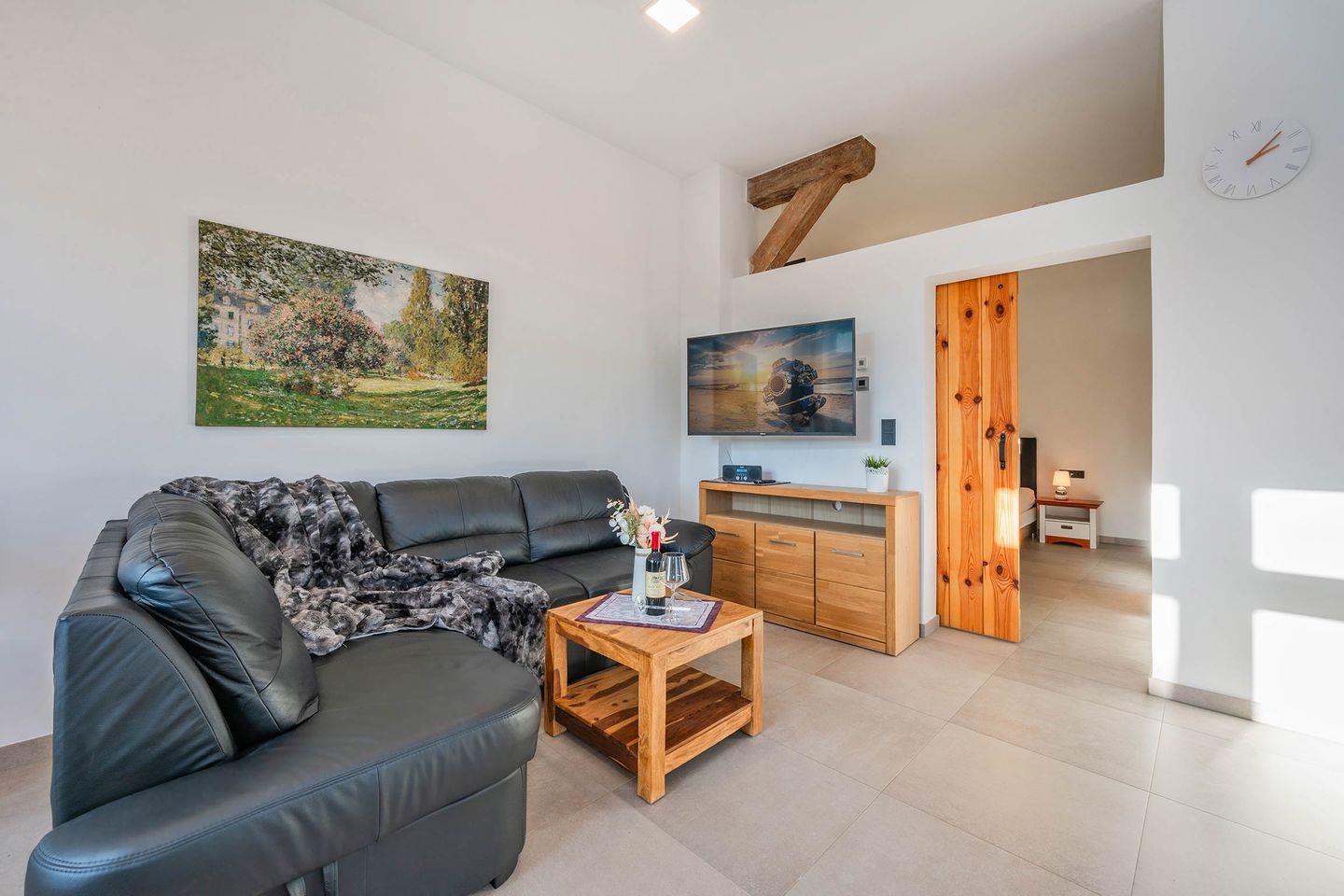 In Appartement Nr. 03 erwartet Sie ein gekonntes Zusammenspiel aus moderner Einrichtung und stilvoll in Szene gesetzten rustikalen Landhausdetails. Der Wohnbereich verfügt über ein ledernes Schlafsofa, ein Sideboard sowie einen Fernseher und die Küchenzeile samt Esstisch. Auf dem bequemen Sofa kann ein Gast nächtigen. Der Schlafbereich wird durch eine charmante Schiebetür vom Wohnraum abgegrenzt. Dahinter werden Sie ein komfortables Boxspringbett, einen Garderobenständer sowie einen Kleiderschrank mit beträchtlichem Stauraum finden. Ein weiterer TV beschert auch vom Bett aus Fernsehvergnügen. Ein freiliegender Deckenbalken trägt als Blickfang zur Gemütlichkeit bei und sorgt neben dem Oberlicht für angenehmen Lichteinfall. Die Küche besitzt einen Induktionsherd mit vier Platten, Backofen, Spülmaschine, Kühlschrank und Mikrowelle. Das moderne Tageslicht-Badezimmer mit Waschbecken, WC und ebenerdiger Regendusche rundet Ihren Aufenthalt ab.