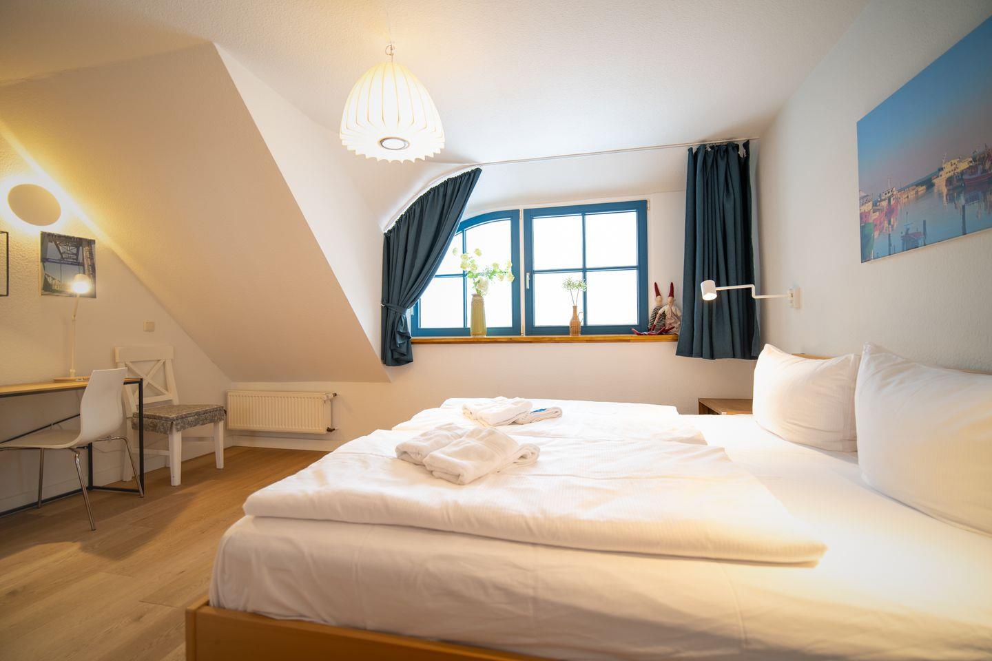 Im Obergeschoss befinden sich zwei geräumige Schlafzimmer mit Doppelbetten sowie ein innenliegendes Bad mit Badewanne – ideal für gemütliche Abendrituale. Das Dachgeschoss beherbergt ein charmantes Kinderzimmer mit zwei Einzelbetten – ein wunderbarer Rückzugsort für die kleinen Gäste.