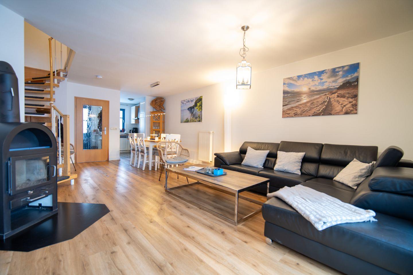 Im offen gestalteten Erdgeschoss lädt der helle Wohnbereich mit Sofaecke und Kamin zu entspannten Stunden ein. Durch bodentiefe Fenster gelangen Sie auf die sonnige Westterrasse – perfekt, um den Tag bei warmem Abendlicht ausklingen zu lassen. Die angrenzende Landhausküche ist vollständig ausgestattet und bietet alles, was Sie für gemeinsame Kochmomente brauchen. Ein kleines Duschbad sorgt auf dieser Ebene für zusätzlichen Komfort.