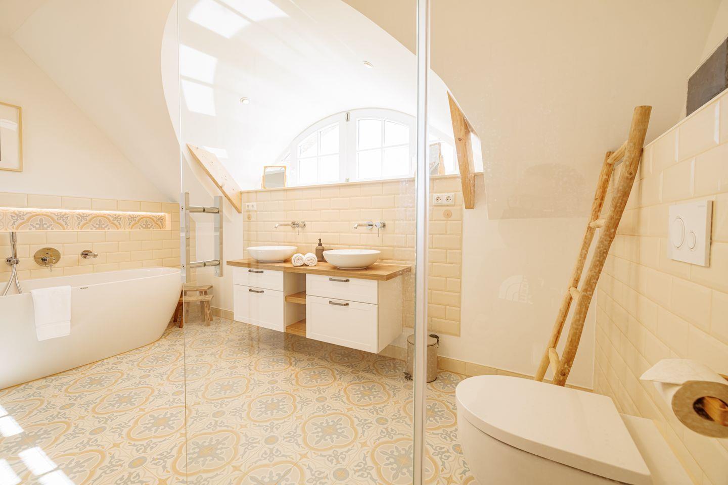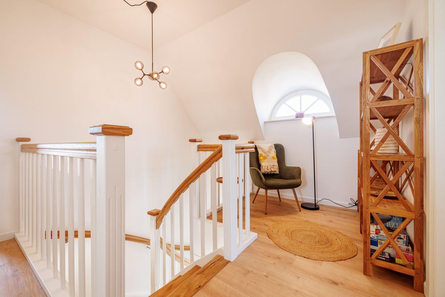 Im Dachgeschoss erwarten Sie drei gemütliche Schlafzimmer mit Doppelbetten. Dank der bodentiefen Fenster mit französischen Balkonen sind die Räume lichtdurchflutet; Außenrollos sorgen bei Bedarf für angenehme Verdunkelung. Das Hauptbad mit Dusche, Badewanne und der charakteristischen Fledermausgaube bietet ebenfalls einen wunderbaren Blick über die Wiek. Eine kleine Leseecke in der Galerie lädt zum Entspannen und Träumen ein. Für alle, die auch im Urlaub arbeiten müssen, steht schnelles Internet via Glasfaser zur Verfügung.