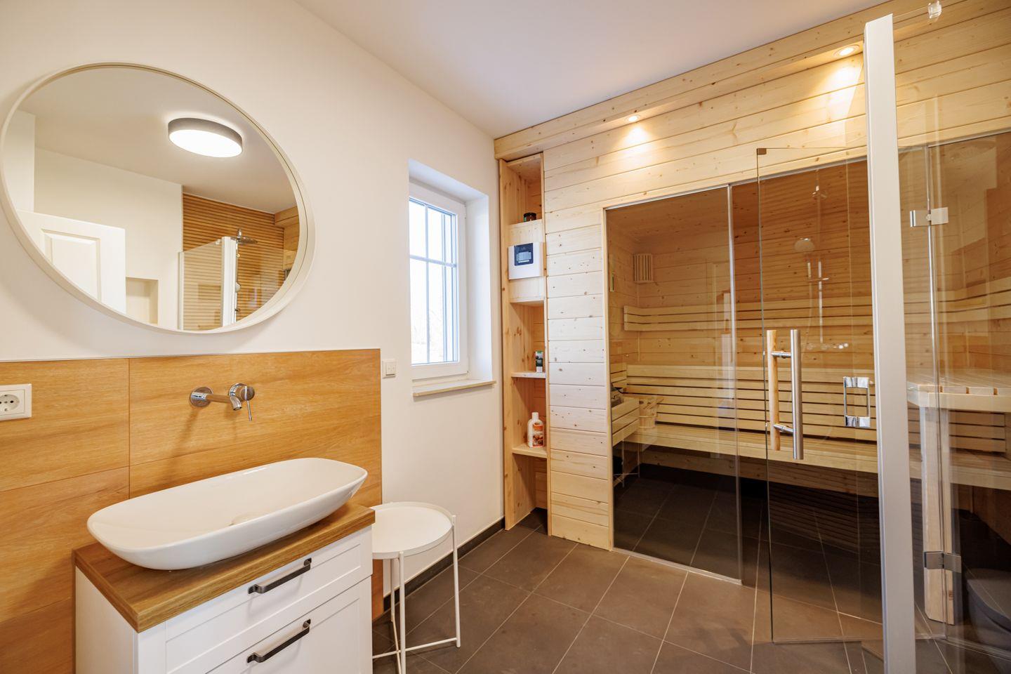 Das offen gestaltete Erdgeschoss beeindruckt mit bodentiefen Fenstern und einem traumhaften Blick über den Puddeminer Hafen. Die hochwertige Landhausküche mit großem Side-by-Side-Kühl- und Gefrierschrank inklusive Eiswürfelspender lässt keine Wünsche offen. Zudem befinden sich im Erdgeschoss eine großzügige Sauna mit Dusche und WC sowie ein Hauswirtschaftsraum mit Waschmaschine.