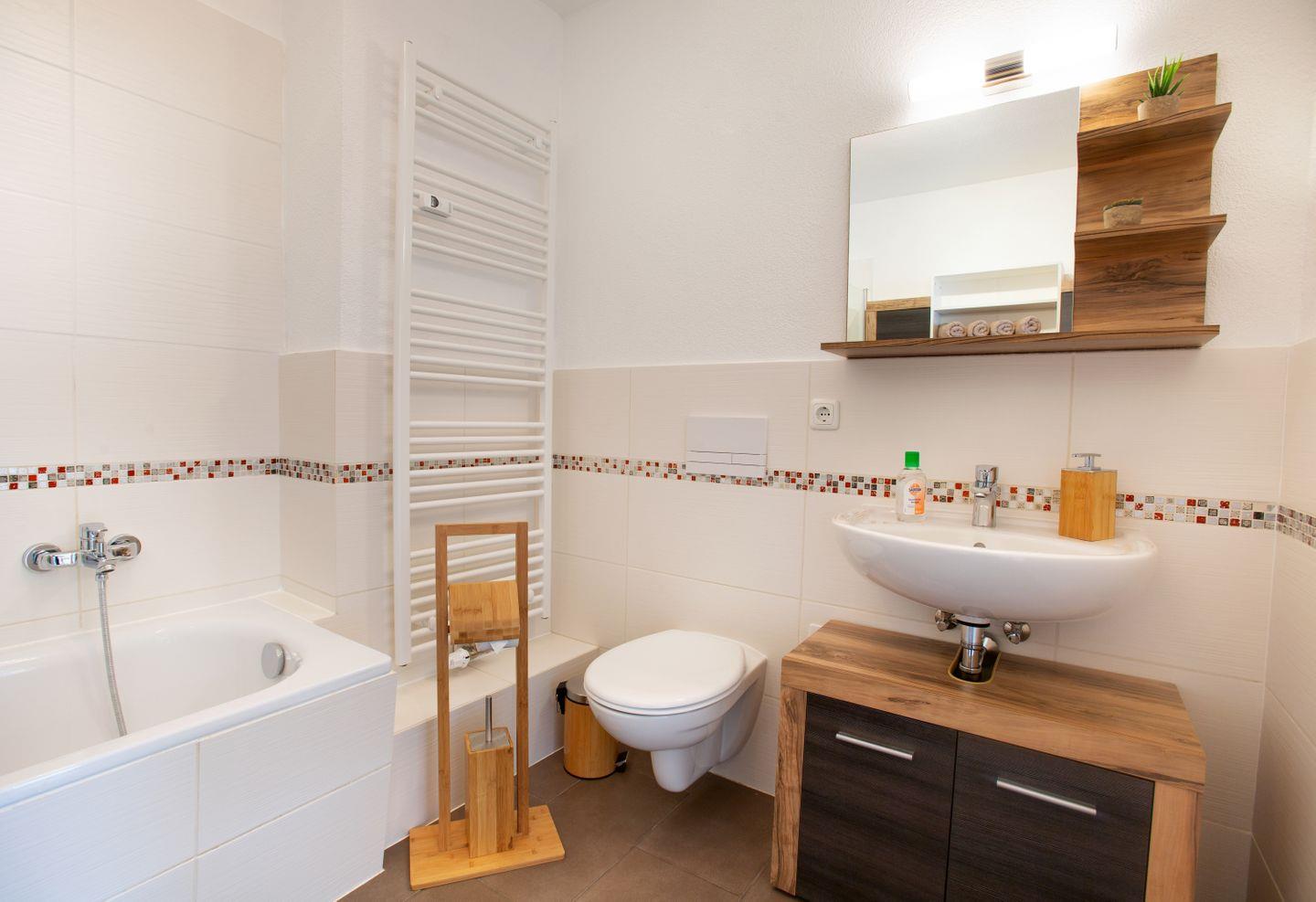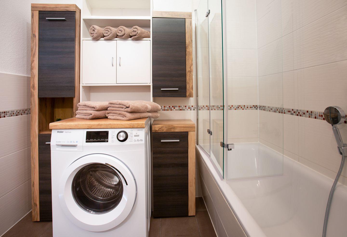 Die Ferienwohnung verfügt über ein Badezimmer, das sowohl mit einer Dusche als auch mit einer Badewanne ausgestattet ist, ideal für entspannende Momente nach einem langen Tag. Hier finden Sie auch einen Haartrockner, frische Badetücher und die Erstausstattung, sodass Sie gleich bei Ihrer Ankunft alles Notwendige vorfinden.