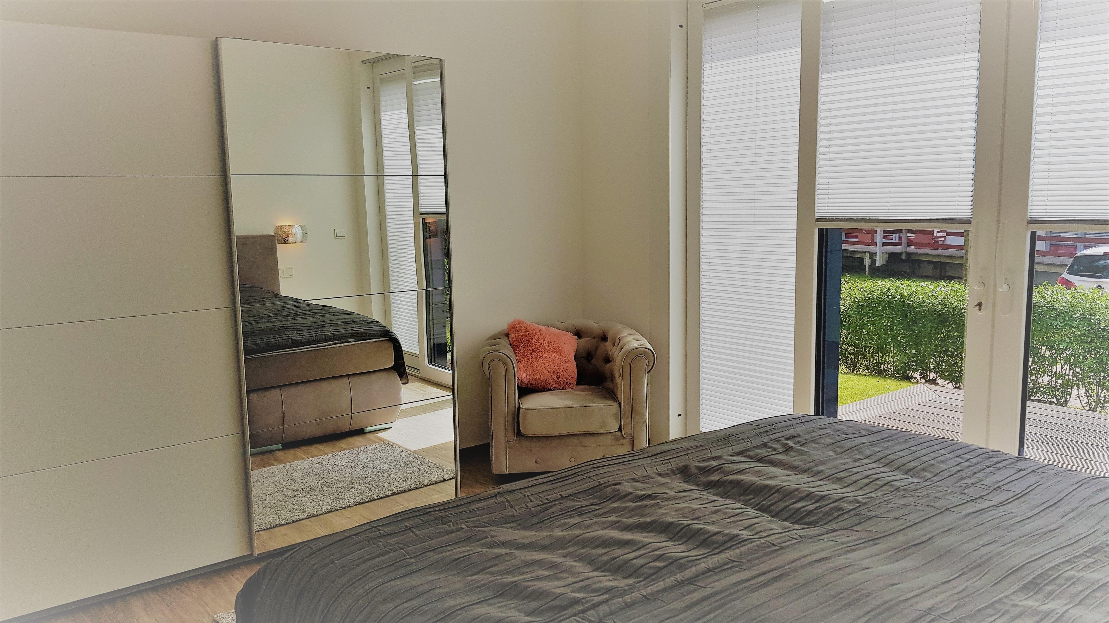 Ein Schlafzimmer ist mit einem Boxspringbett 180 cm x 200 cm ausgestattet, das zweite Schlafzimmer verfügt über ein Boxspringbett mit den Massen 90 cm x 200 cm. Beide Schlafzimmer verfügen über einen Zugang zur Terrasse. Das Tageslichtbad verfügt über eine bodenebene Dusche, ein Waschbecken und ein WC. Das gesamte Appartement ist mit einer Fußbodenheizung ausgestattet. Ein PKW-Stellplatz und ein Fahrradplatz stehen Ihnen ebenfalls zur Verfügung.