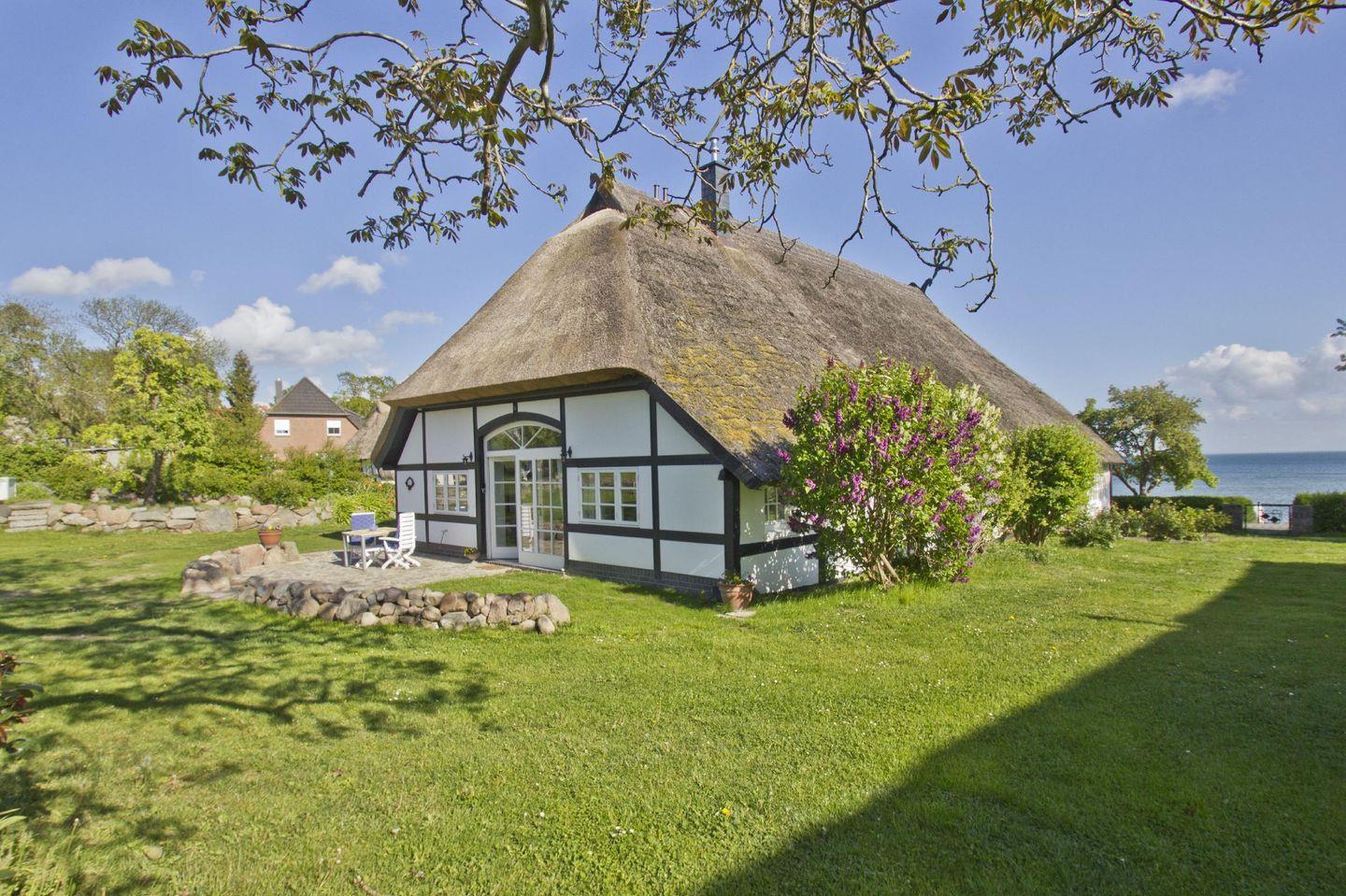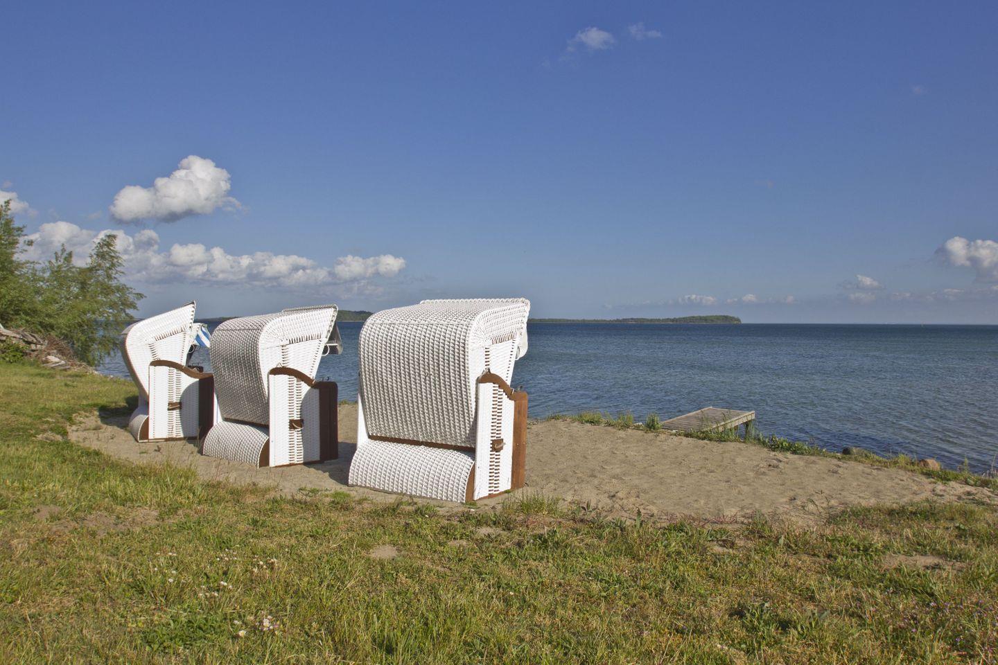 Das große Gartengrundstück grenzt auf der einen Seite an die malerischen Wiesen und Wälder der Rügener Naturlandschaft, auf der anderen Seite an die Küste des Boddens. Auf dem privaten Badezugang mit Liegewiese steht ein Strandkorb (saisonal von Mai bis Oktober) zur Verfügung.