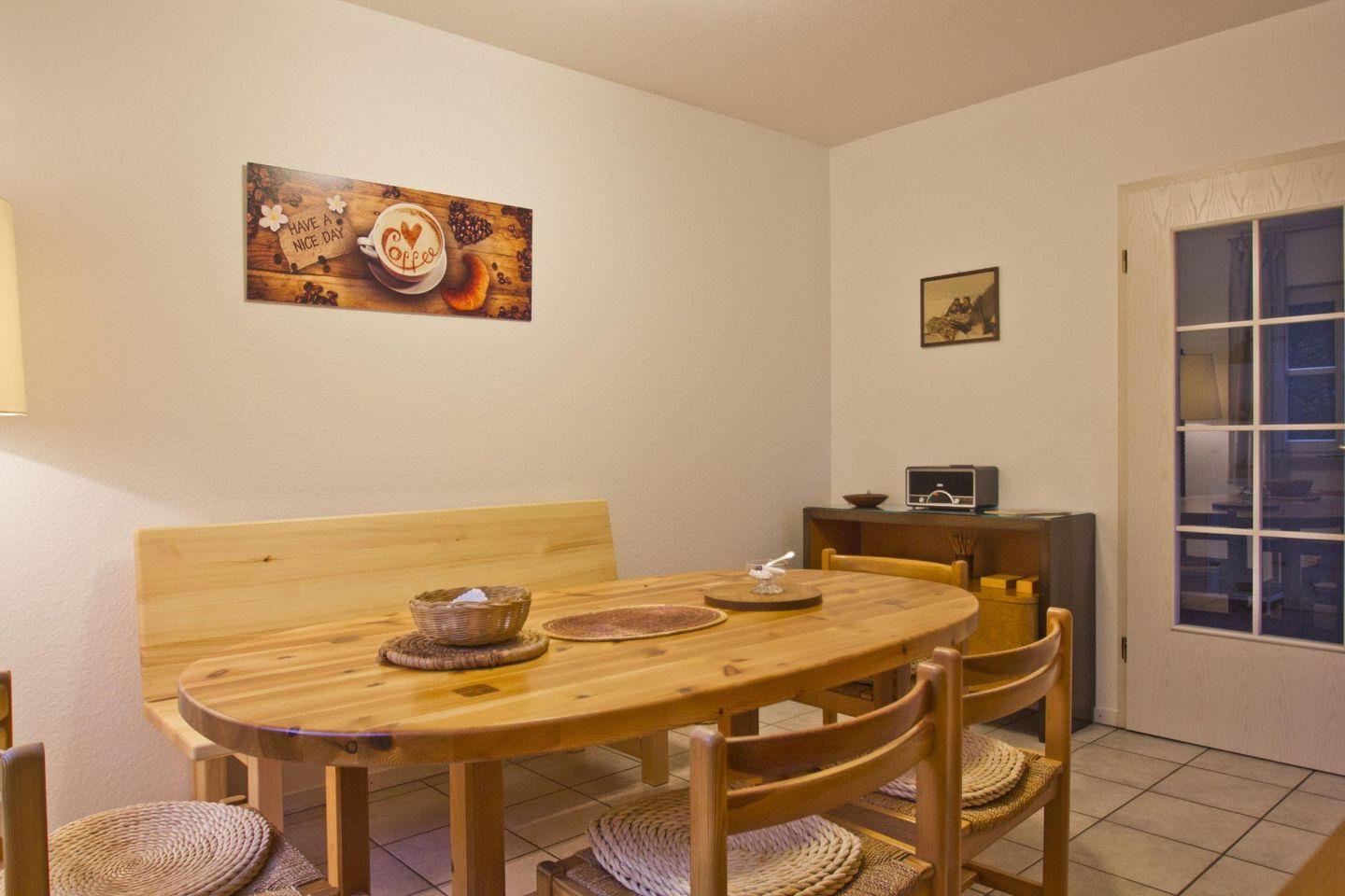 KÜCHE // separate Küche mit angrenzendem Esszimmer, 4-Felder Ceranherd, Kühlschrank mit Gefrierfach, Backofen, Toaster, Wasserkocher, Kaffeemaschine, reichlich Besteck, Geschirr und Küchenutensilien ++