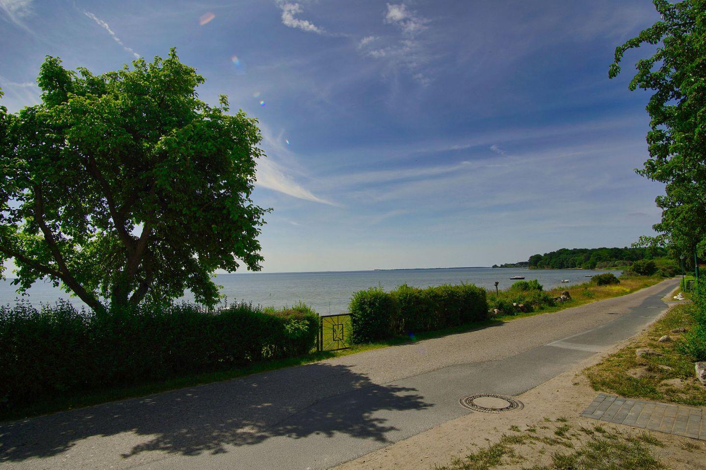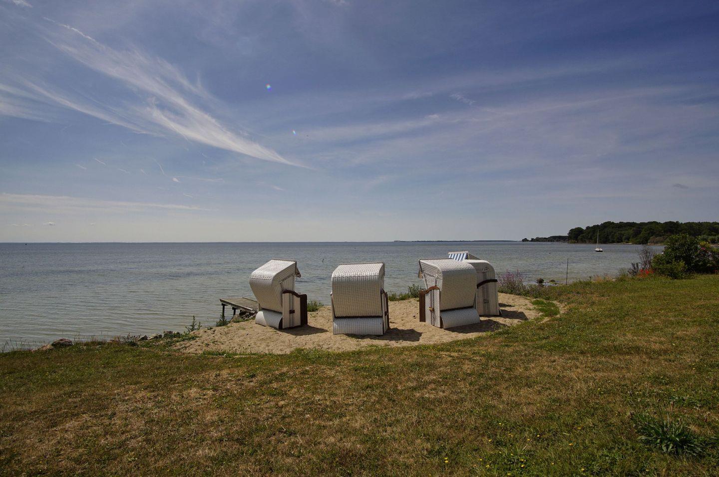 Das große Gartengrundstück grenzt auf der einen Seite an die malerischen Wiesen und Wälder der Rügener Naturlandschaft, auf der anderen Seite an die Küste des Boddens. Auf dem privaten Badezugang mit Liegewiese steht dem Ferienhaus ein eigener Strandkorb zur Verfügung.