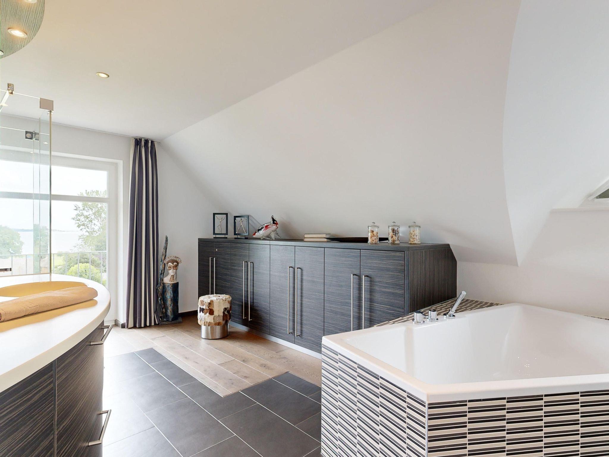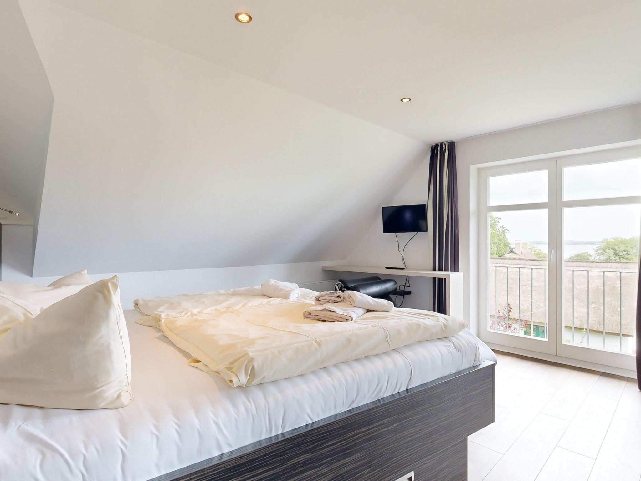 1 großes Schlafzimmer (32 m²) mit einem Doppelbett und Meerblick, Sat-TV, integrierte Badewanne, Dusche