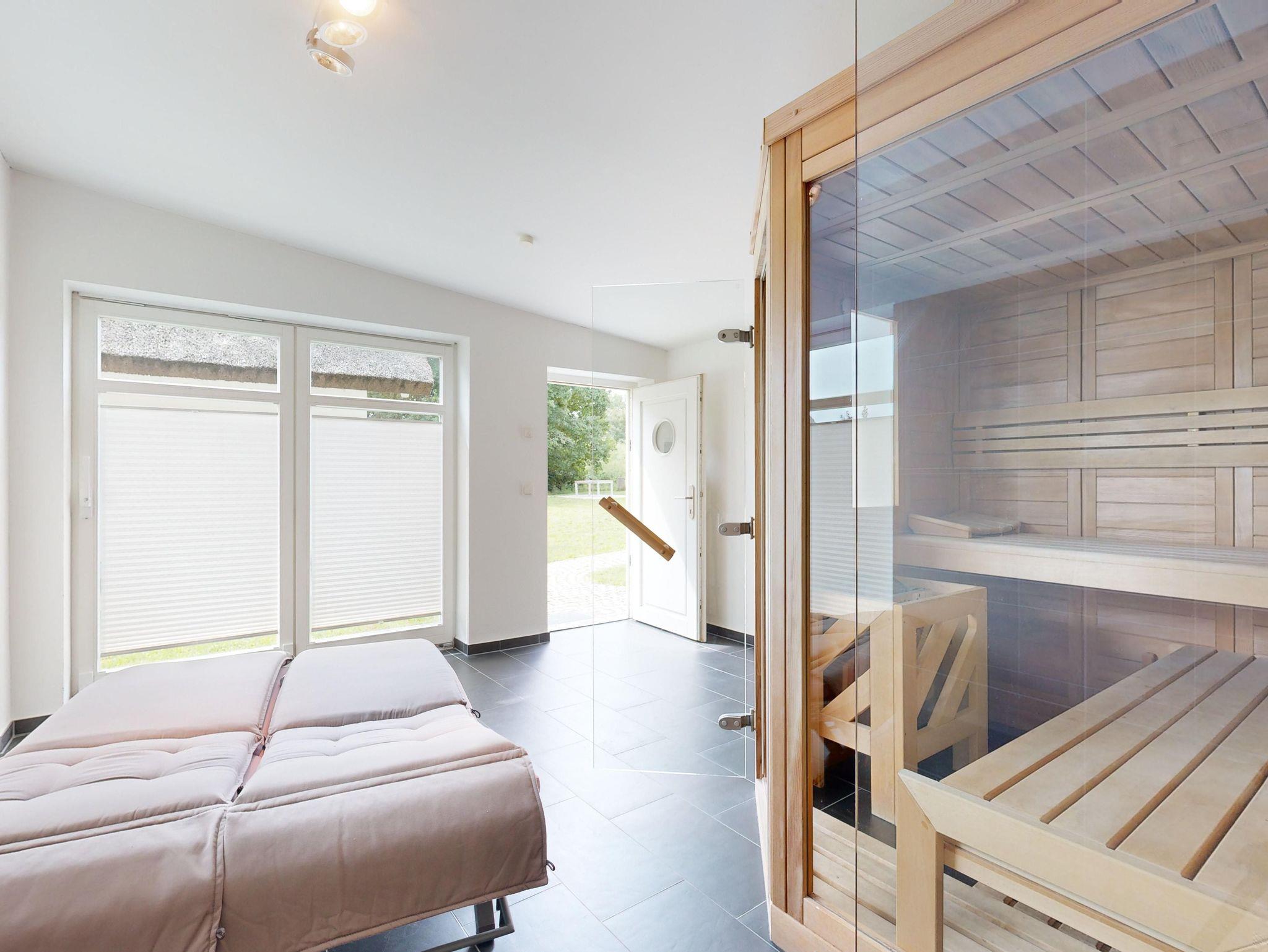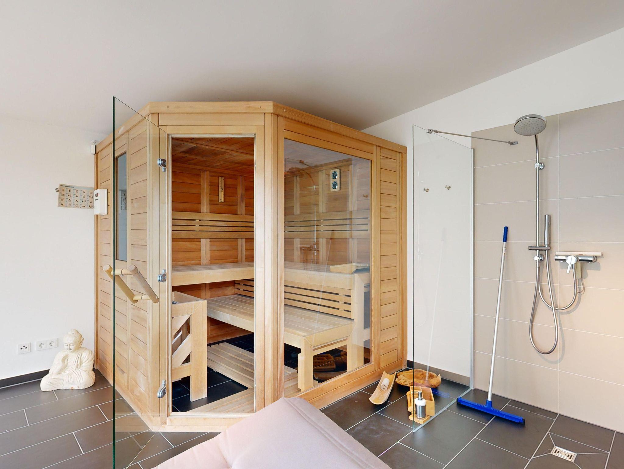 Nebengebäude mit Saunabereich (ca. 20 m²), Duschen und Liegen, Fahrradabstellraum