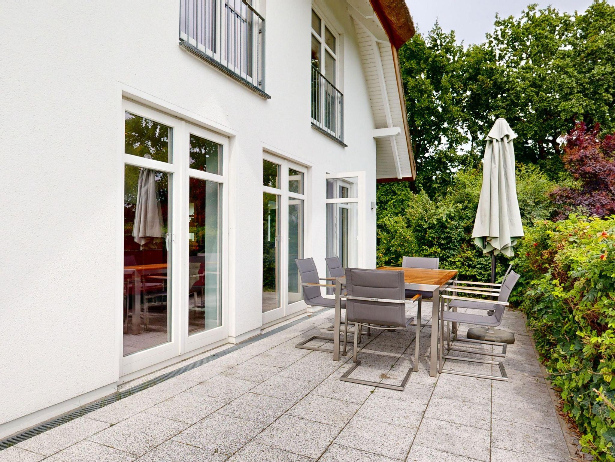 große Süd-Terrasse mit Meerblick und Gartenmöbeln