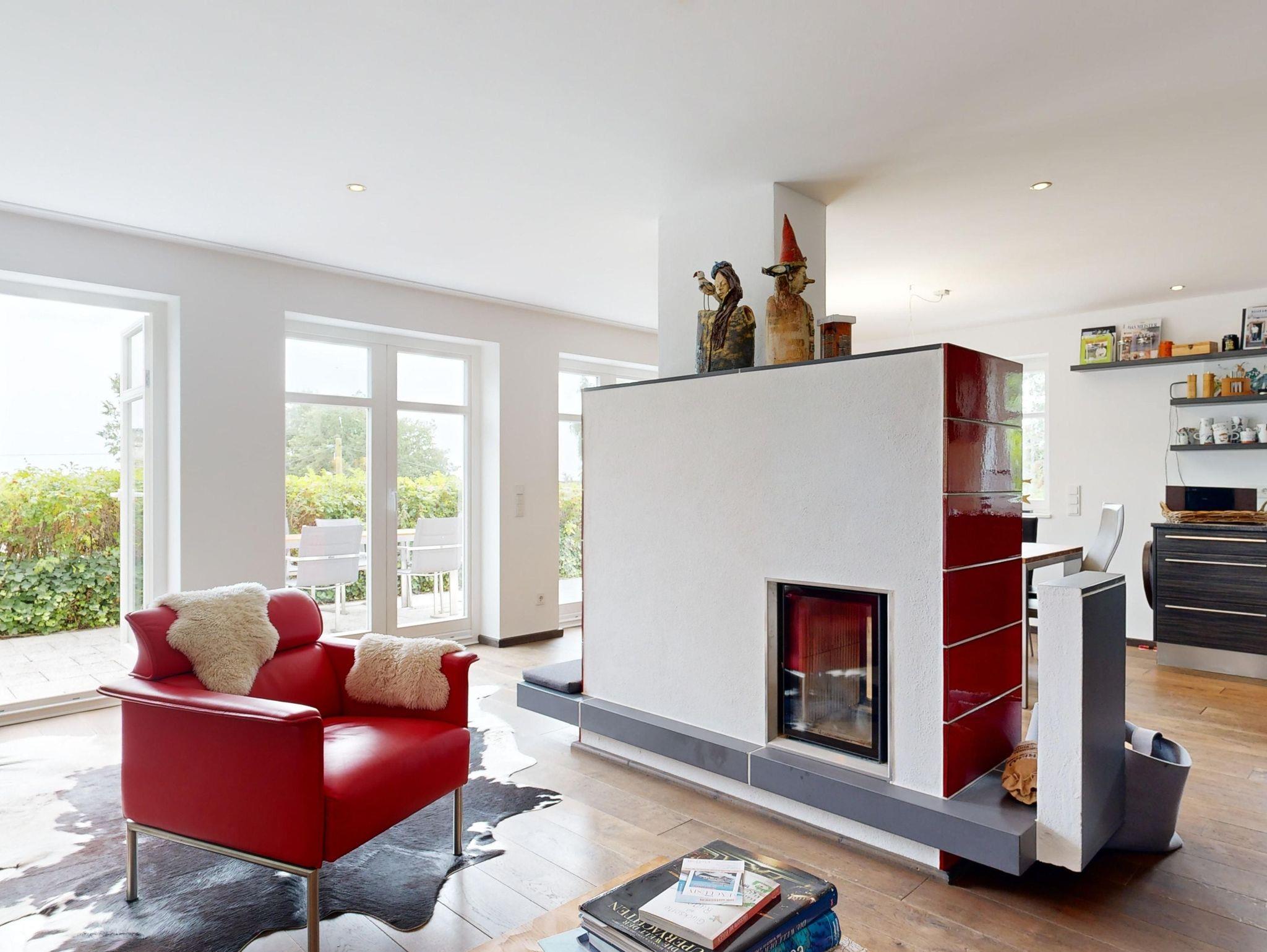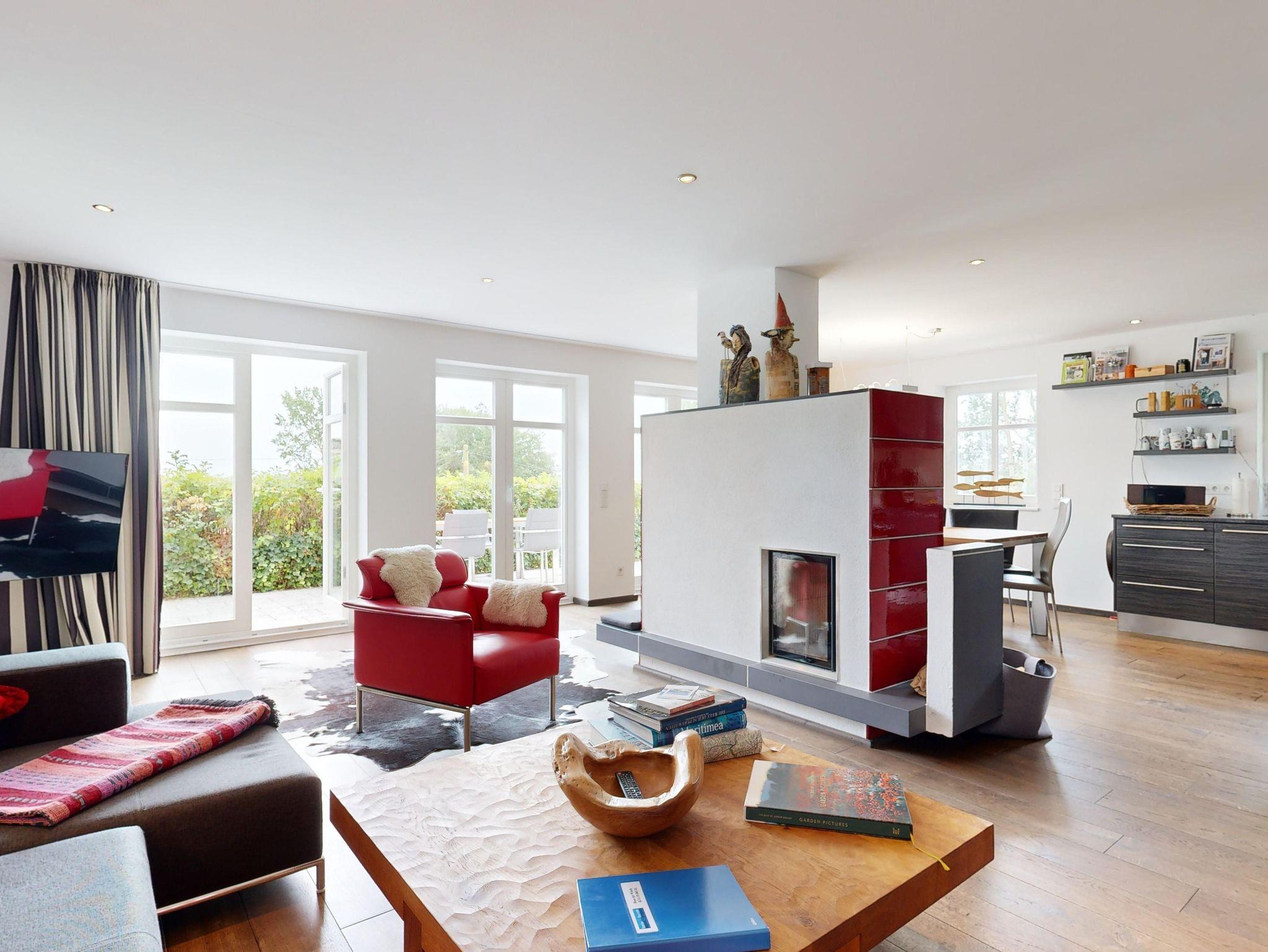 Großer, heller Wohnbereich (58 m²) mit Couchecke, Sat-TV, Kamin, Esstisch und Küchenbereich (Spülmaschine, Herd, Gefrierkombi, Wasserkocher, Kaffeemaschine, Toaster)