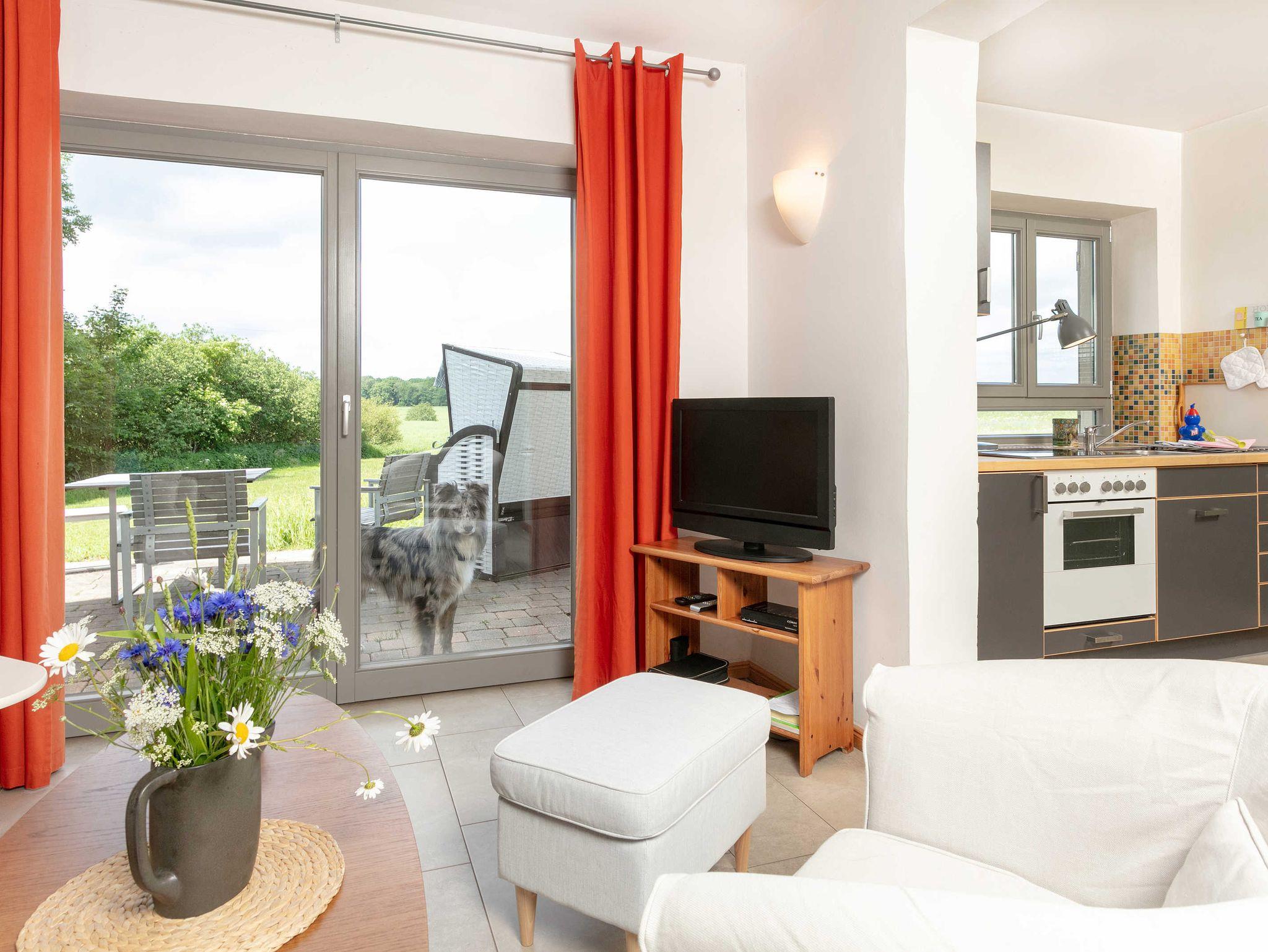 Separater Eingang, kleiner Flur, Wohn-/Eßzimmer mit gemütlicher Sitzecke (Aufbettung für 1 Person) , SAT-TV, integrierter Küchenzeile mit diverser Ausstattung, Bad mit Dusche/WC/Waschbecken, 1 Schlafzimmer mit Doppelbett , Fußbodenheizung. Die Wohnung ist behindertenfreundlich (breite Türen etc.).