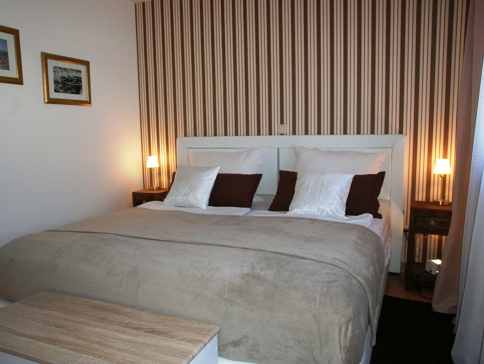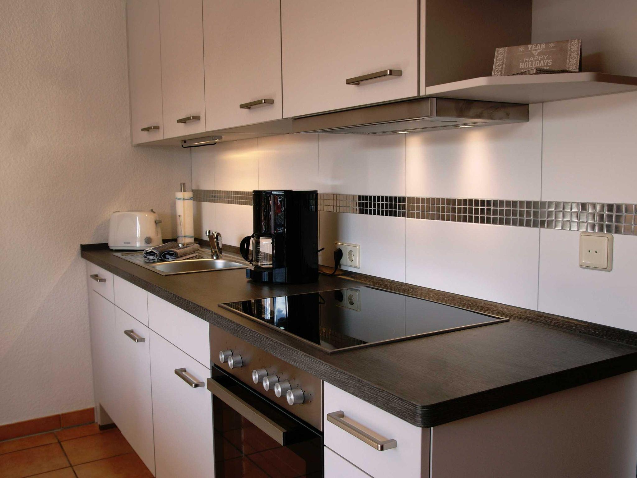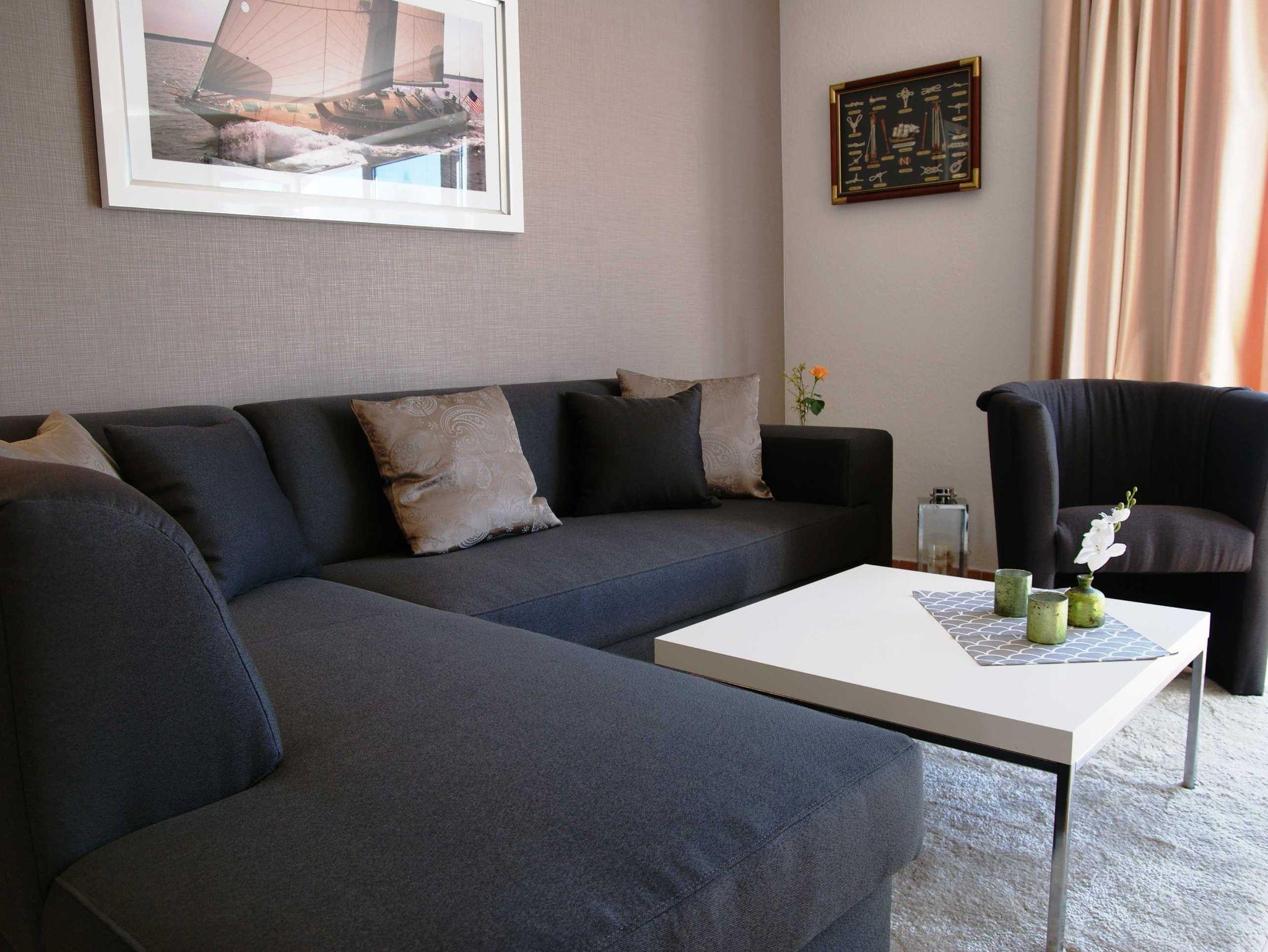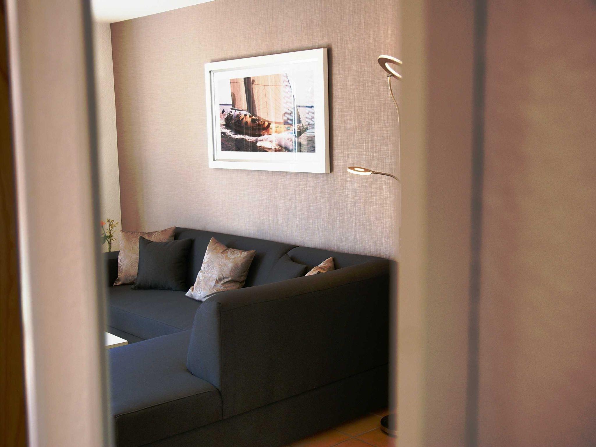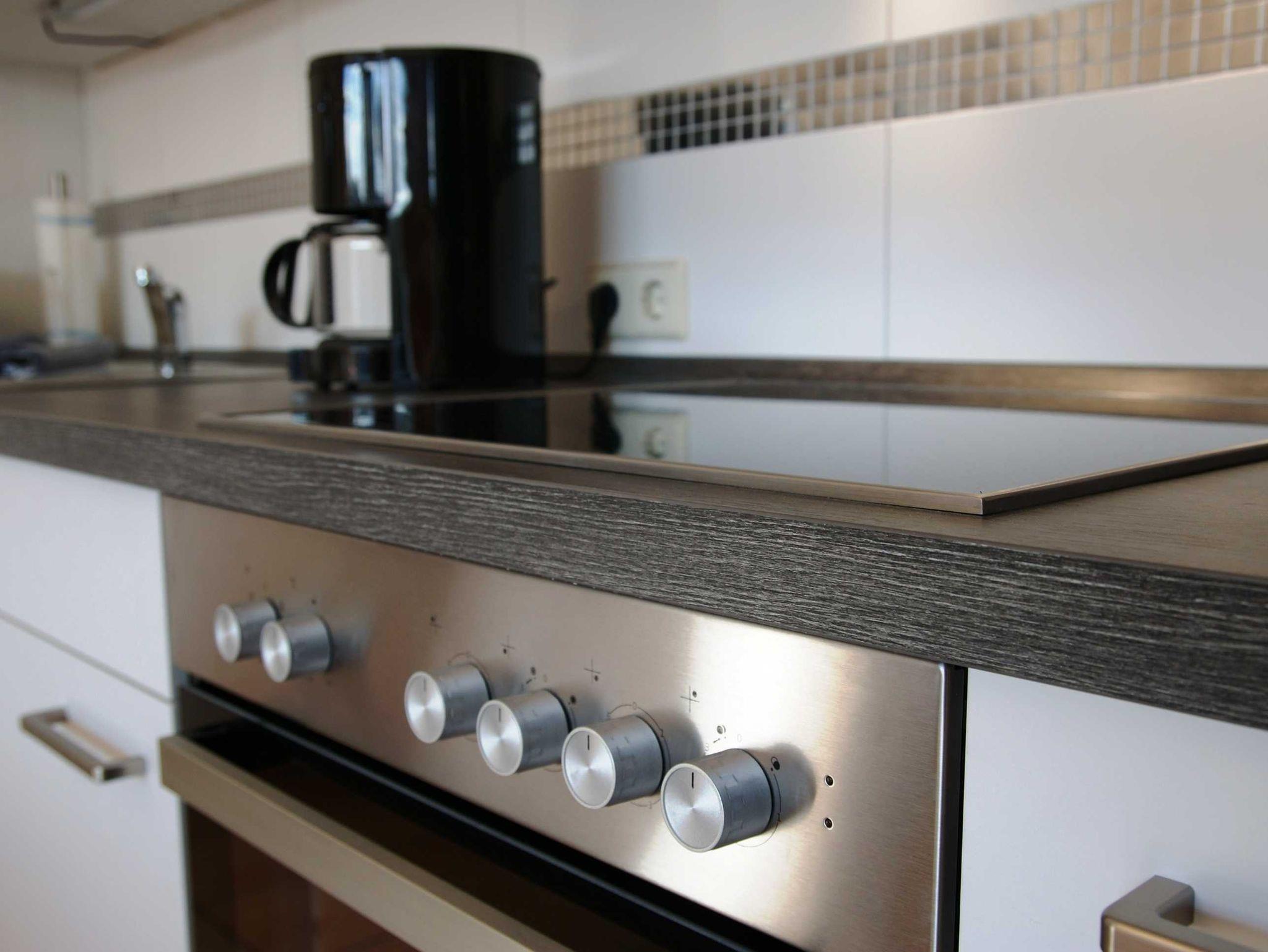 2 Raumapartment mit Balkon , Doppelbett im Schlafzimmer und Schlafcouch im Wohnzimmer sowie einer gut ausgestatteten Küchenzeile mit Geschirrspüler und Backofen . Kaffemaschine und Toaster sind vorhanden. Kinderbett und Hochstuhl für die kleinsten bitte vorbestellen .