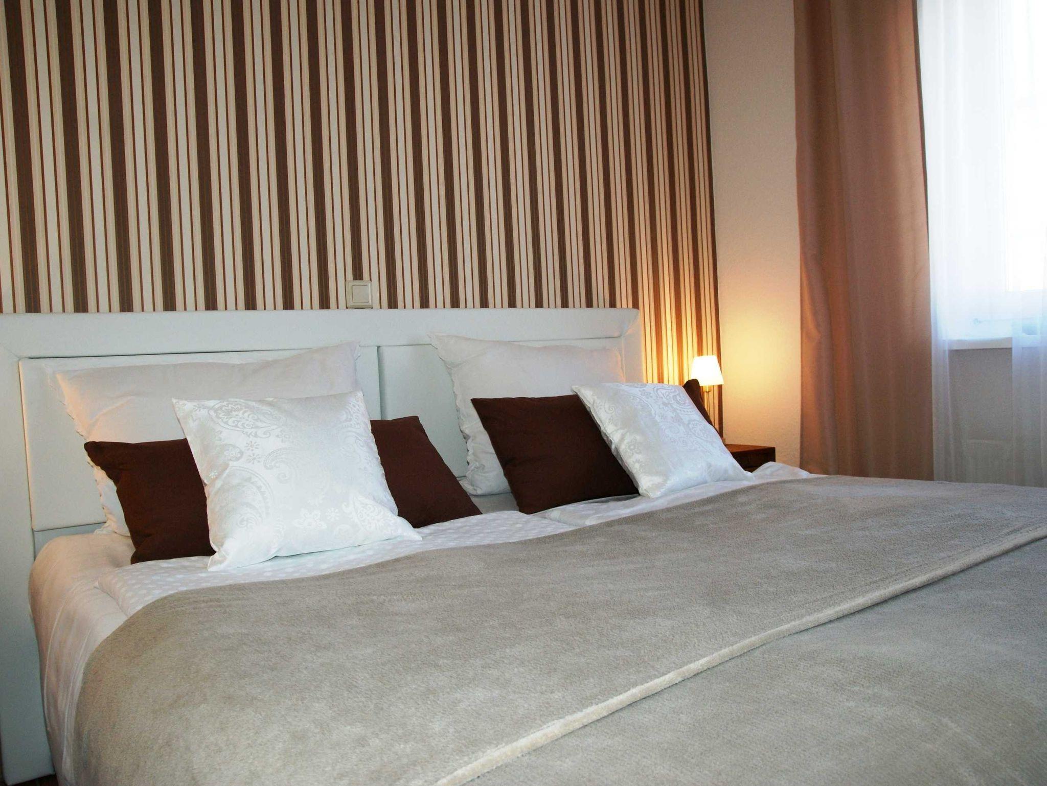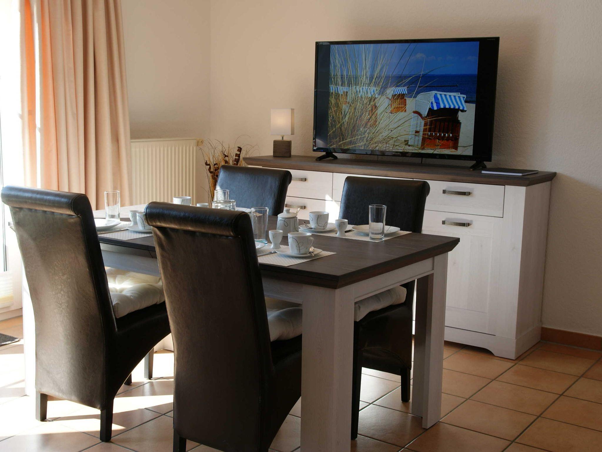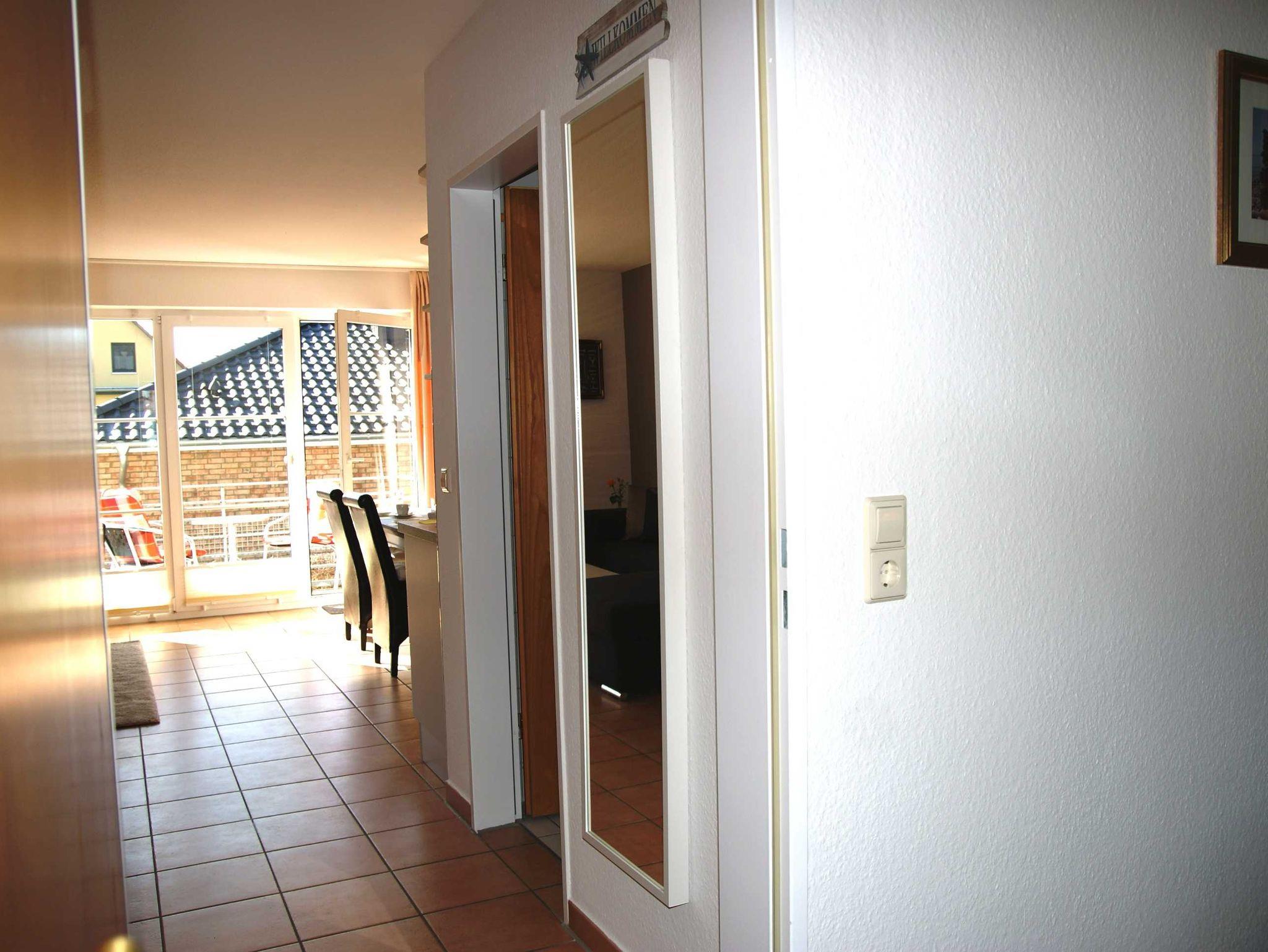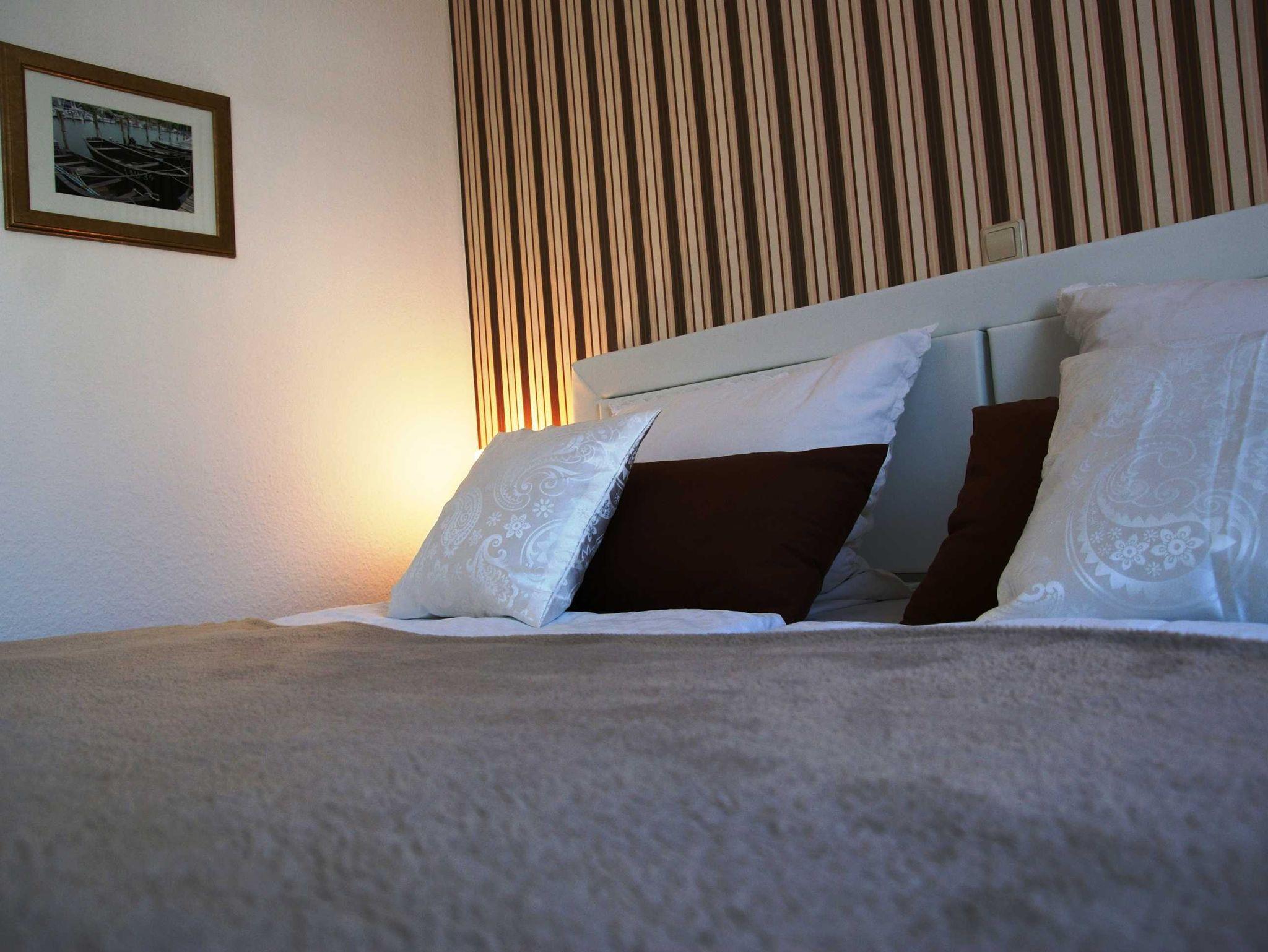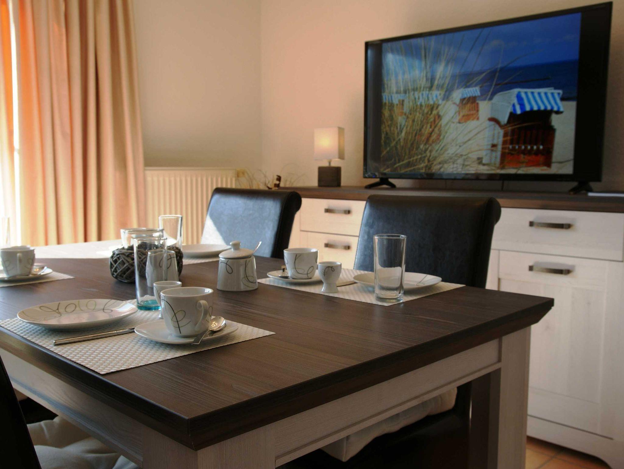 2 Raumapartment mit Balkon , Doppelbett im Schlafzimmer und Schlafcouch im Wohnzimmer sowie einer gut ausgestatteten Küchenzeile mit Geschirrspüler und Backofen . Kaffemaschine und Toaster sind vorhanden. Kinderbett und Hochstuhl für die kleinsten bitte vorbestellen .