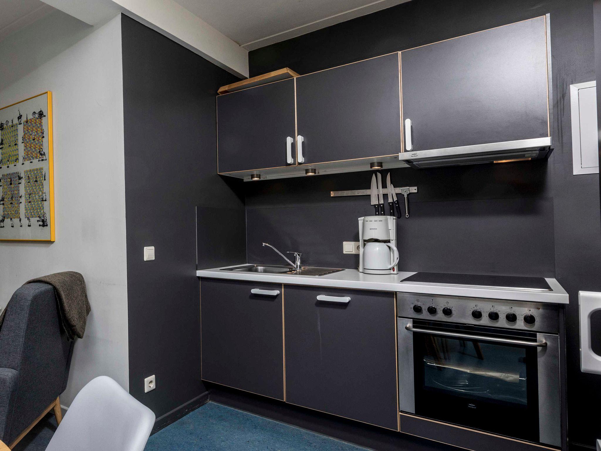 Ausstattung der Küche: 4-Zonen-Kochfeld, Backofen, Geschirrspüler, Filterkaffeemaschine, Wasserkocher, Toaster, Geschirr, Besteck, Pfannen und Töpfe.