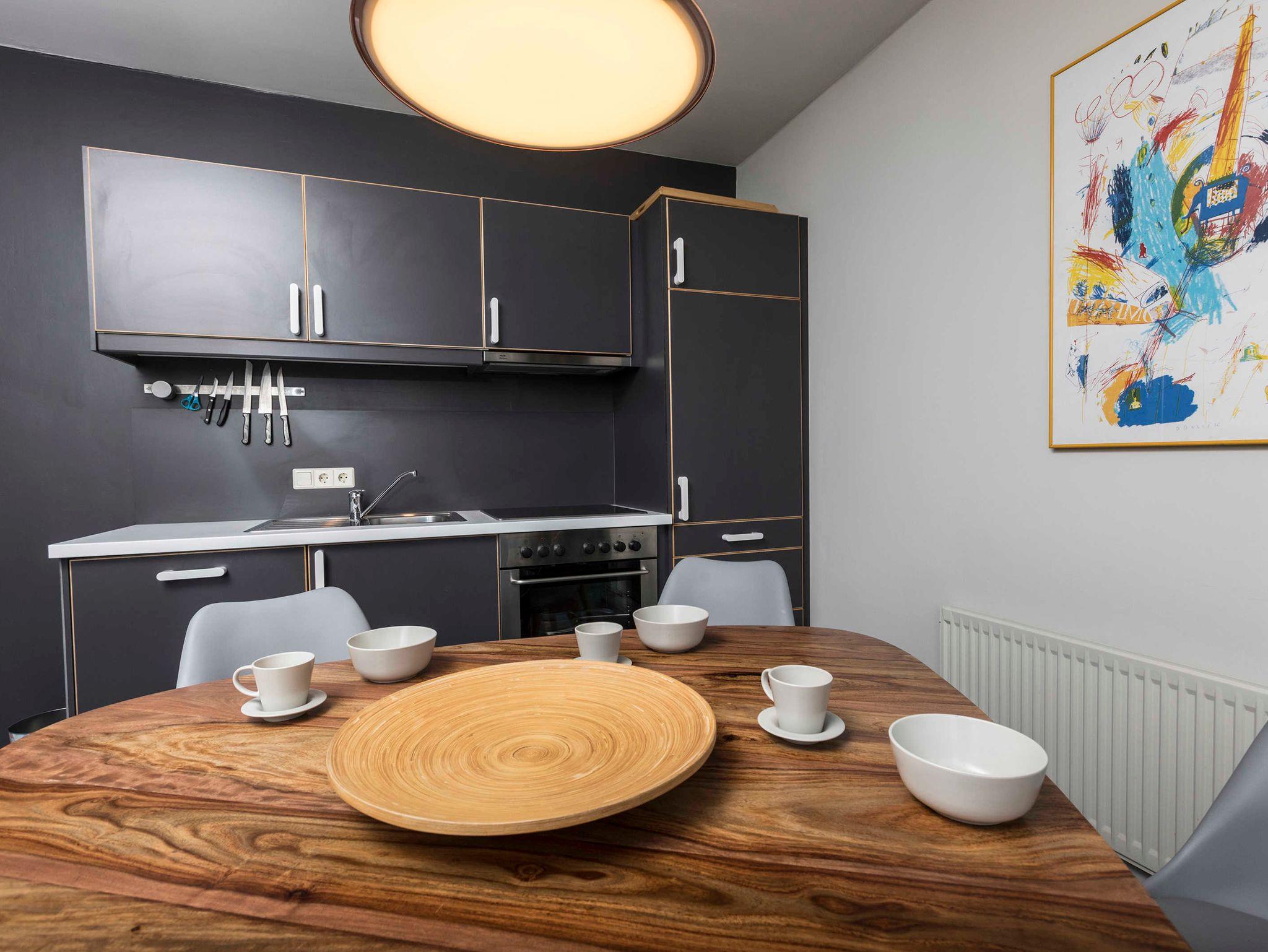 Ausstattung der Küche: 4-Zonen-Kochfeld, Backofen, Geschirrspüler, Filterkaffeemaschine, Wasserkocher, Toaster, Geschirr, Besteck, Pfannen und Töpfe.