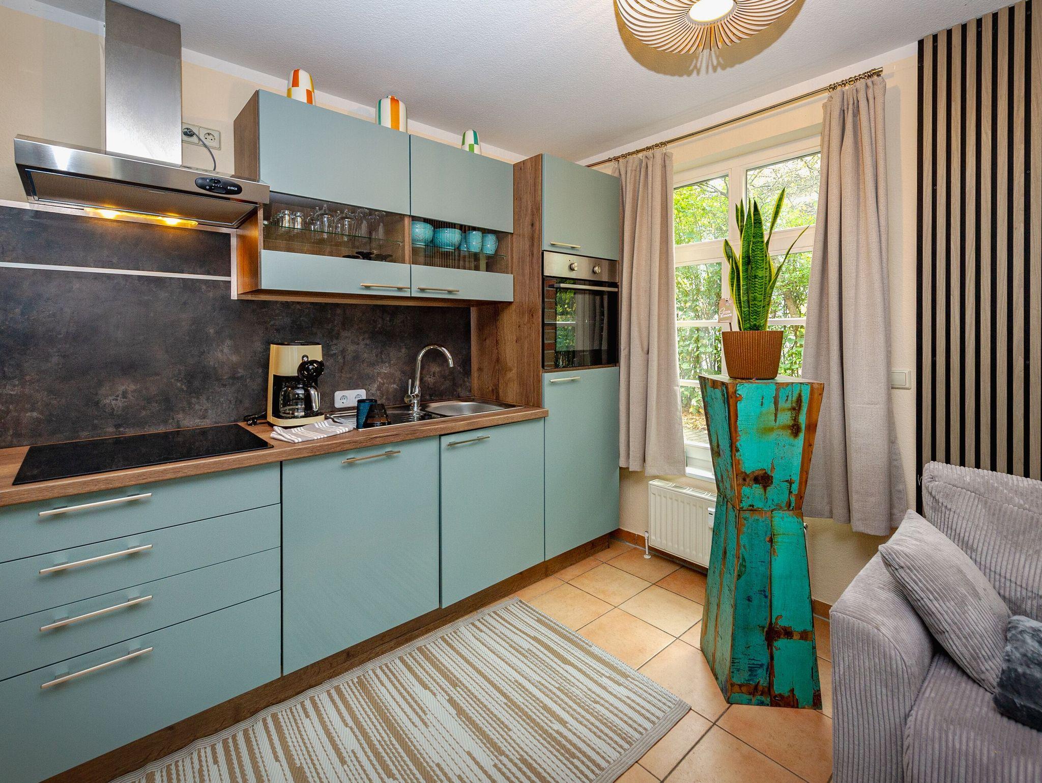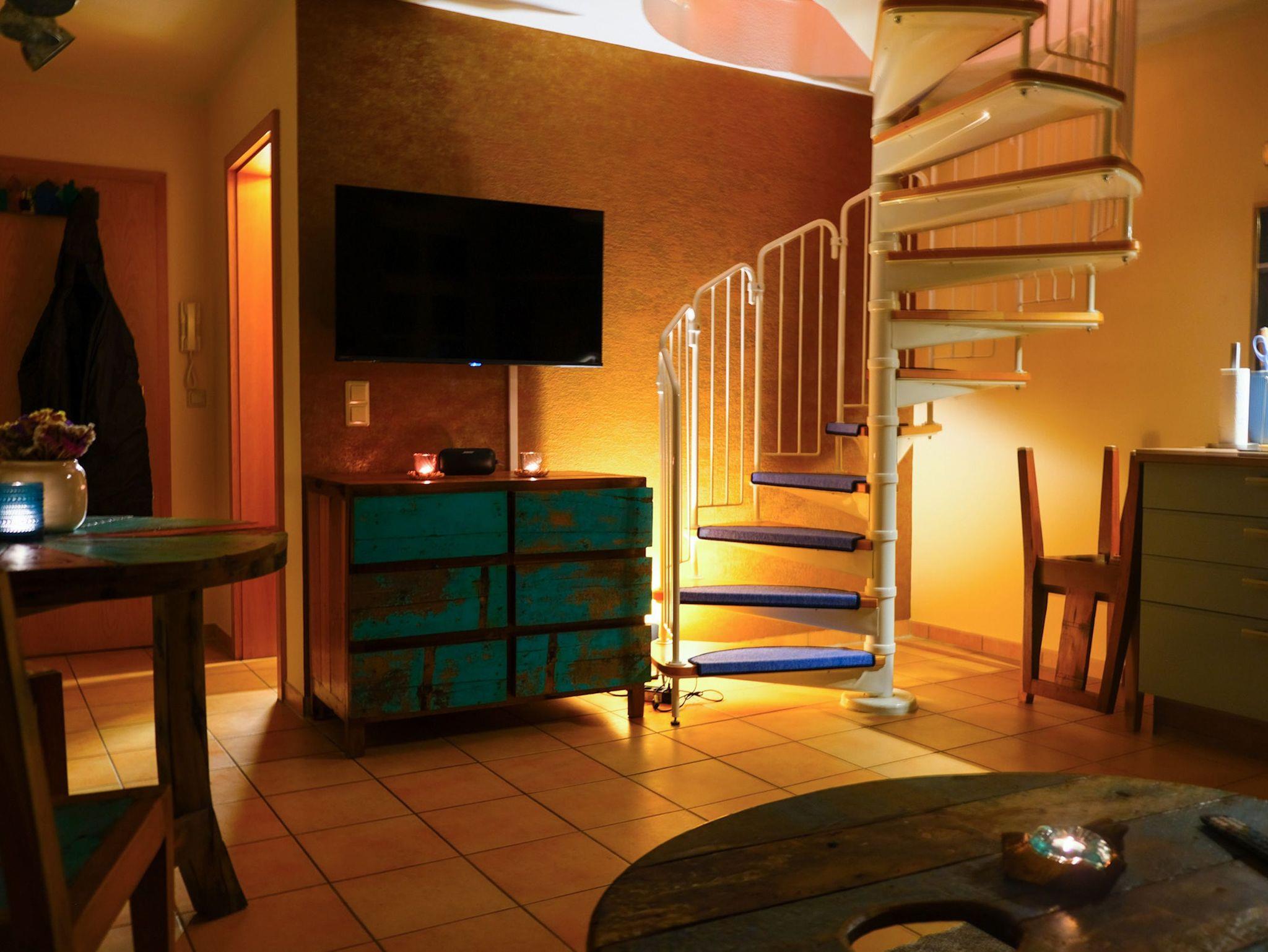 Im Erdgeschoss Ihres Urlaubsdomizils befindet sich das Wohnzimmer mit integrierter Küche, Esstisch, einer bequemen Couch (Aufbettungsmöglichkeit für zwei Personen) und einem großen Smart-TV. Machen Sie es sich bequem, genießen Sie Ihre Lieblings-Sendung, lesen Sie mal wieder ein gutes Buch oder surfen Sie im Internet. W-LAN ist kostenfrei verfügbar.