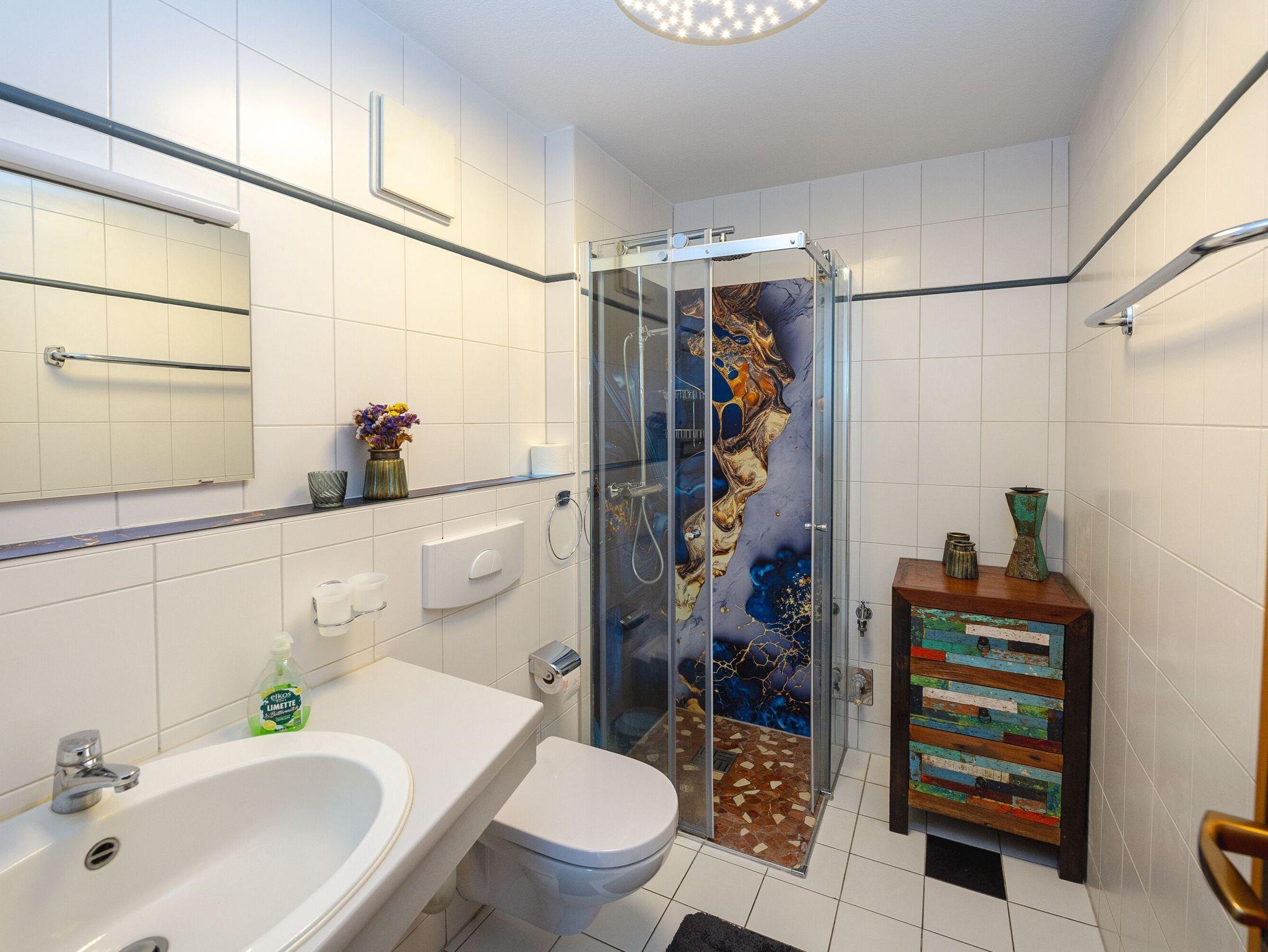 Auch das Badezimmer befindet sich im Erdgeschoss. Es ist mit einer ebenerdigen Regendusche, einem WC sowie einem Waschtisch mit Spiegel und Fön ausgestattet.