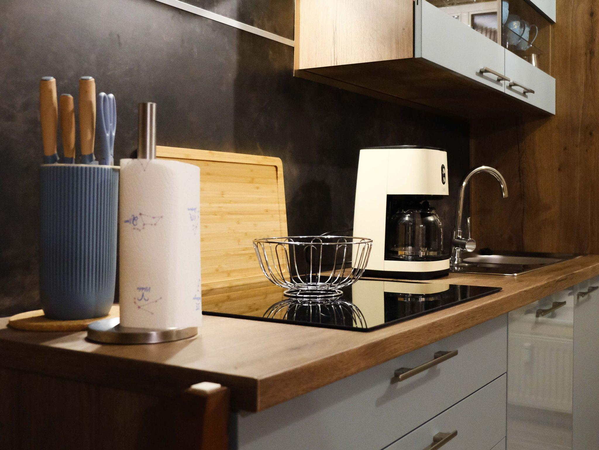 Die hochwertige Einbauküche sieht nicht nur chic aus, sondern ist perfekt ausgestattet. Sie finden hier u.a. ein Induktionskochfeld mit Dunstabzugshaube, einen Backofen in Komforthöhe, eine Spülmaschine und einen Kühlschrank mit Frostfach. Selbstverständlich gibt es auch eine Kaffeemaschine, einen Wasserkocher, einen Toaster und das nötige Koch- und Essgeschirr.