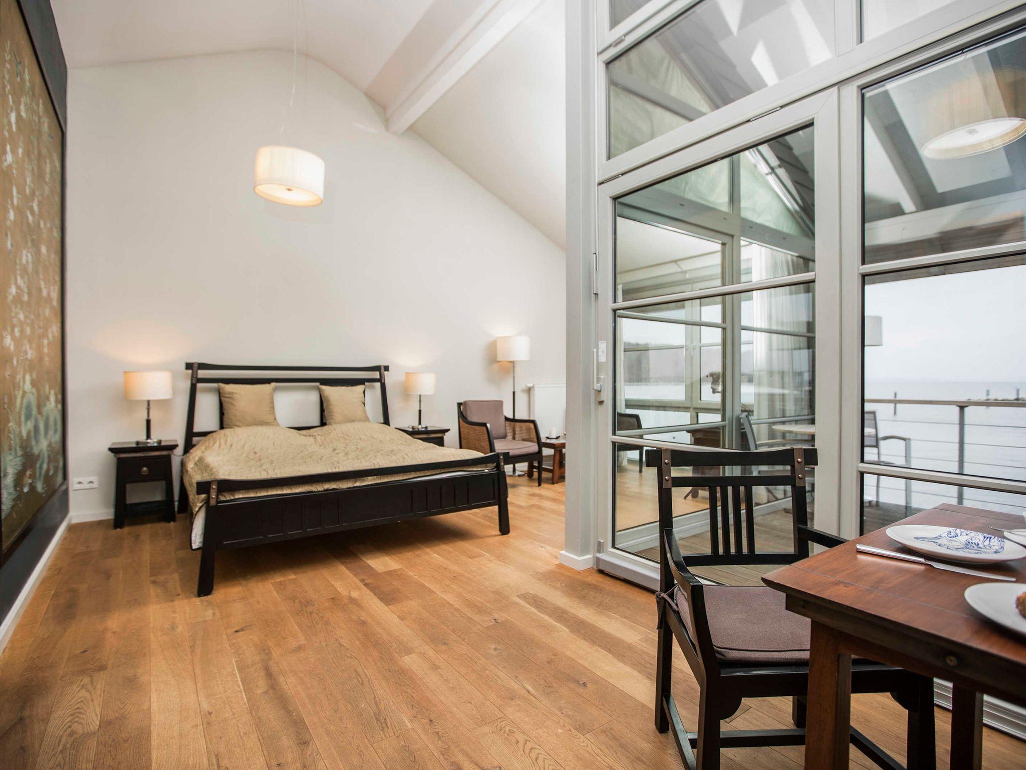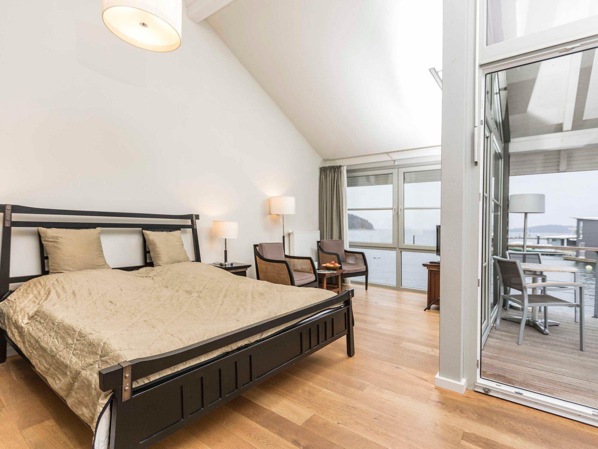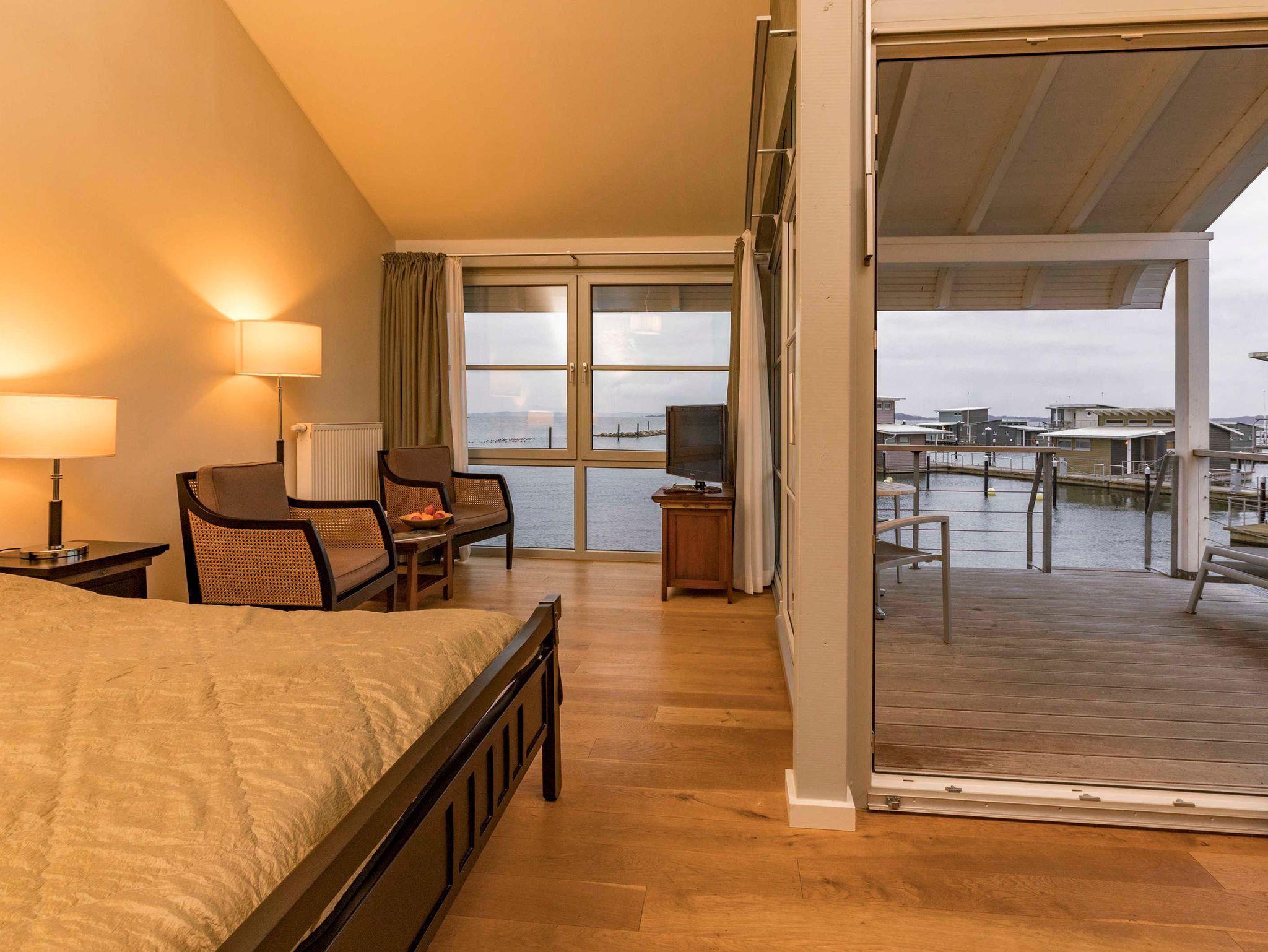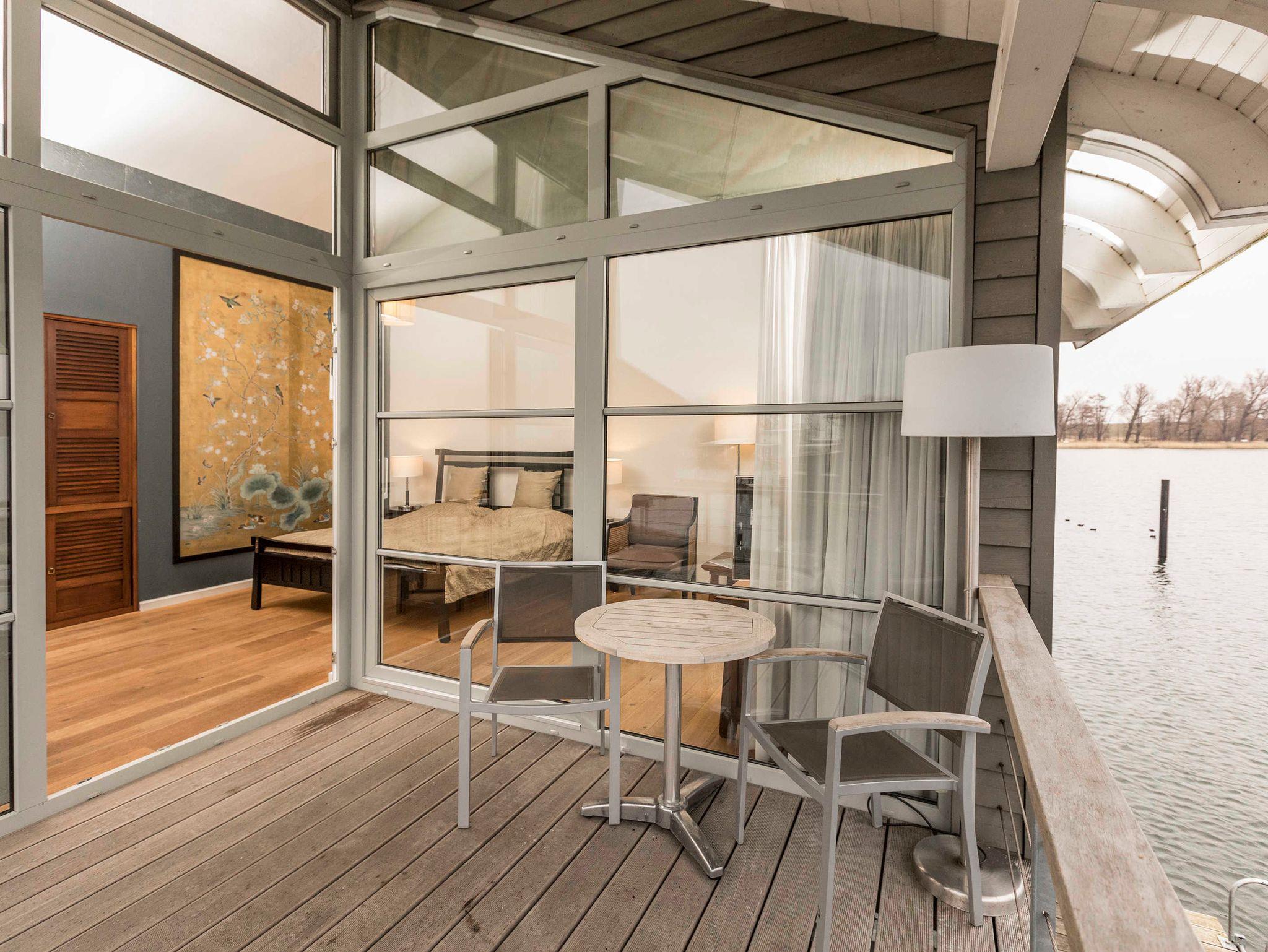Ein Wohn-Schlafraum, Pantryküche, möblierte überdachte Terrasse und extra Badesteg, Sat-TV, Musikanlage, Bad mit Dusche und WC. Ausstattung der Küche: 2-Zonen-Kochfeld, Kombi-Mikrowelle, Nespresso-Kaffeeemaschine, Wasserkocher, Toaster, Geschirr, Besteck, Pfanne und Töpfe.