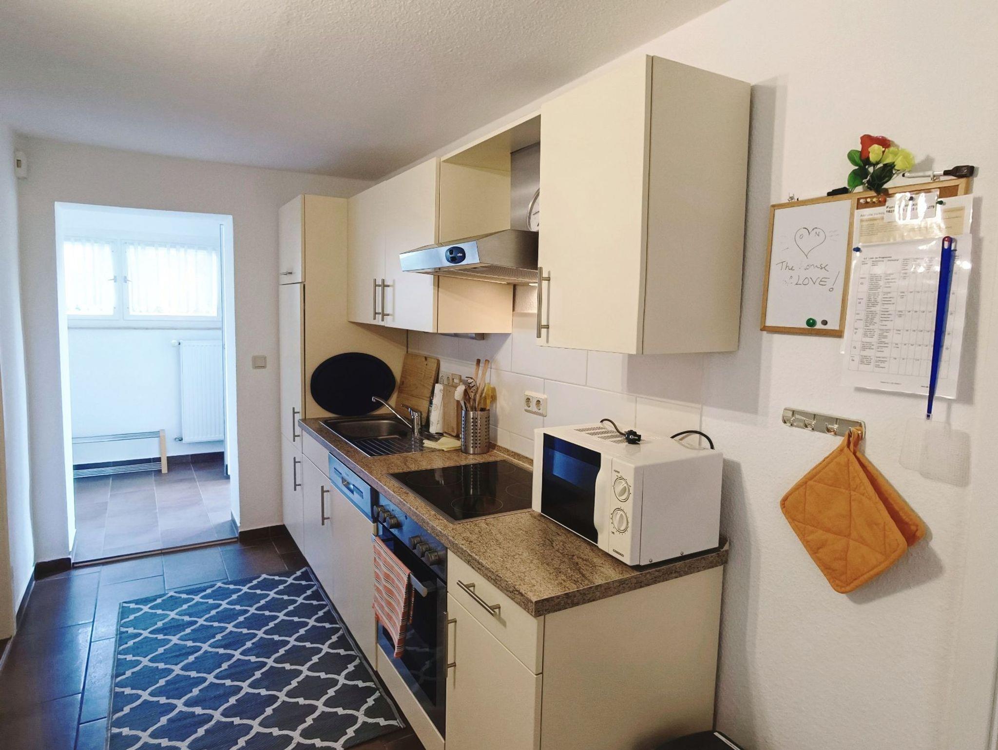moderne Einbauküche mit u. a. Backofen, Geschirrspüler, Kühlschrank mit Gefrierfach, Kaffeemaschine, Wasserkocher, Toaster etc.