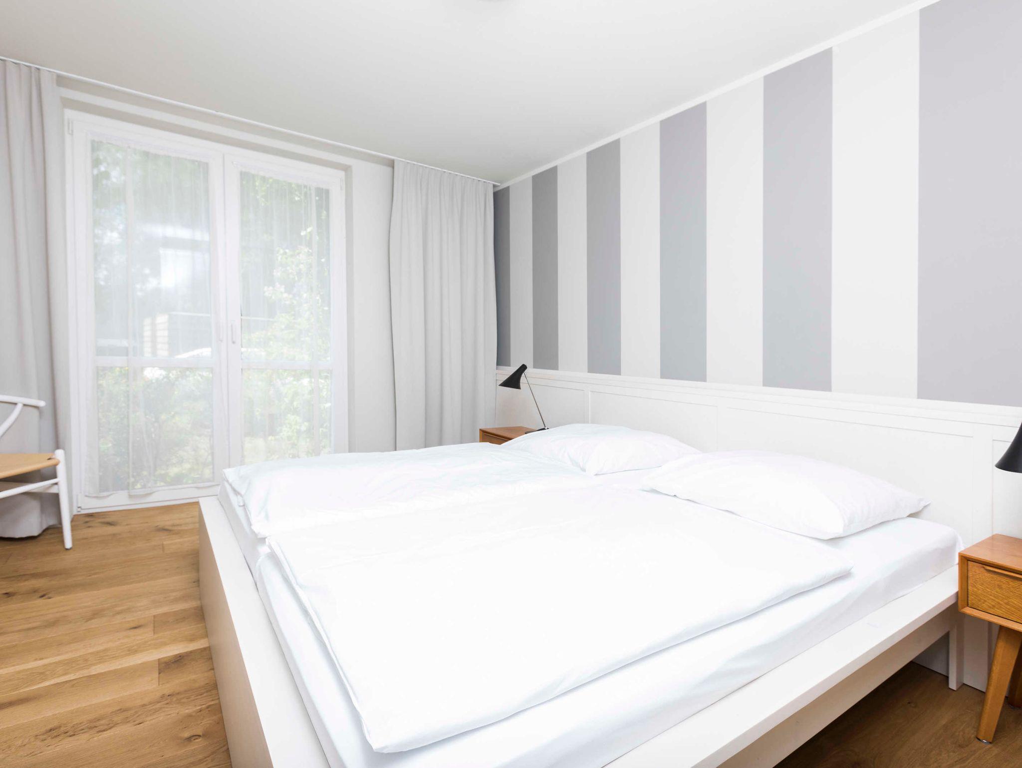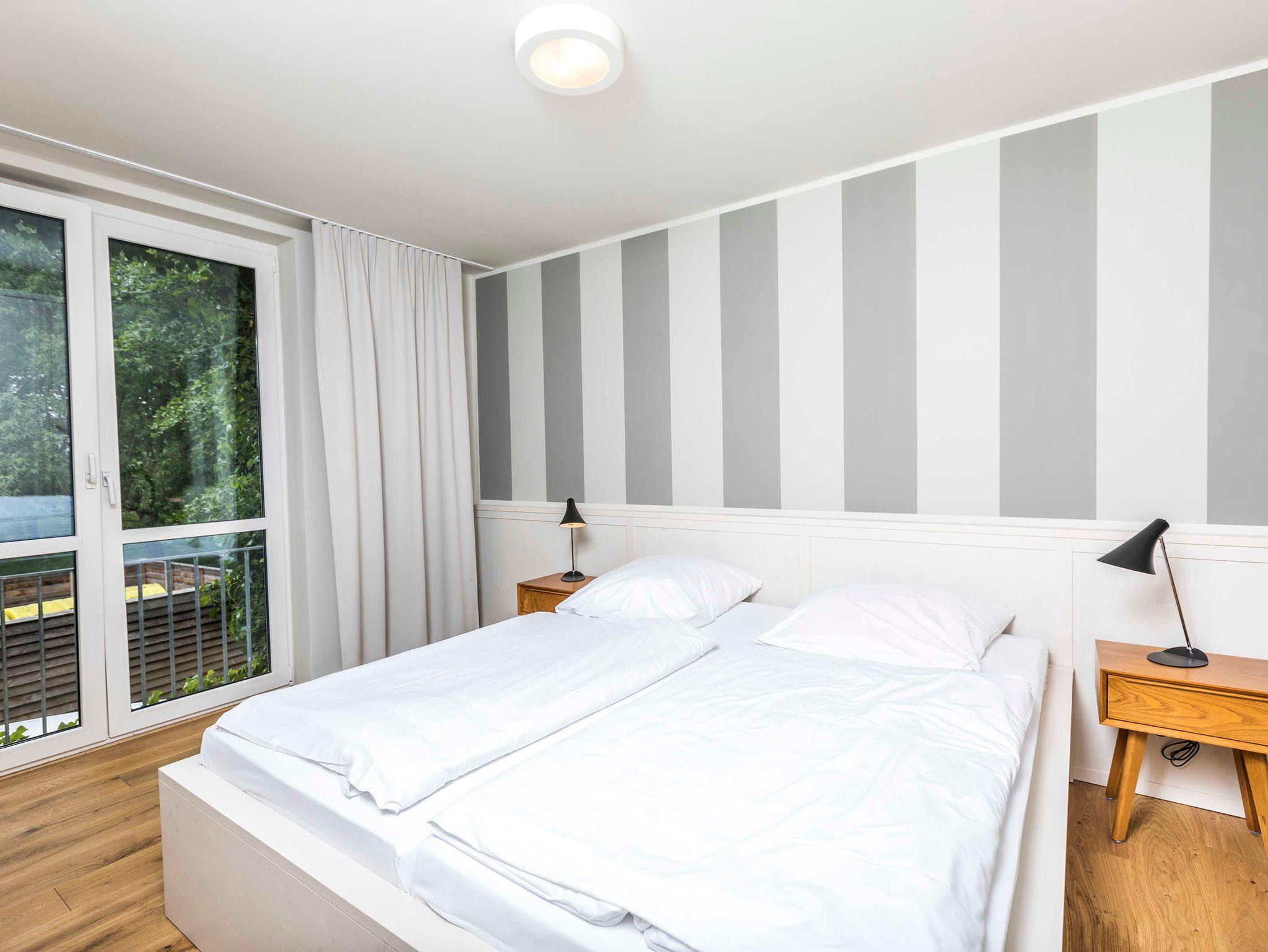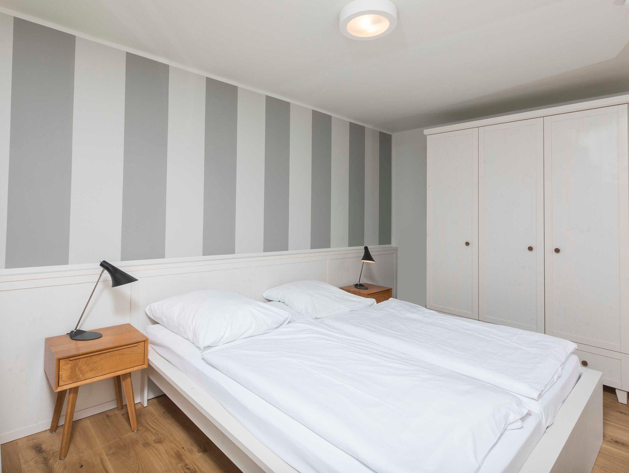 Zwei Schlafräume mit Doppelbetten und ein Wohnraum mit Aufbettung für zwei Personen (Schlafcouch), Küchenzeile, SAT-TV, Musikanlage, Bad mit WC und Dusche, Balkon oder Terrasse.