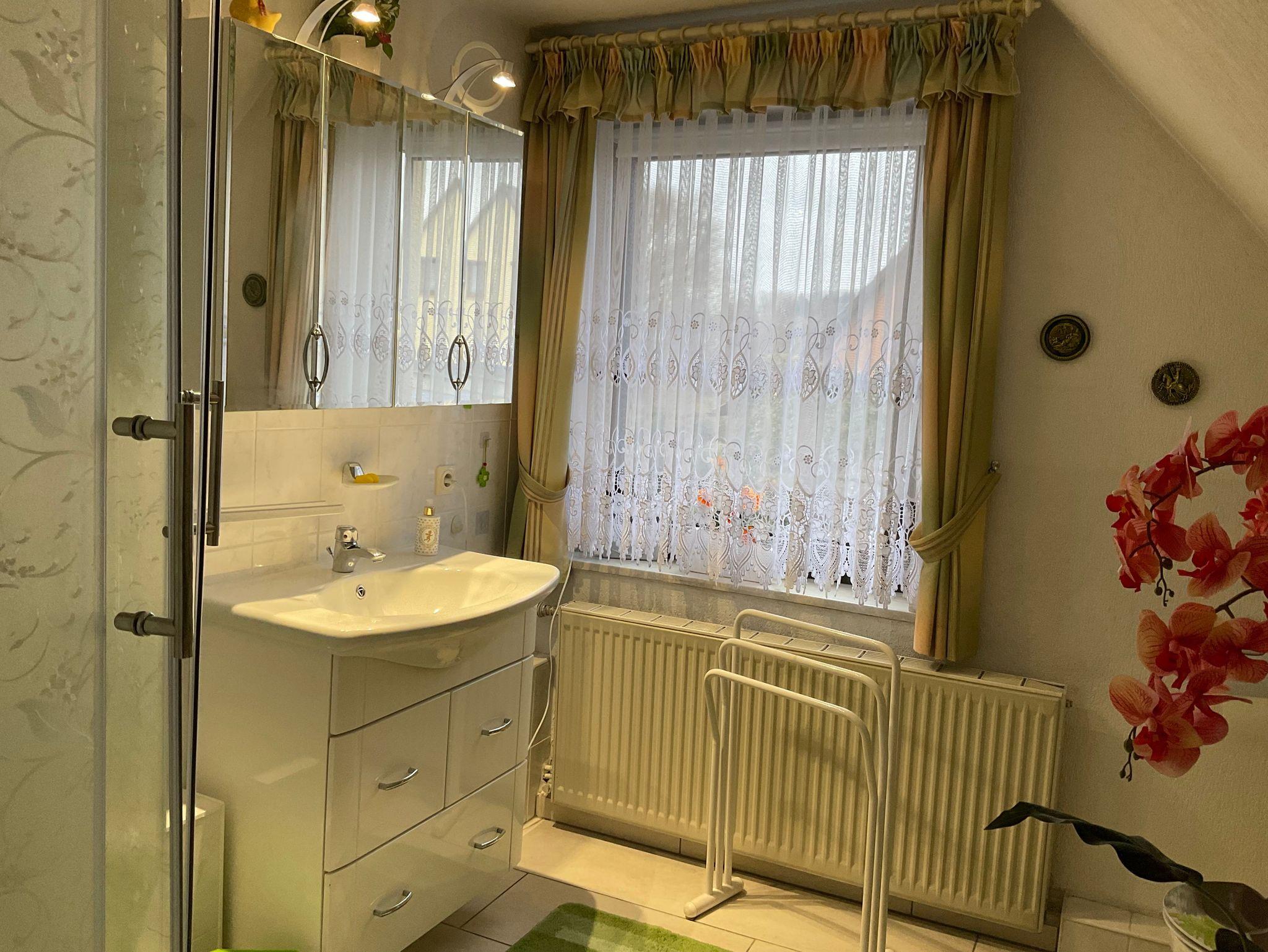 Die ca. 50 m² große Ferienwohnung im Obergeschoß bietet 2 Personen ausreichend Platz. Sie besteht aus einem Wohnraum mit Sitzgruppe dem Schlafraum mit dem Doppelbett. Die Küche ist in einem sep. Raum. Bad mit Dusche und WC.